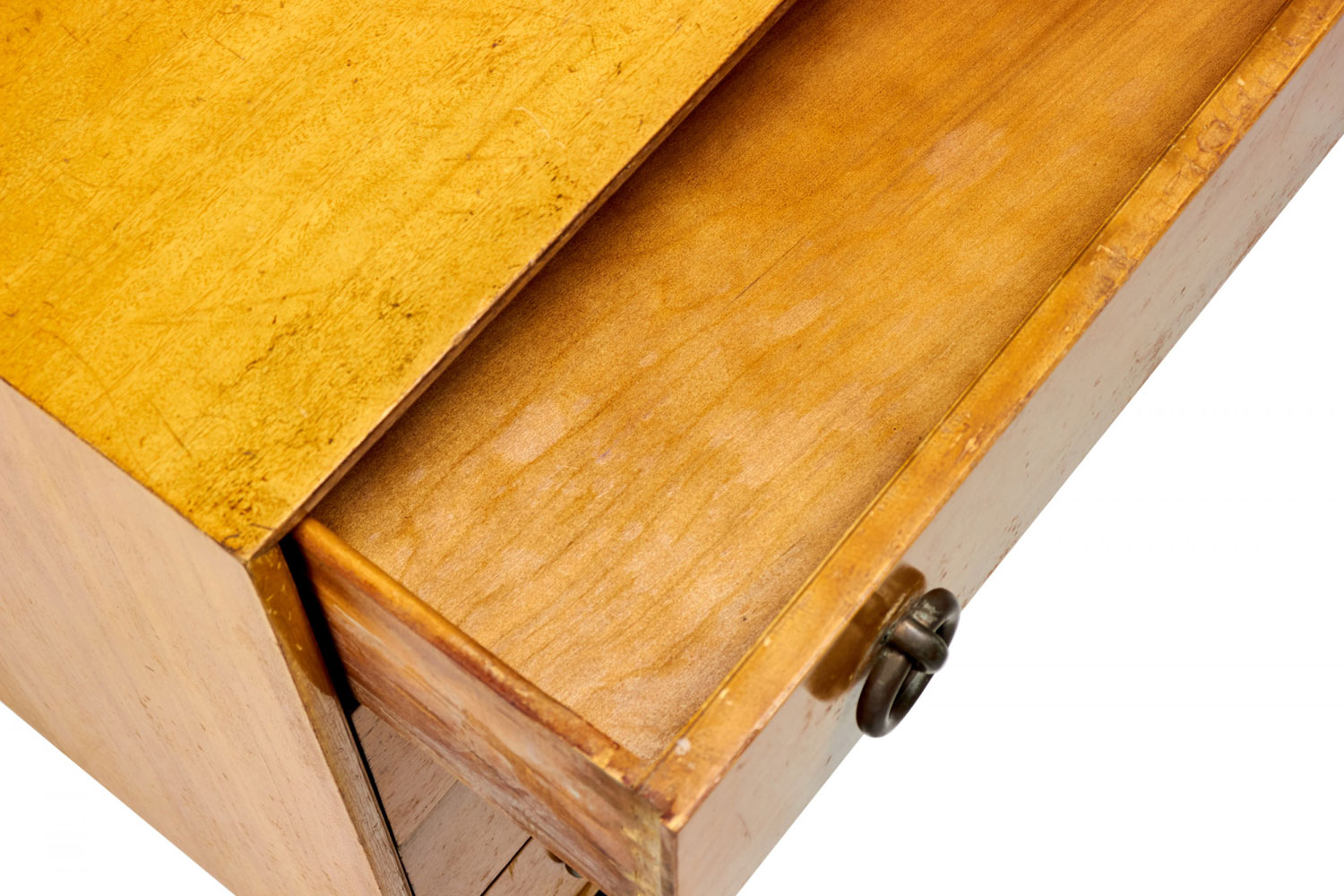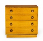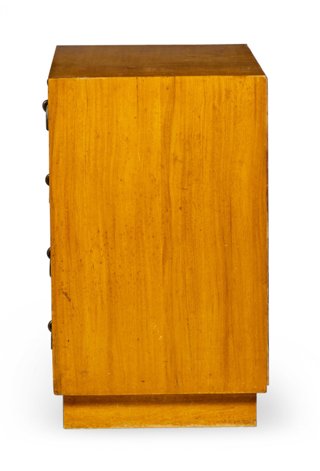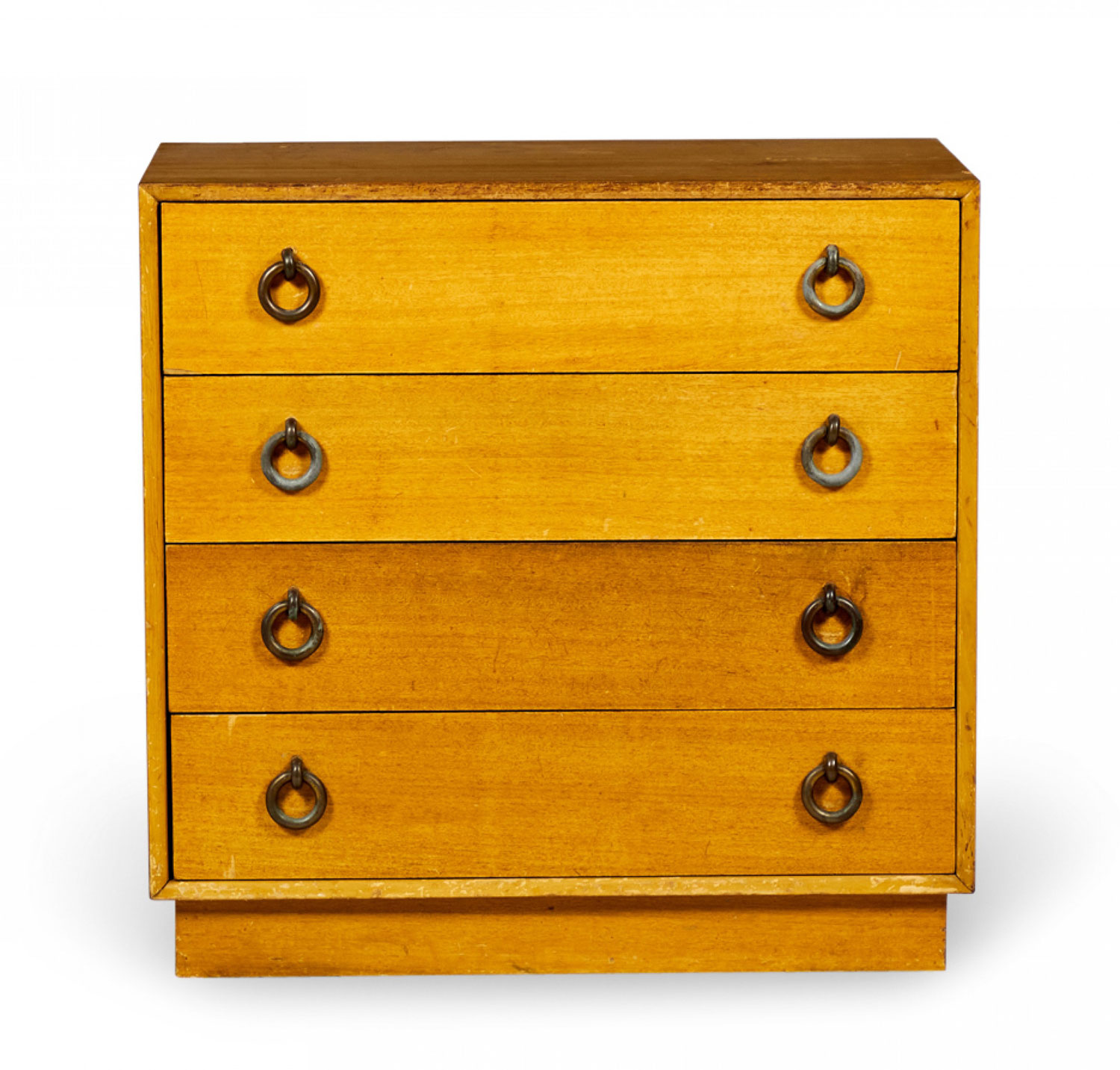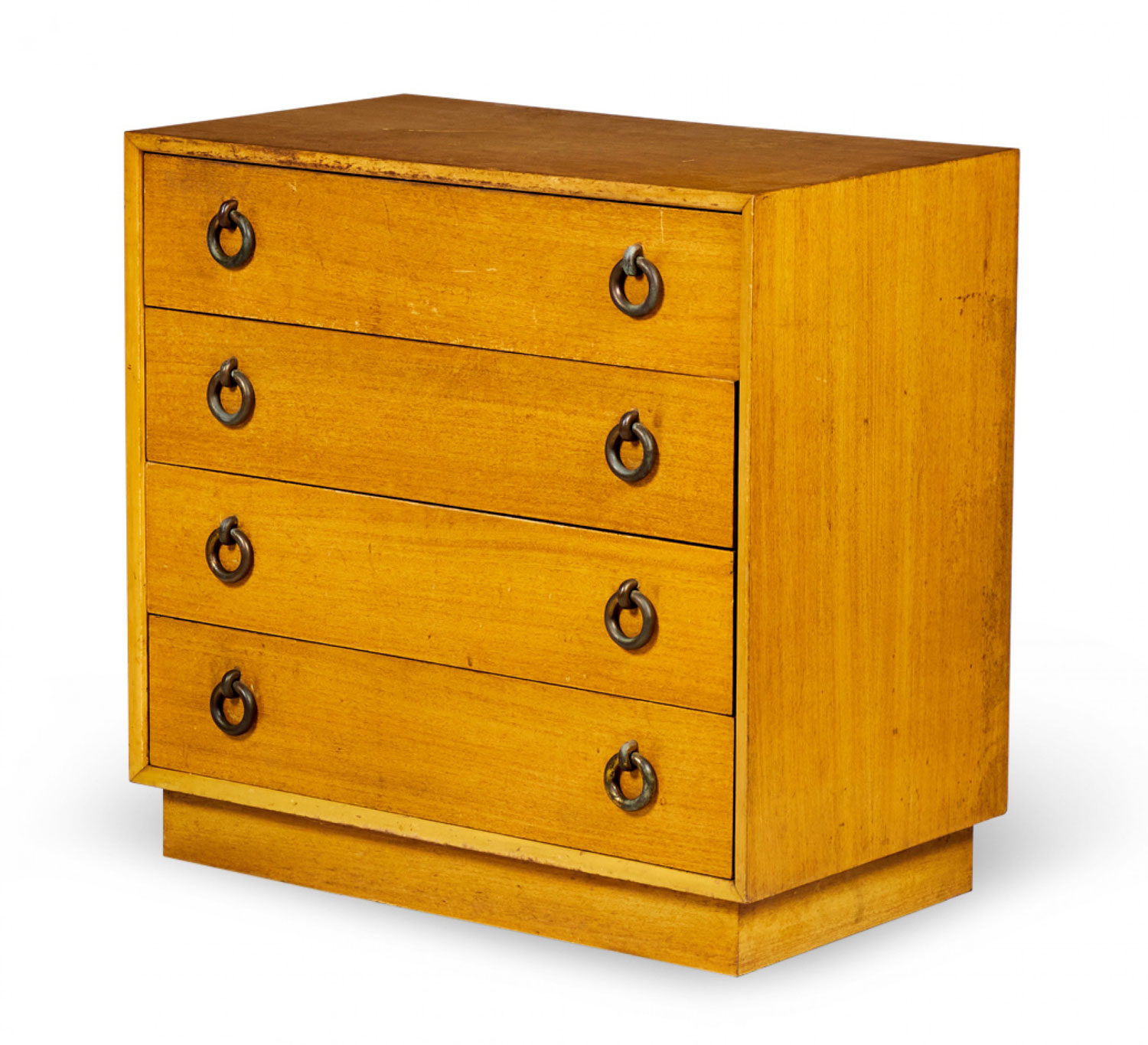 PAIR of American Mid-Century walnut chests with four drawers with two brass ring drawer pulls each..