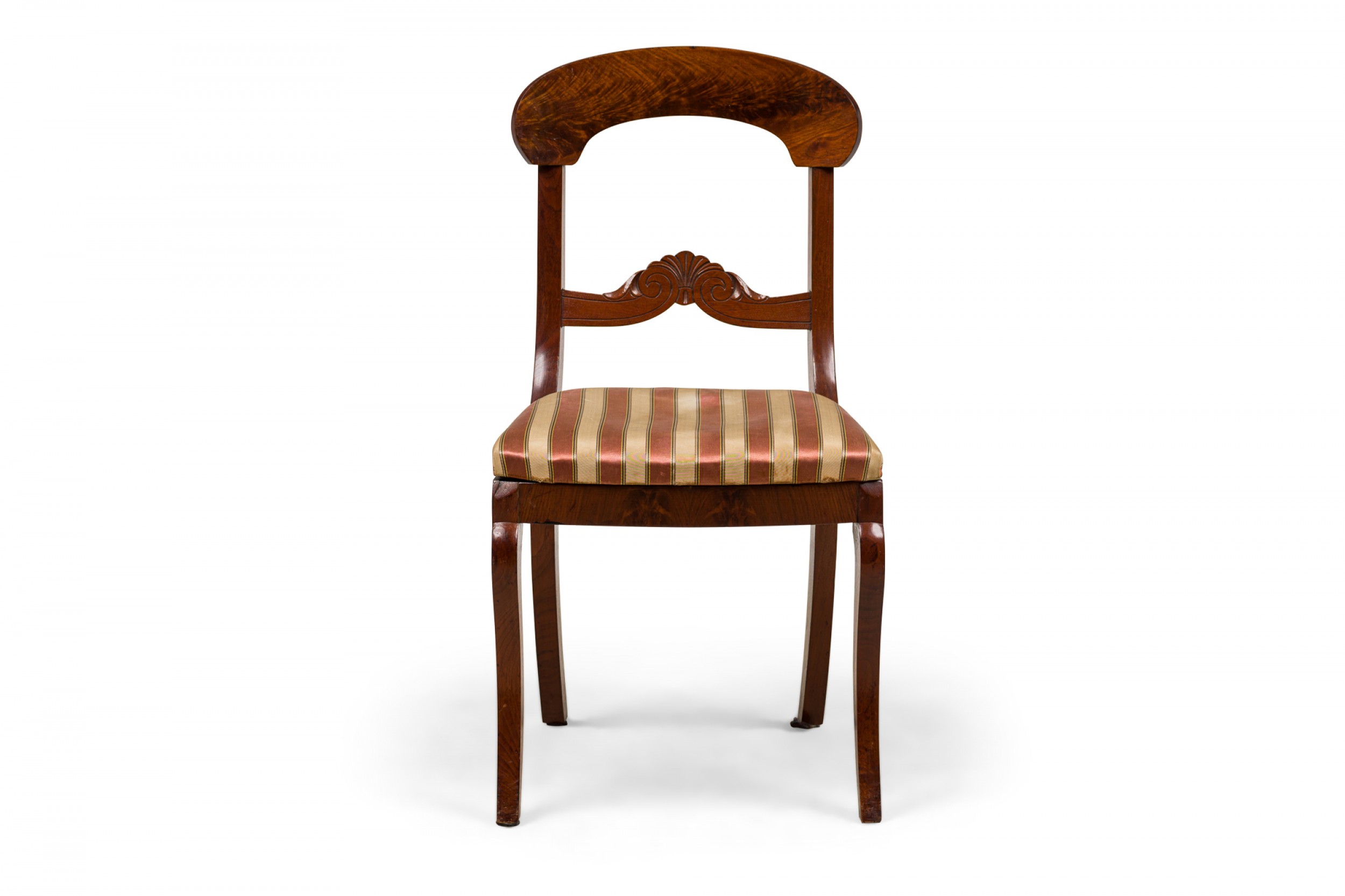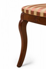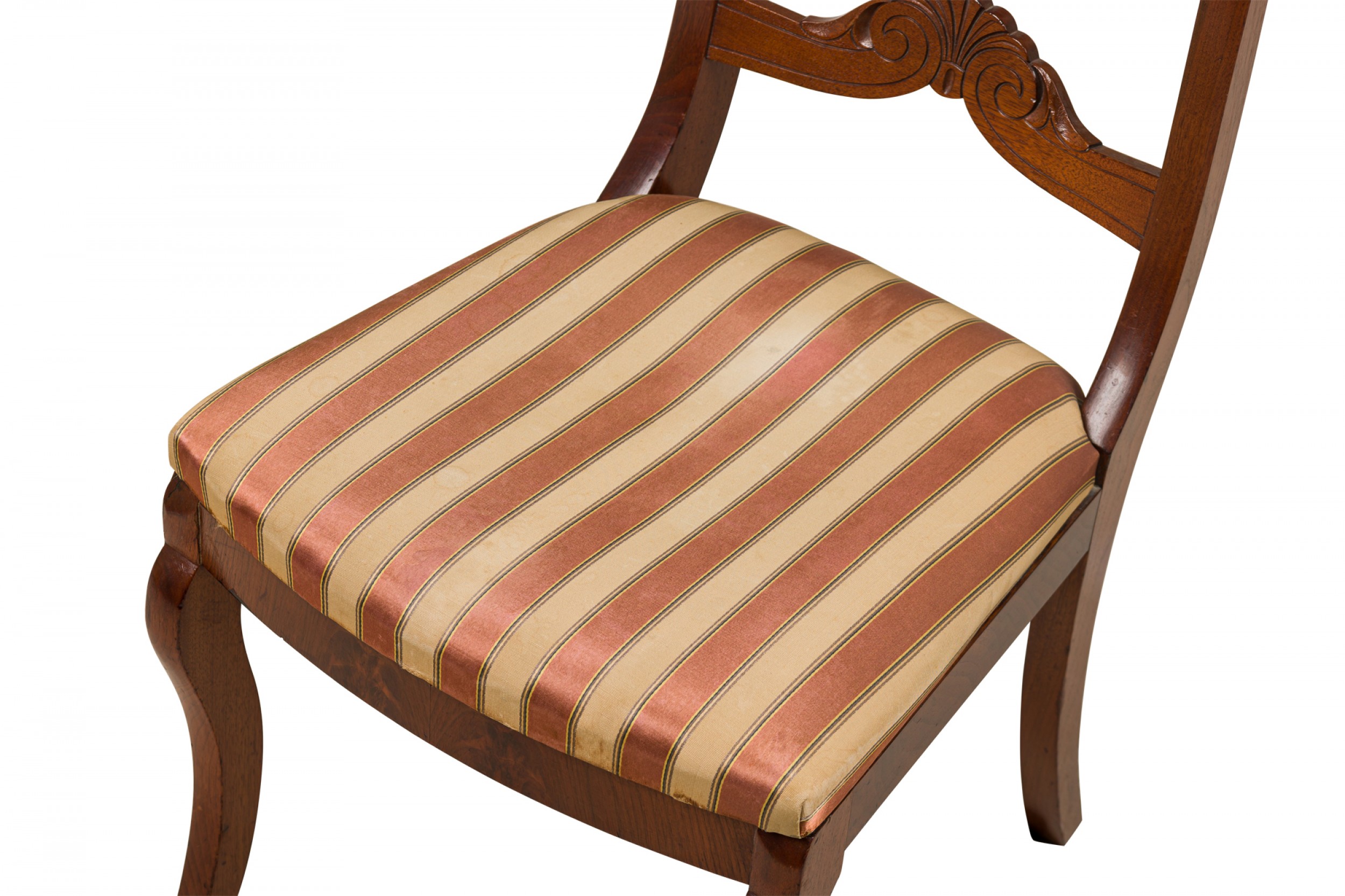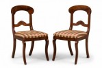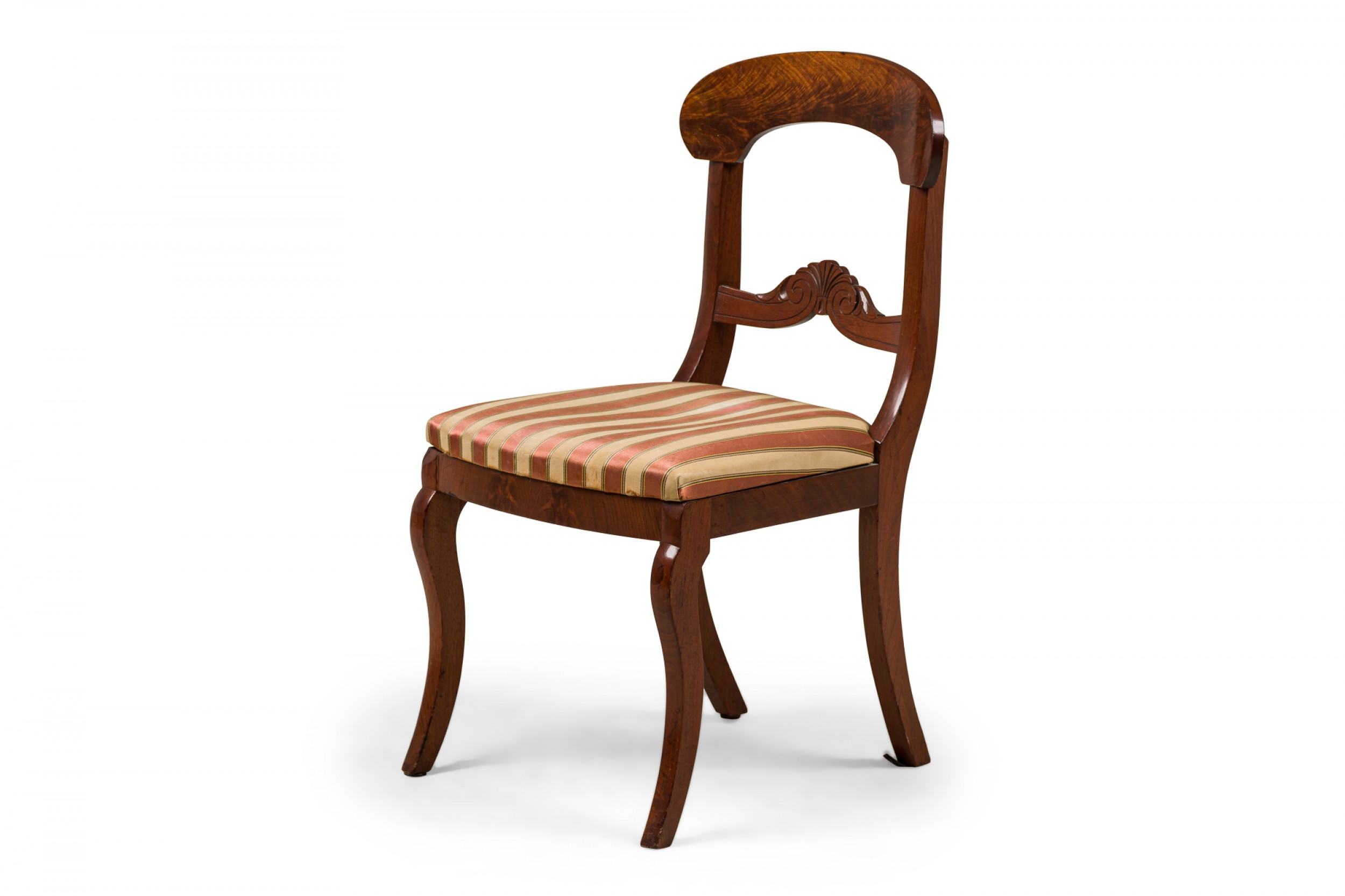 PAIR of American Victorian mahogany side / dining chairs in a dark veneer with burl inlay, open back scroll design, upholstered in a beige and pink striped fabric with satin finish, standing on two front cabriole legs and slightly splayed back legs. (PRICED AS PAIR)