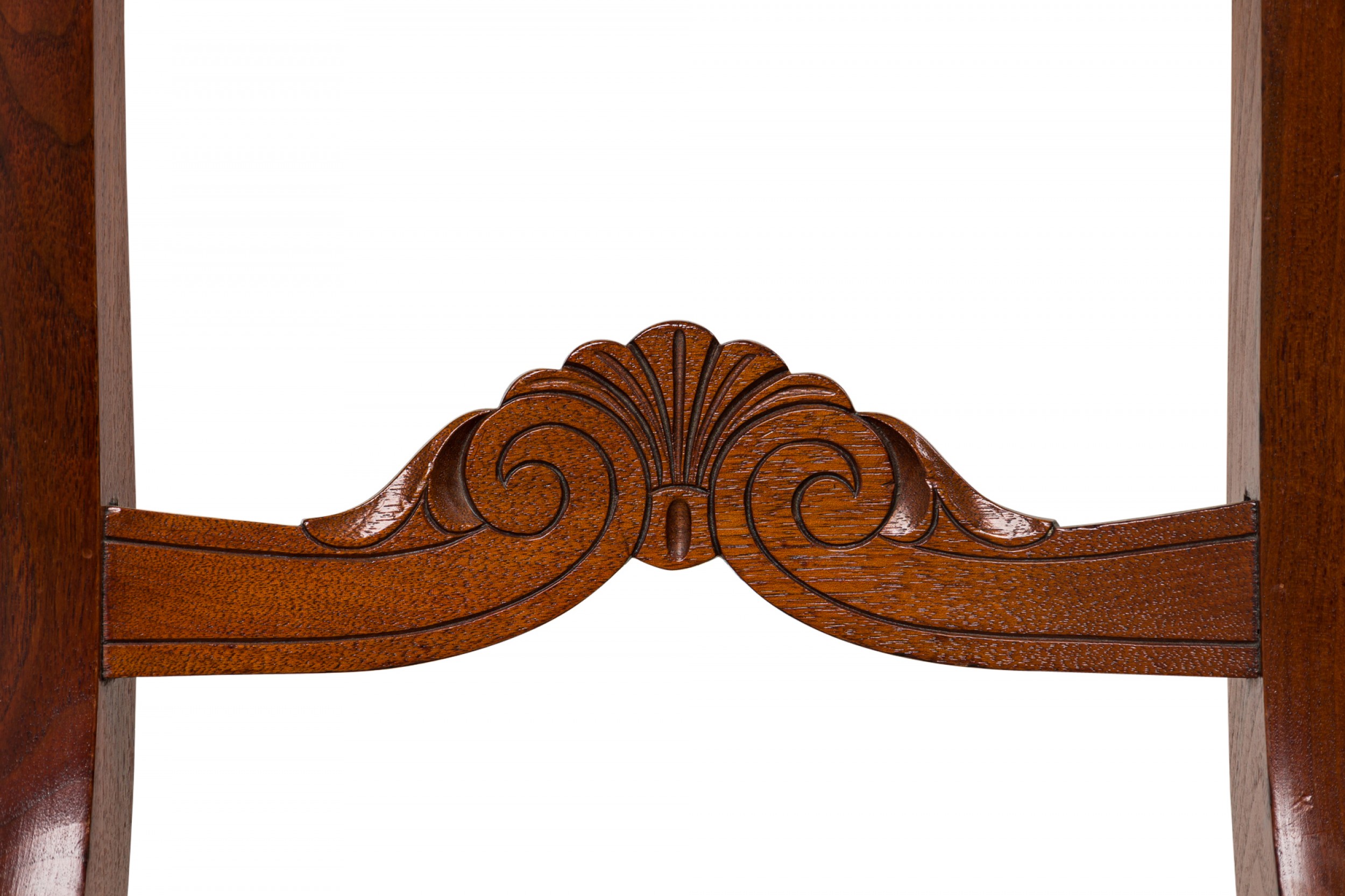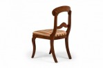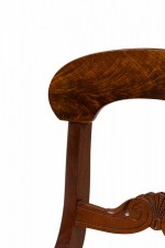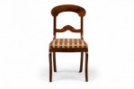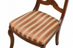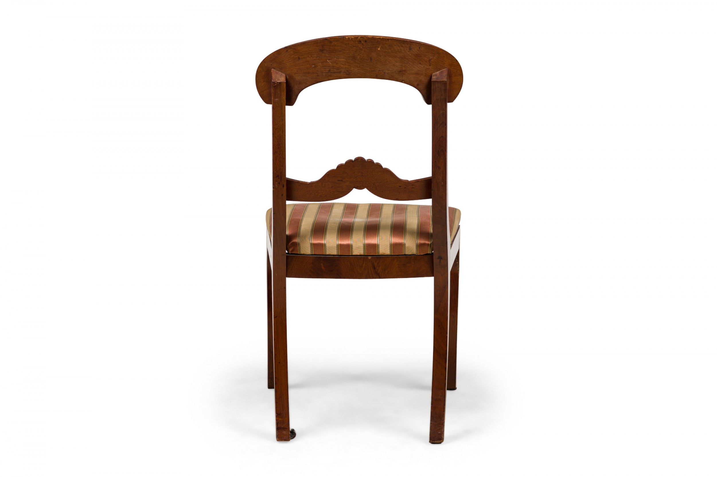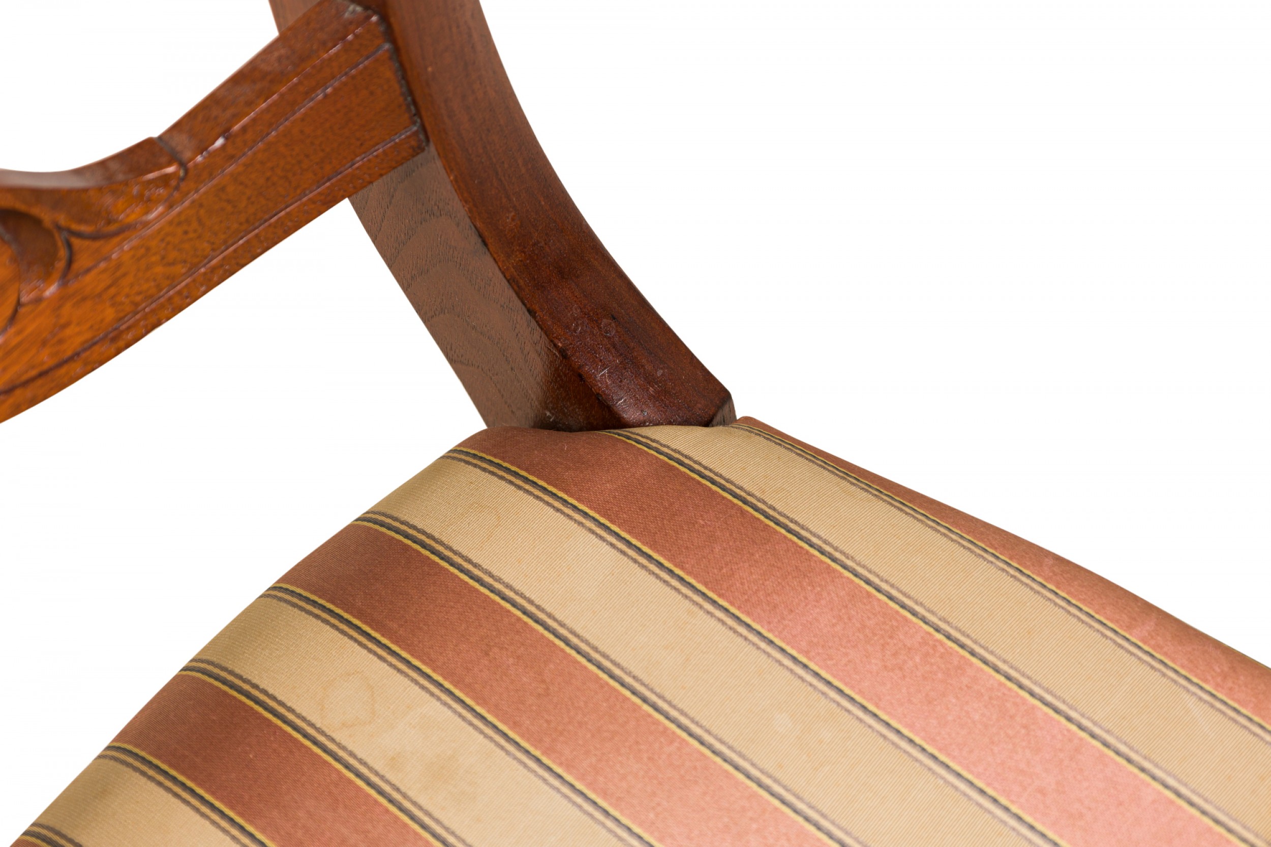 PAIR of American Victorian mahogany side / dining chairs in a dark veneer with burl inlay, open back scroll design, upholstered in a beige and pink striped fabric with satin finish, standing on two front cabriole legs and slightly splayed back legs. (PRICED AS PAIR)