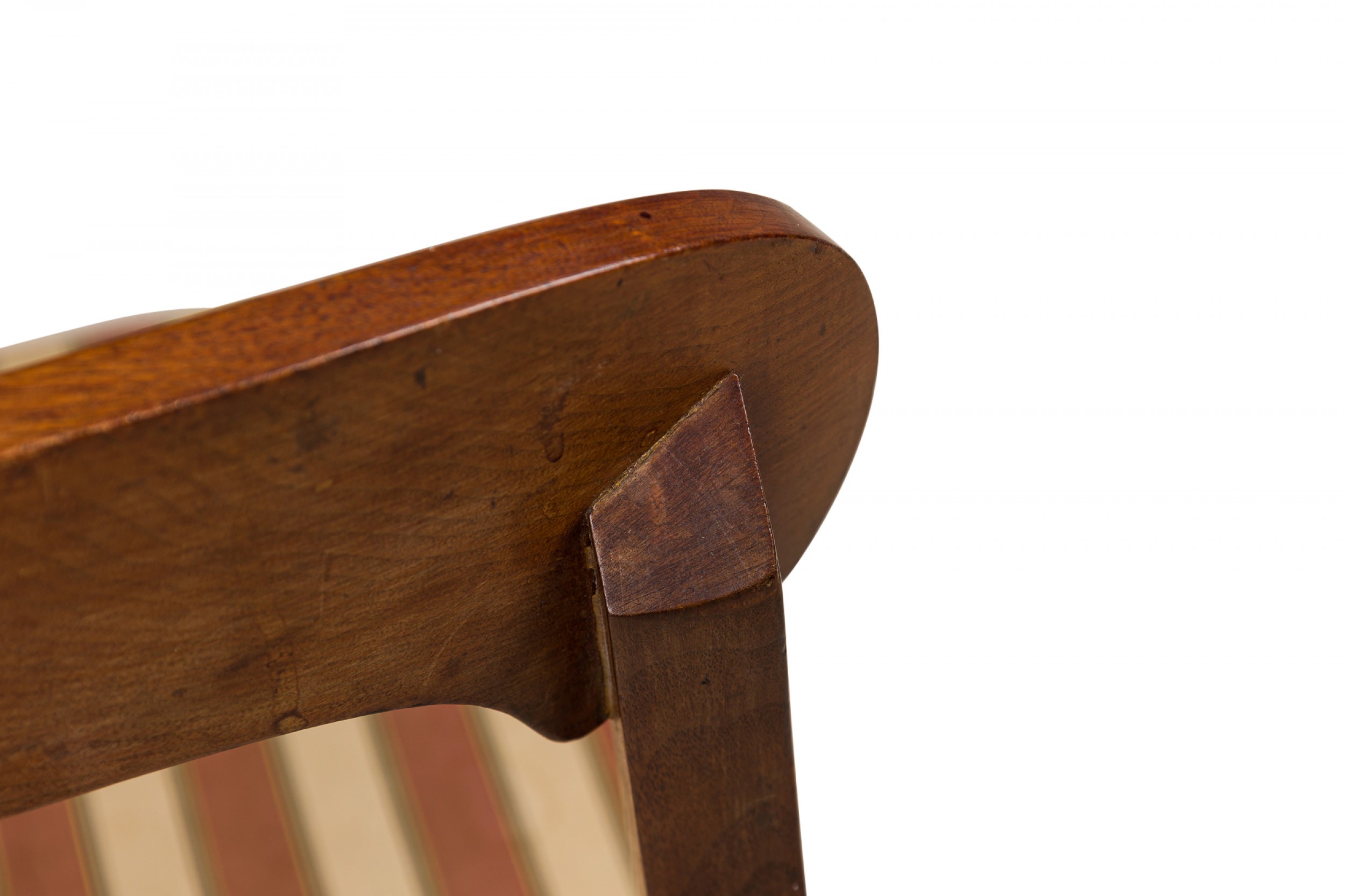 Style: American Materials & Techniques: Burl, fabric, upholstered, wood Category: Seating Condition: Slight wear from age & use. Good; Wear consistent with age and use