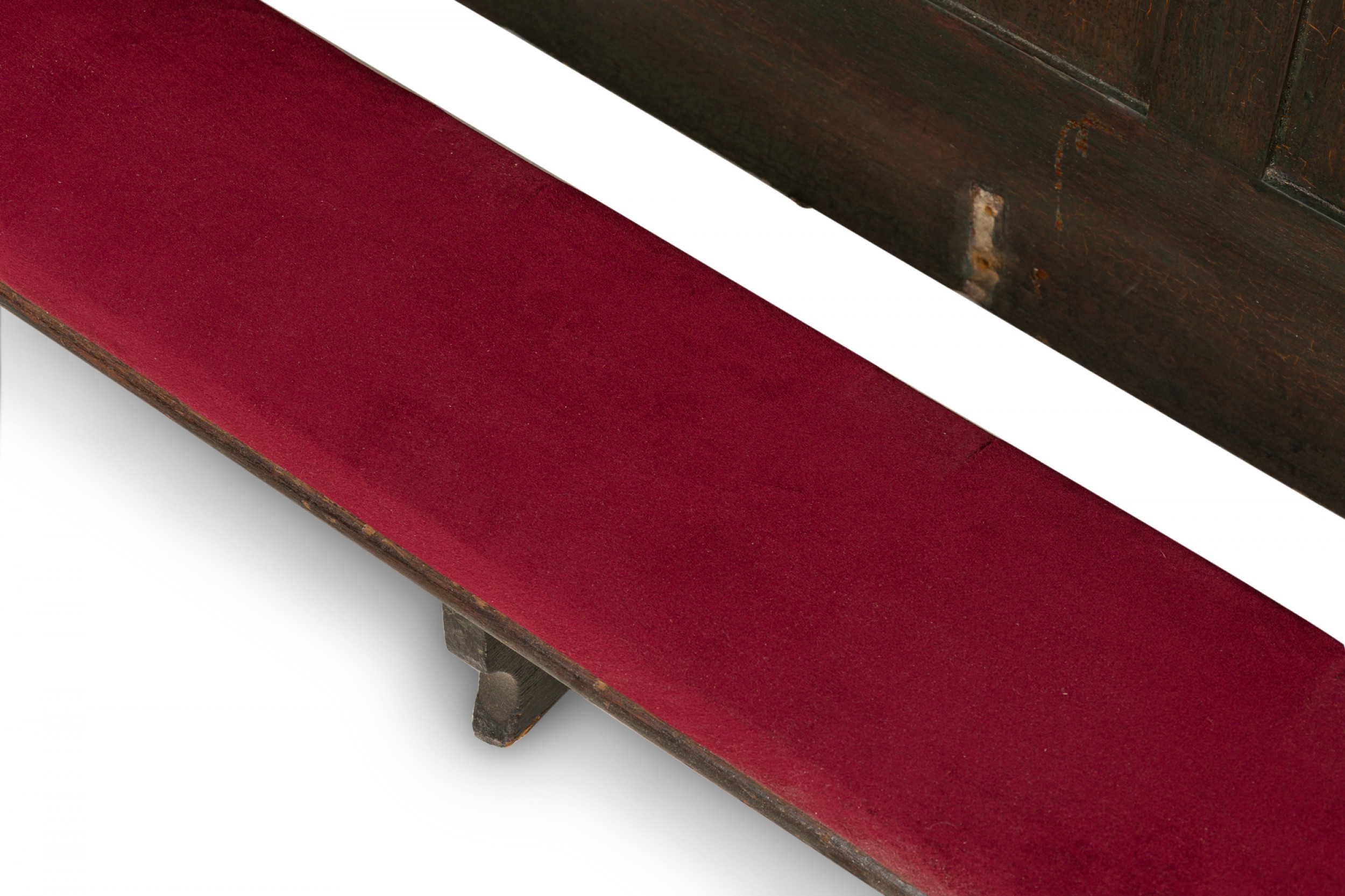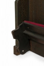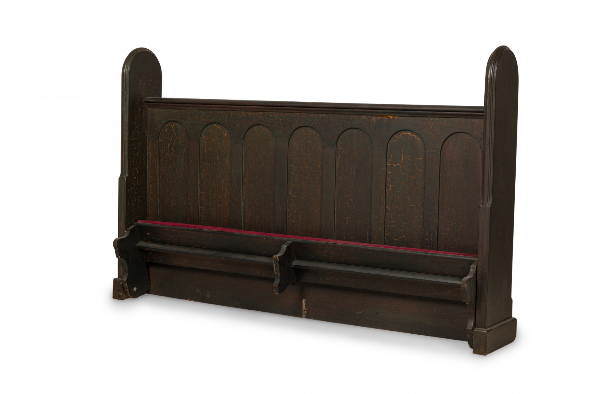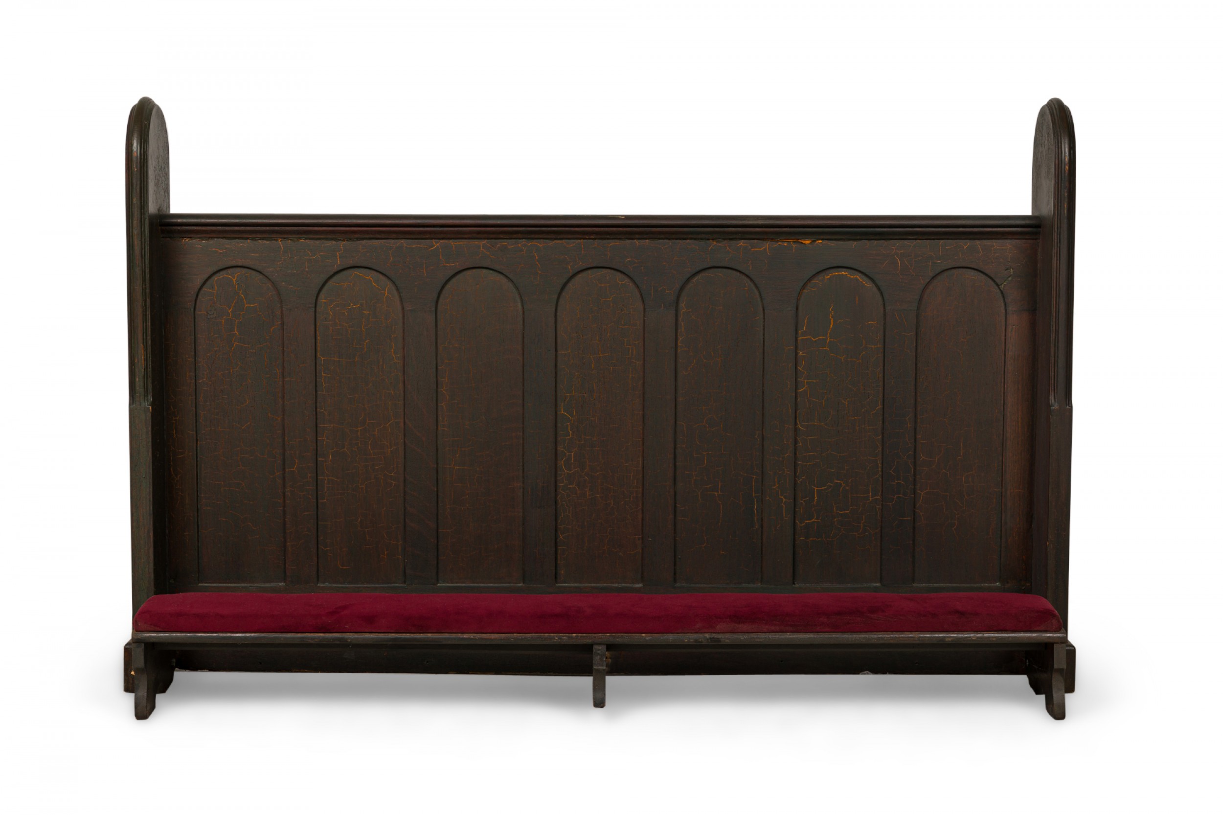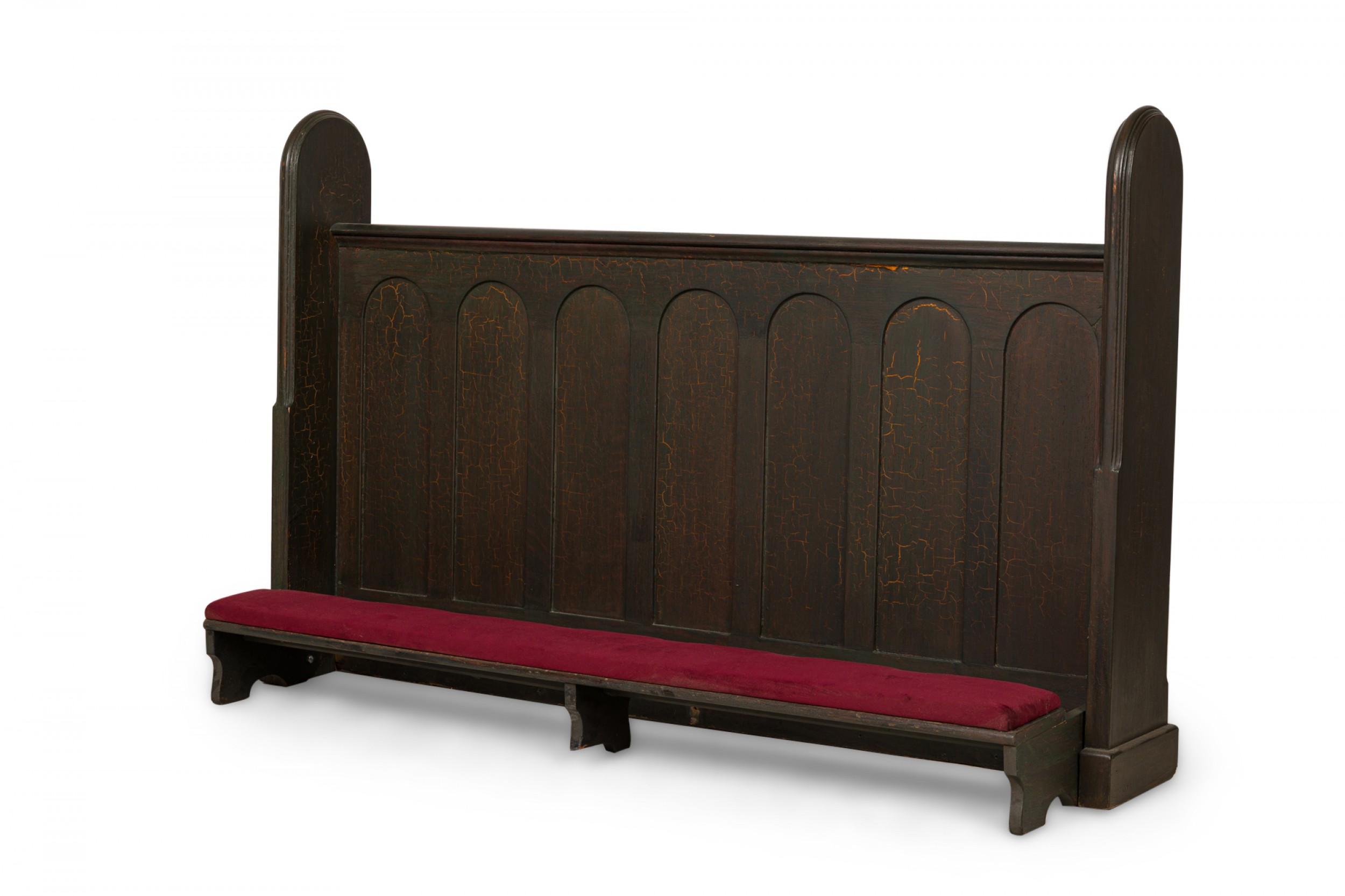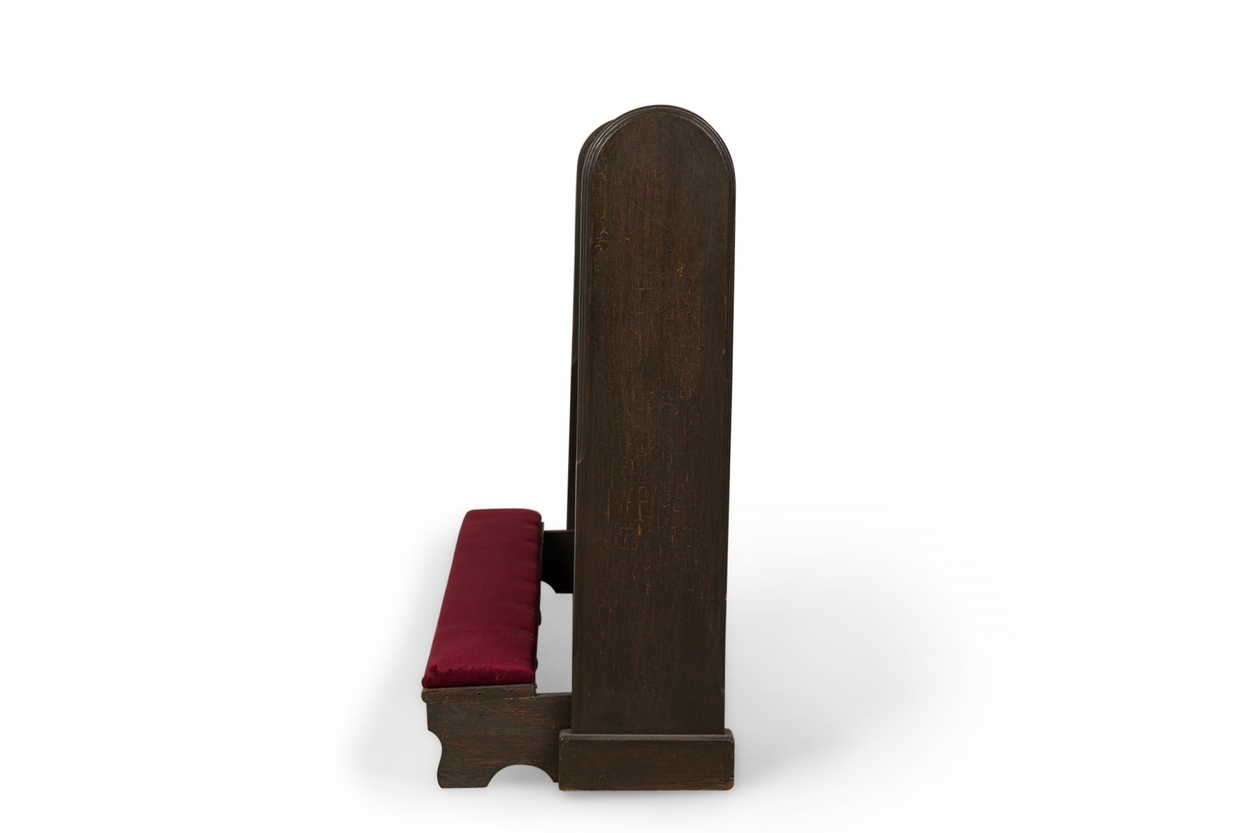 PAIR of American Victorian Style wooden church pews featuring a contoured structure with seven inset molded arch columns, each topped by a four-lobed flower, with foldable kneeling benches upholstered with burgundy padding. (PRICED AS PAIR)