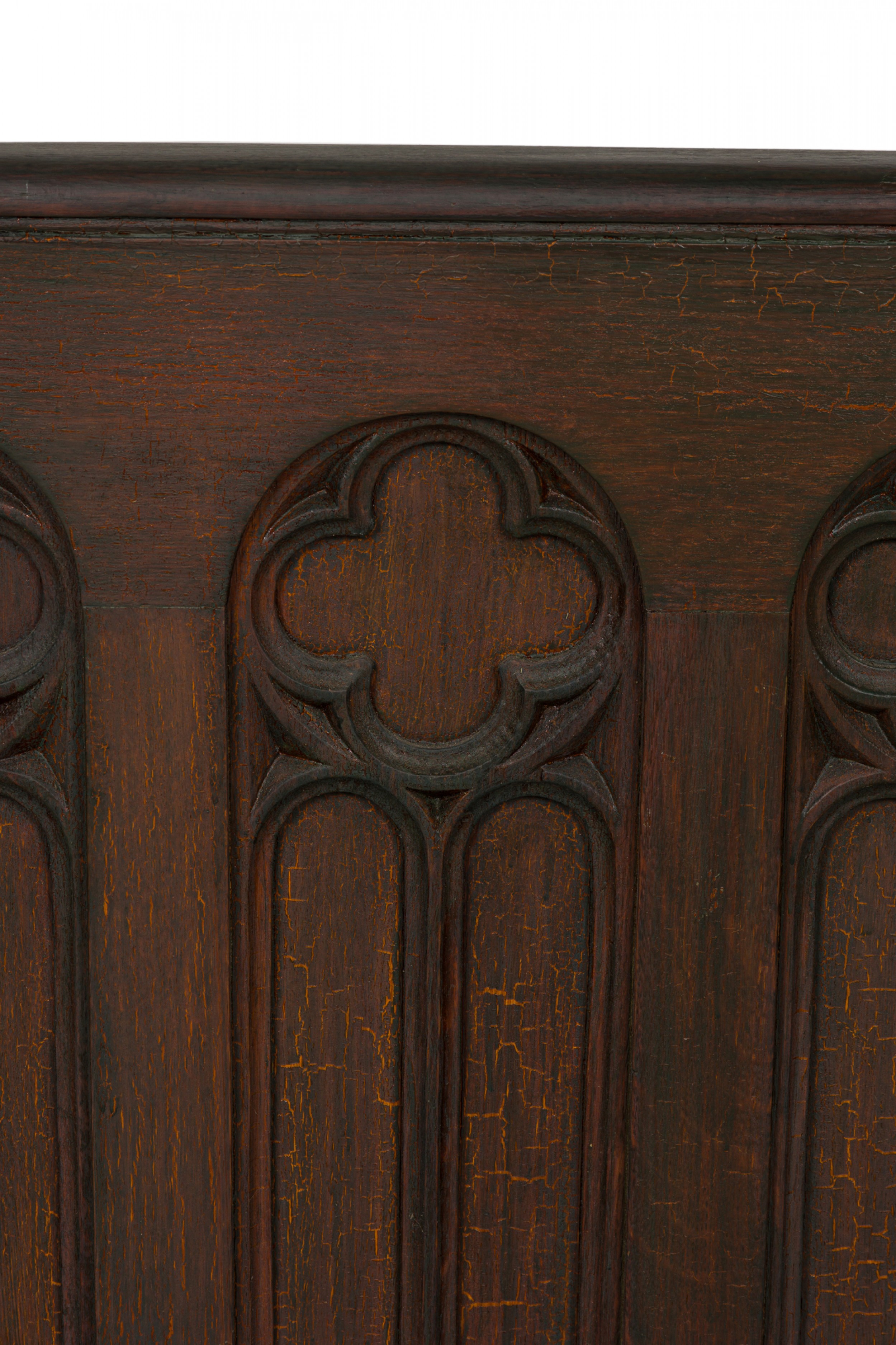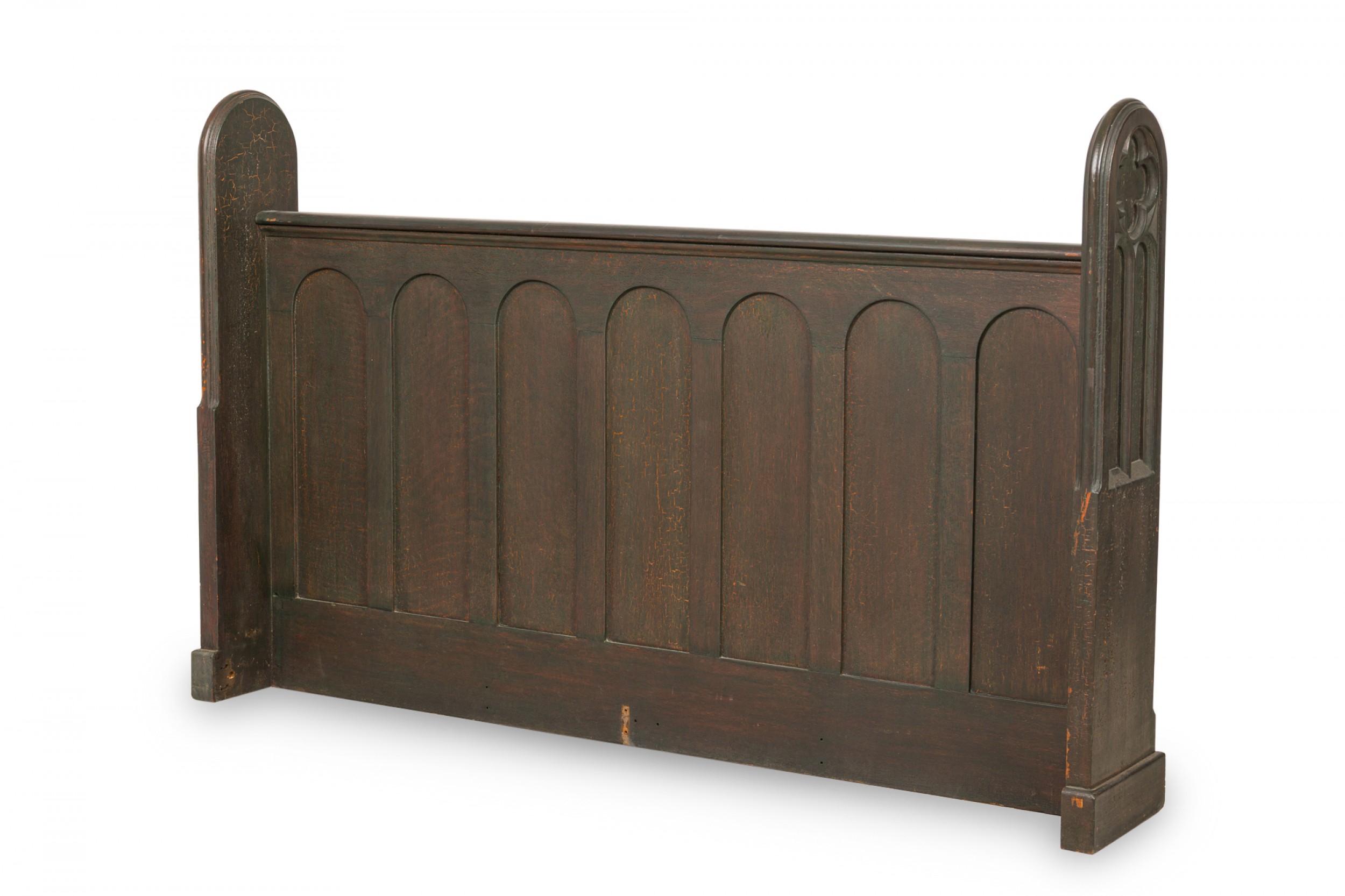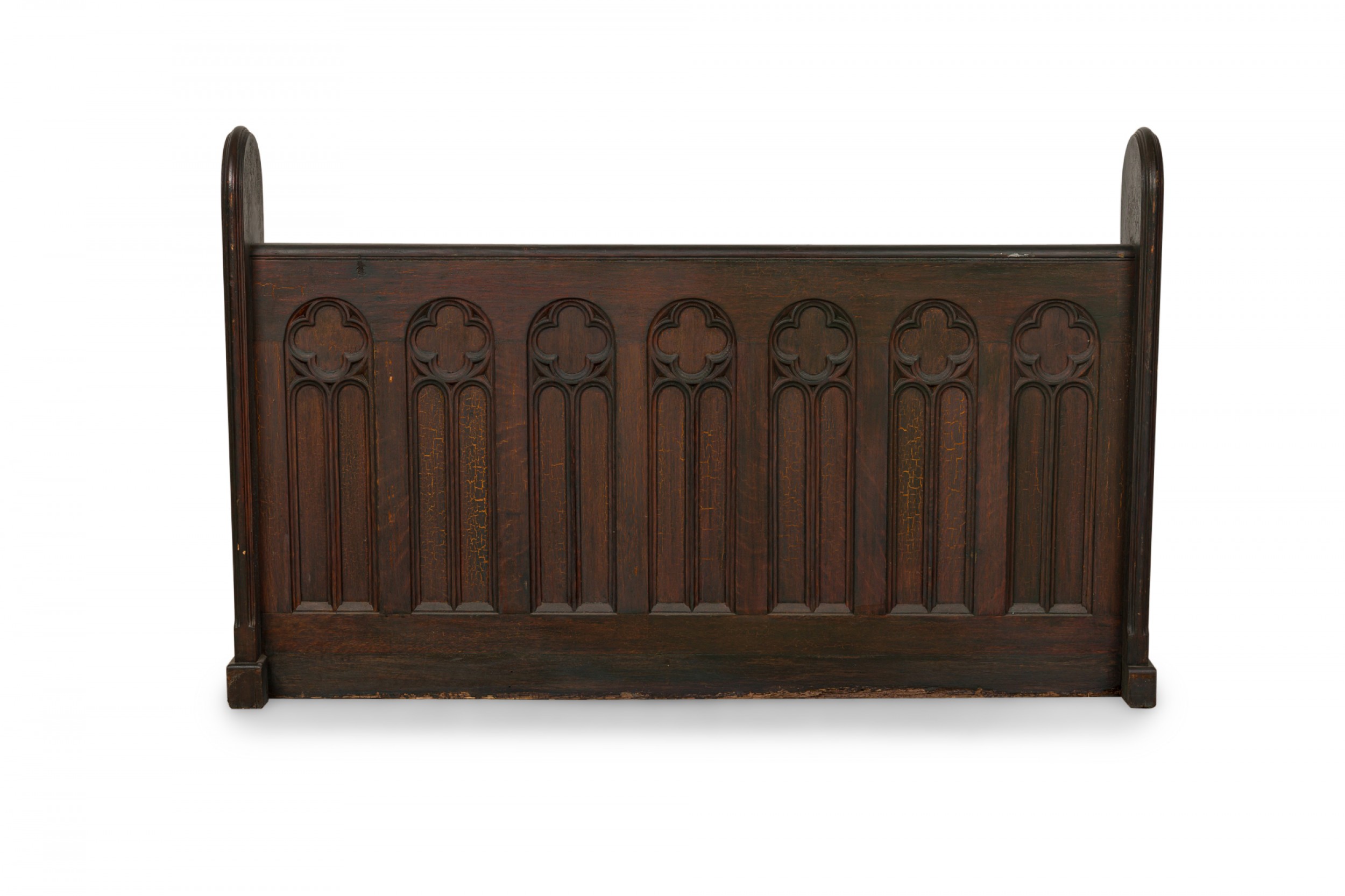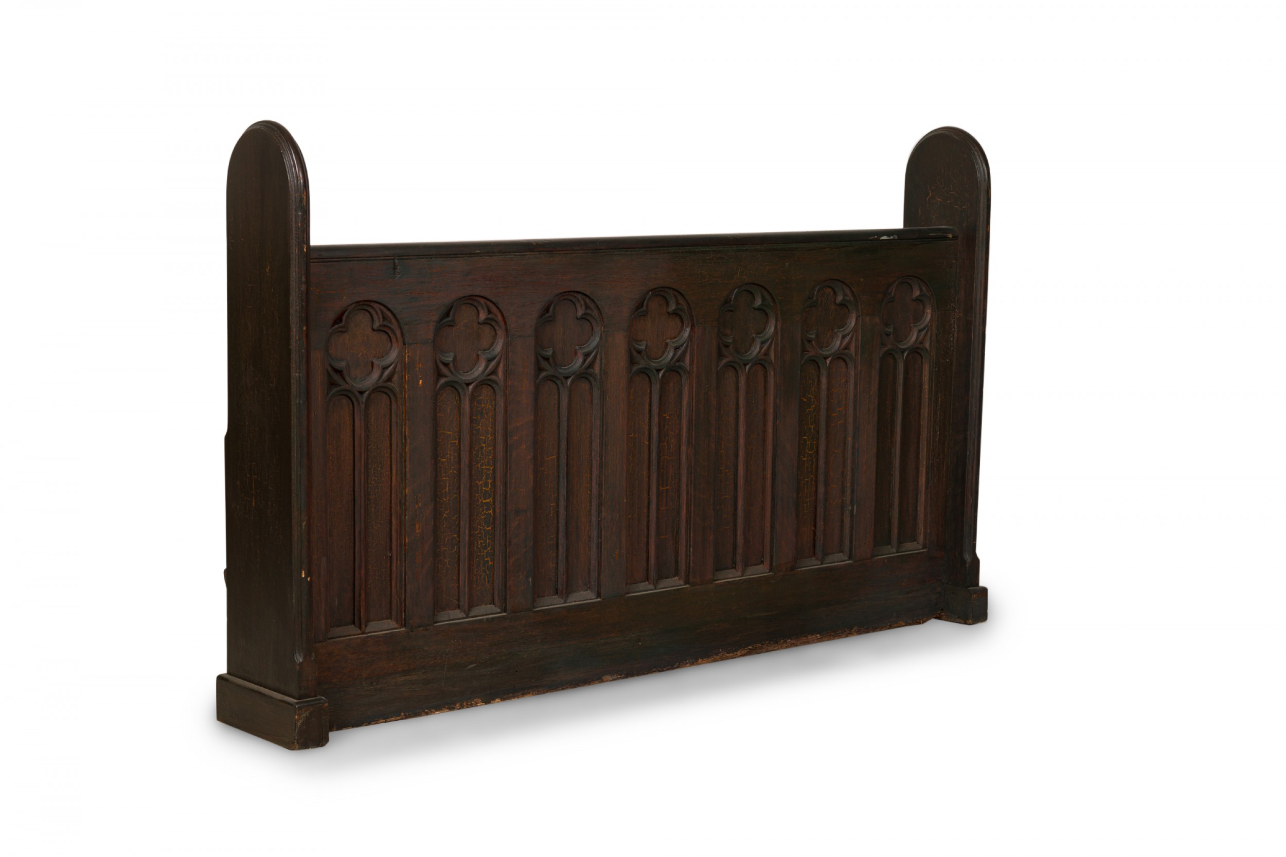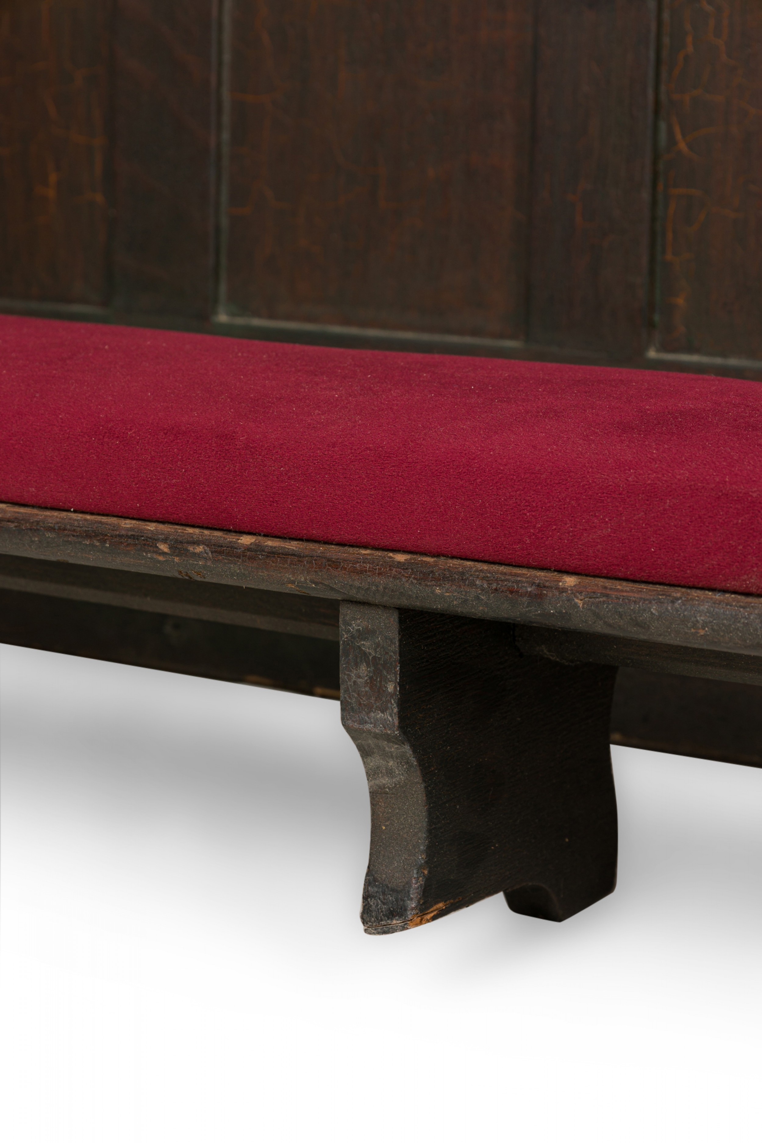 PAIR of American Victorian Style wooden church pews featuring a contoured structure with seven inset molded arch columns, each topped by a four-lobed flower, with foldable kneeling benches upholstered with burgundy padding. (PRICED AS PAIR)