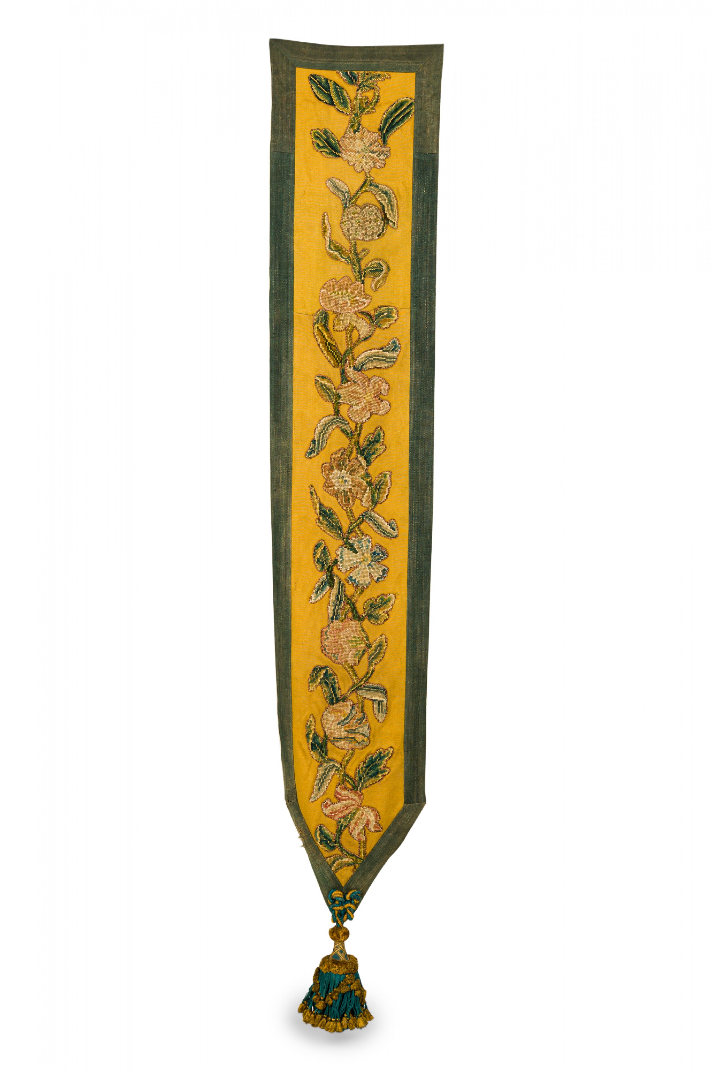 PAIR of French Victorian needlepoint tapestry wall hangings (bell pulls) with vertical floral designs against a bright yellow background with a dark green border and canvas backing, ending in a point and teal and gold tassels. (PRICED AS PAIR).