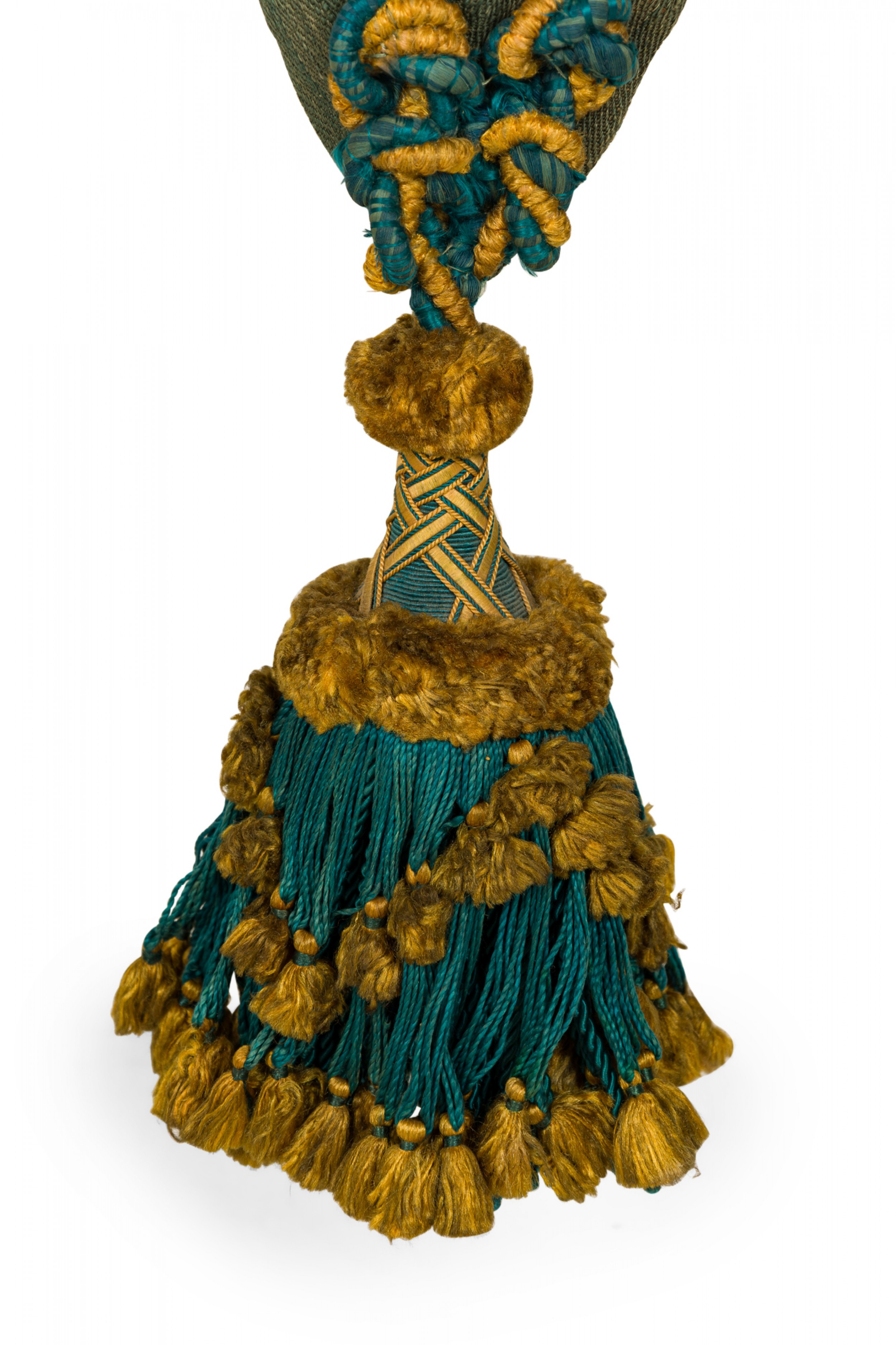 PAIR of French Victorian needlepoint tapestry wall hangings (bell pulls) with vertical floral designs against a bright yellow background with a dark green border and canvas backing, ending in a point and teal and gold tassels. (PRICED AS PAIR)