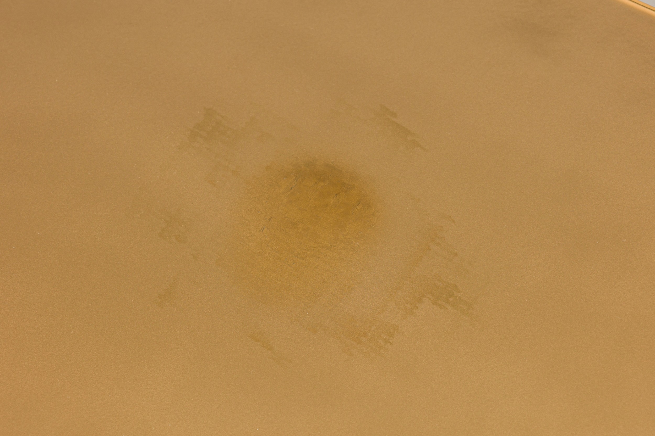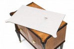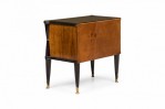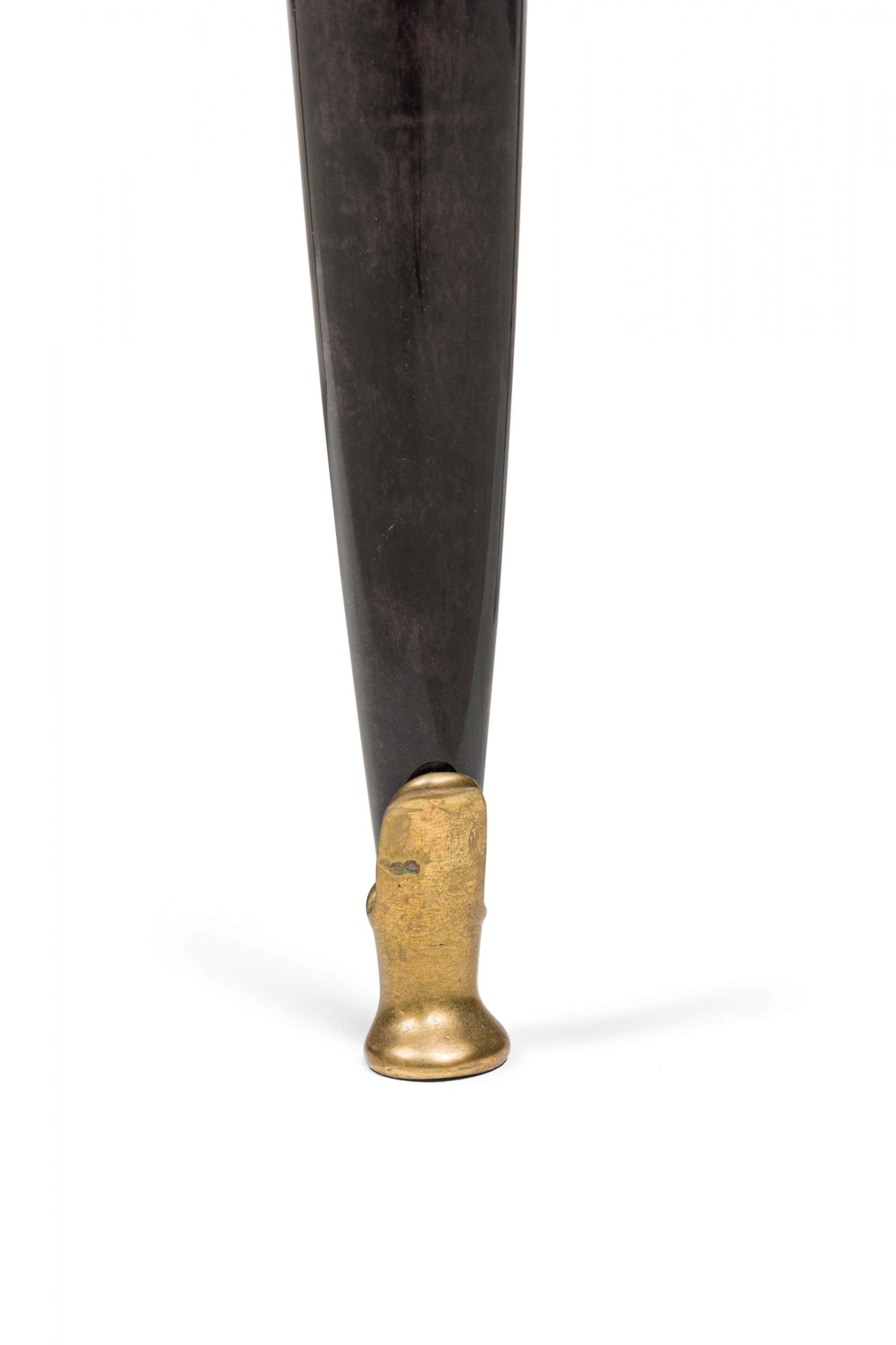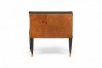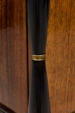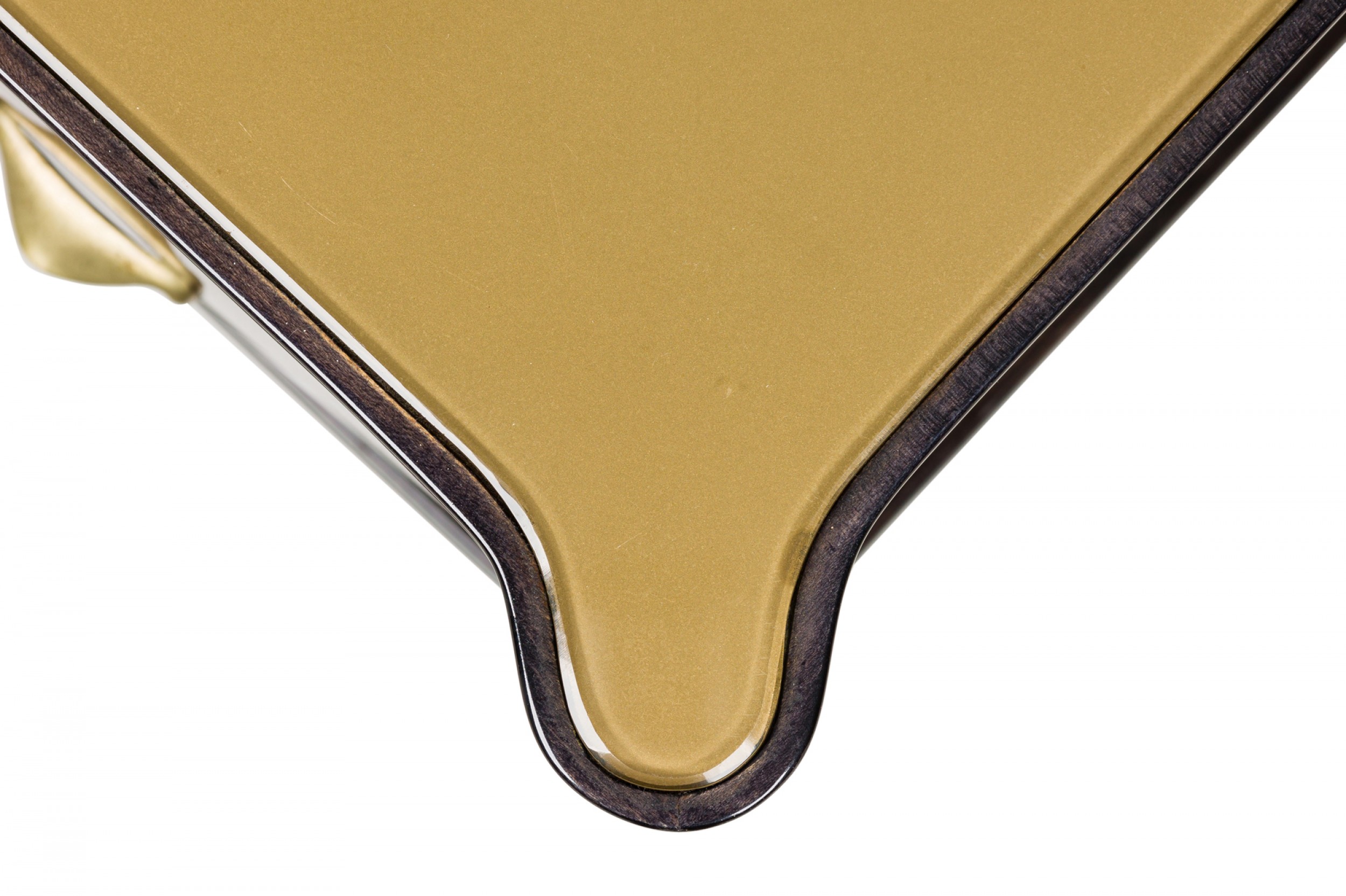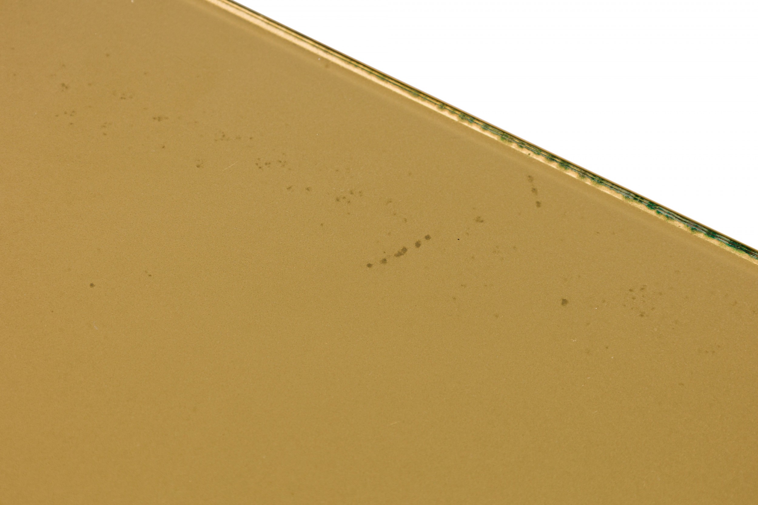 Style: Art Deco Materials & Techniques: Bronze, glass, metal, veneer, wood Category: Tables, Cabinets & Case Goods, Dining Room Condition: One glass top with some damage to the gold coating Good; Wear consistent with age and use