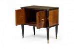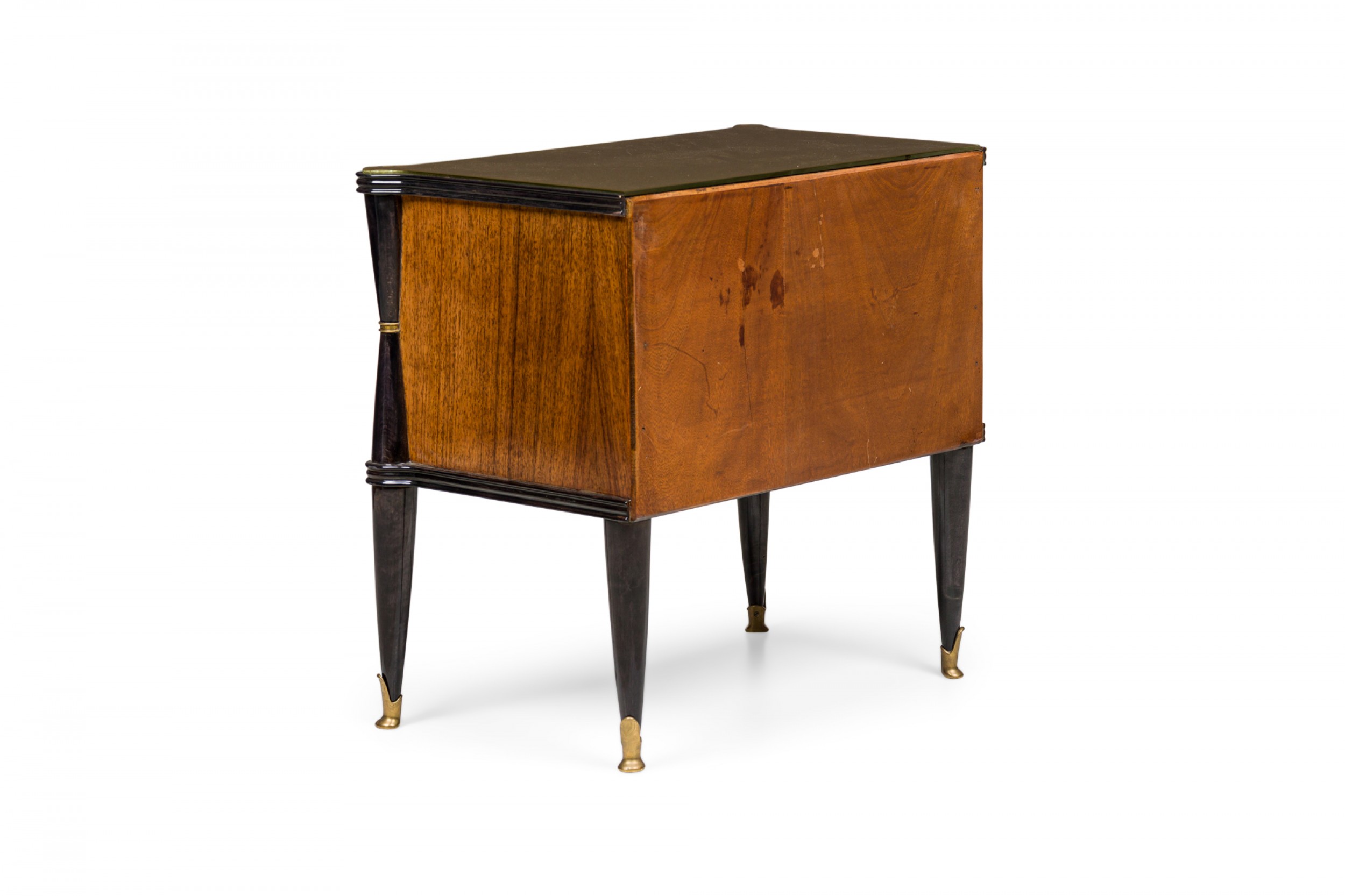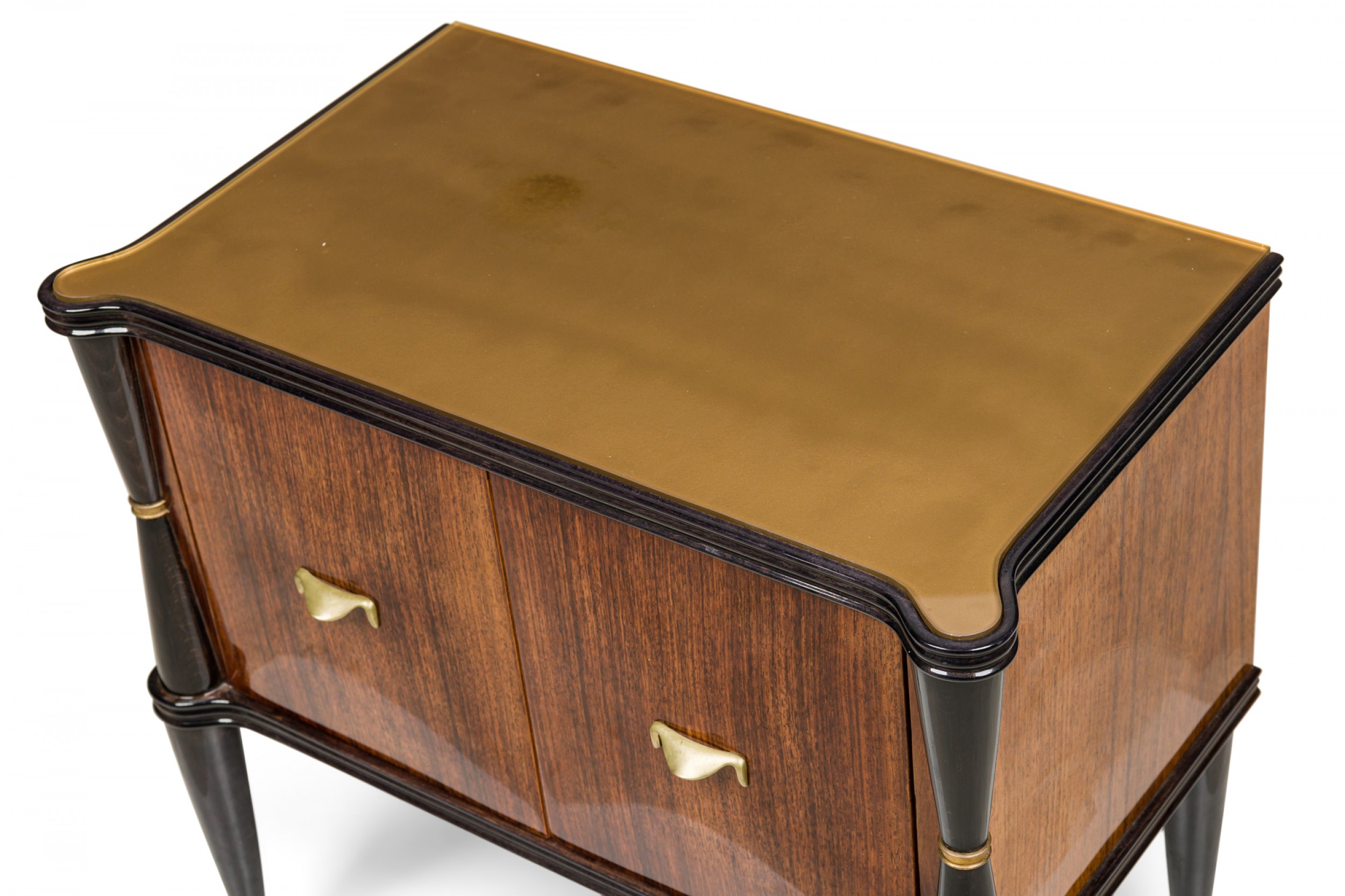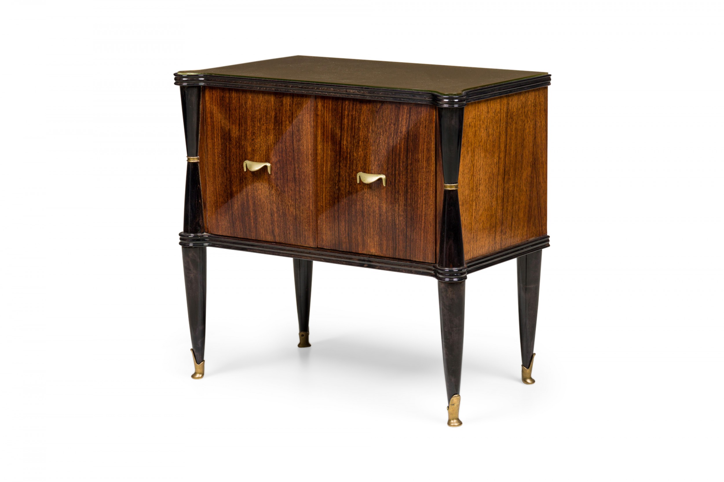 PAIR of Art Deco French rosewood (bedside) commodes in rectangular form with a shaped, molded ebonized trim enclosing an inset glass top, two fitted hinged doors with bronze lip pulls revealing an interior compartment, standiing on ebonized turned legs with bronze trim and sabots. (PRICED AS PAIR)