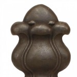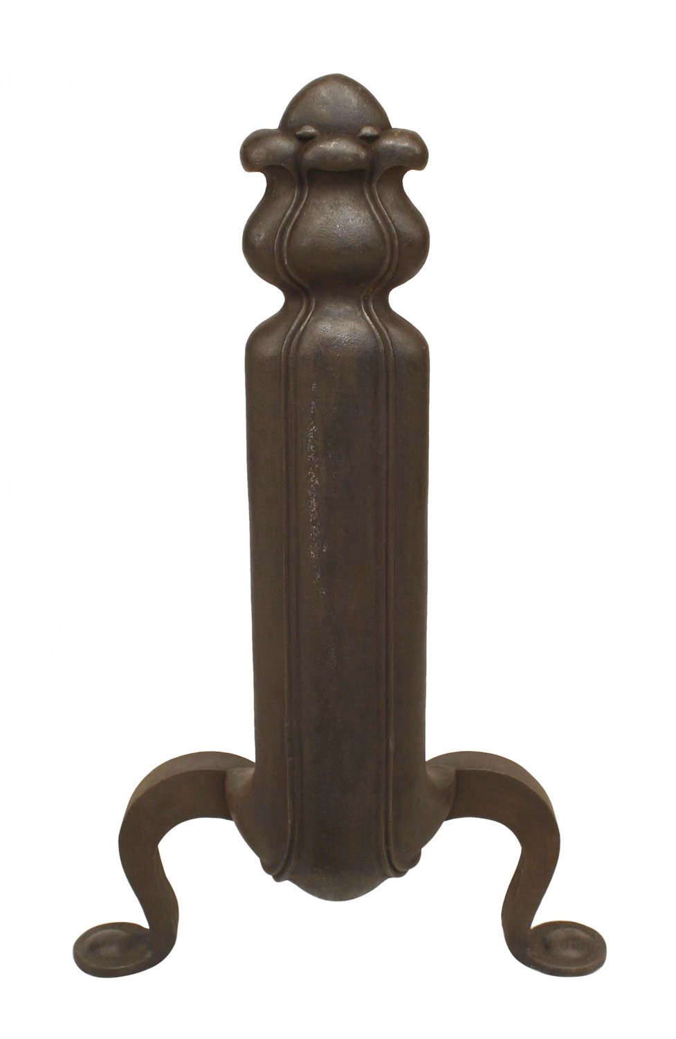 PAIR of American Art Nouveau iron andirons with foliate finials over a fluted design. (PRICED AS PAIR).