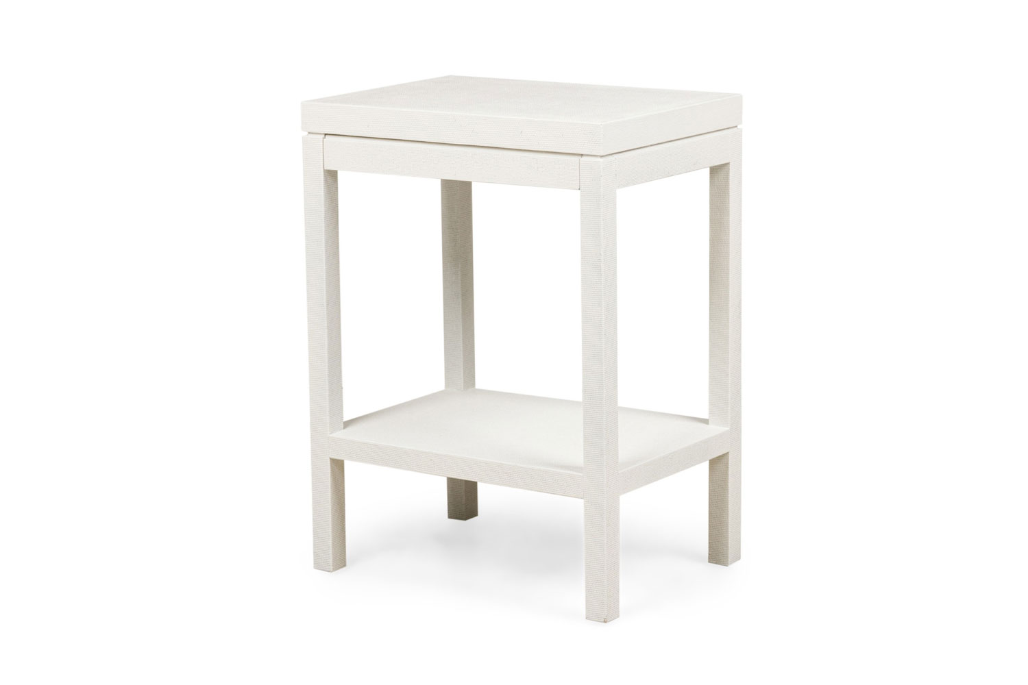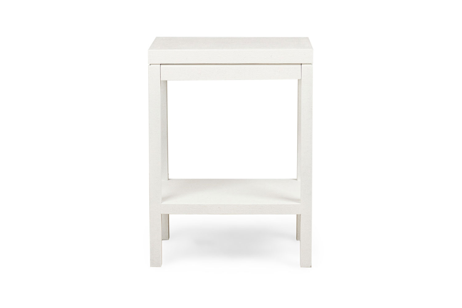 PAIR of Asian Contemporary Style white painted raffia wrapped single drawer end tables featuring a reveal and low tier shelf (PRICED AS PAIR)