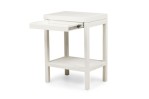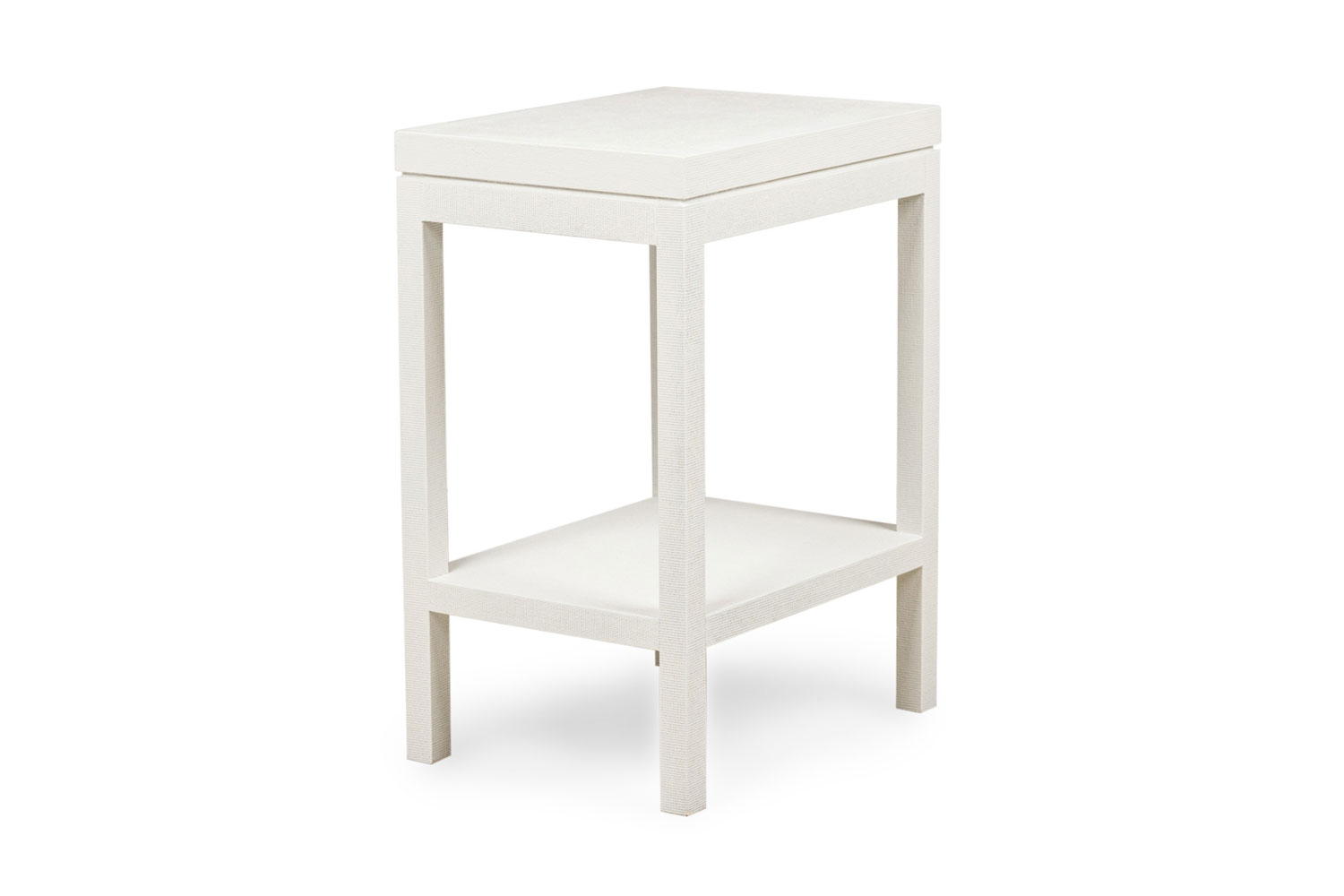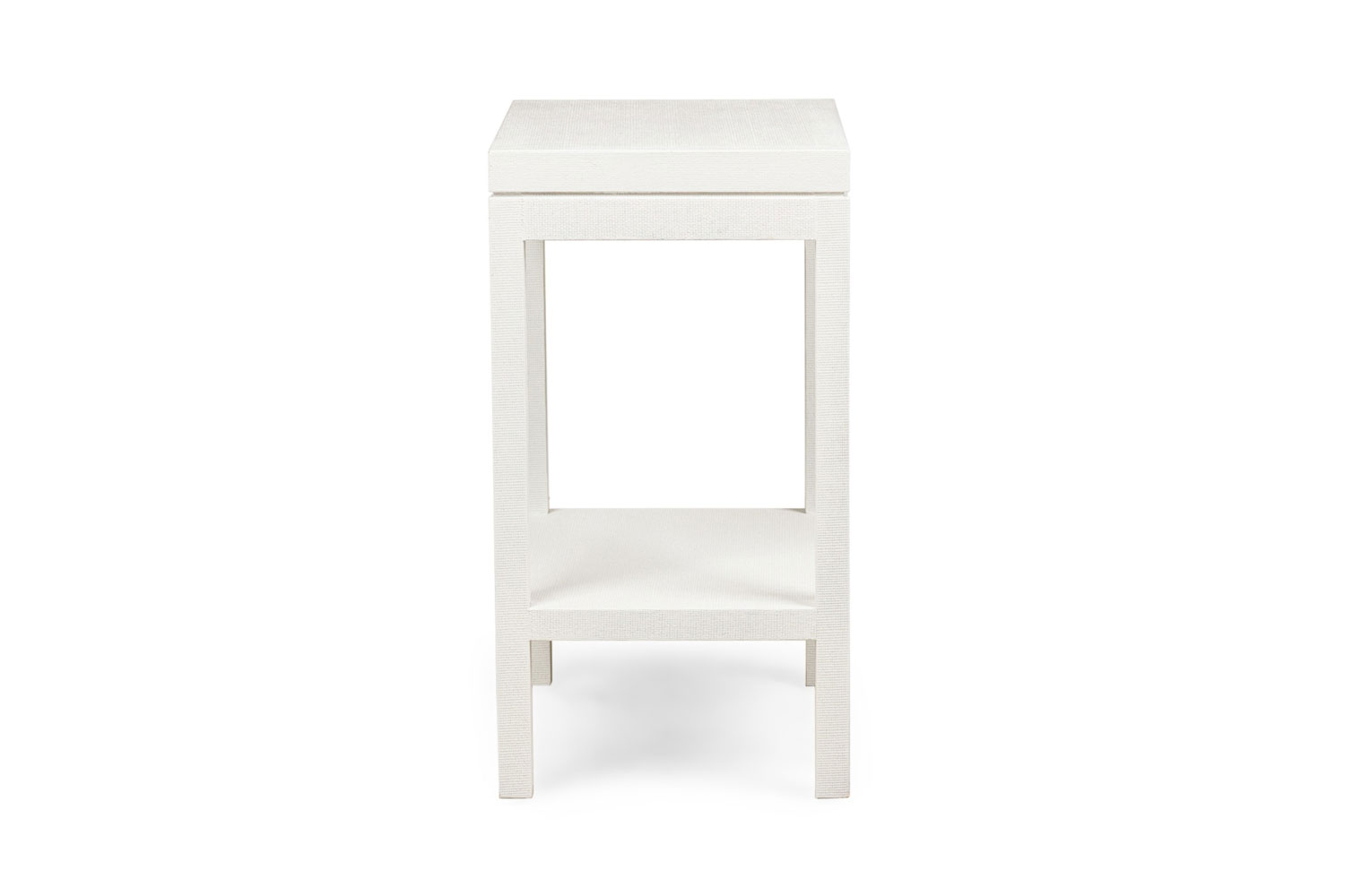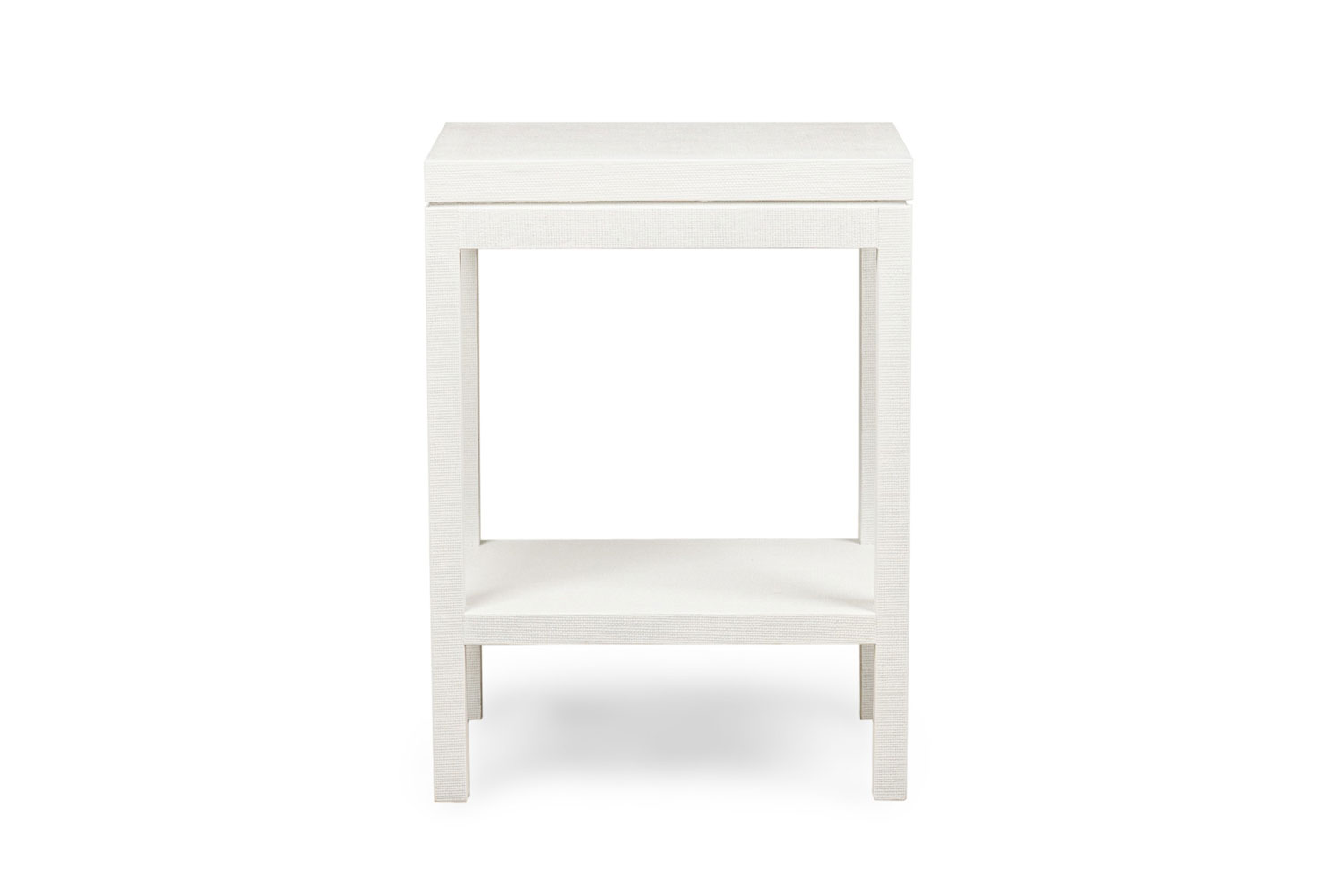 PAIR of Asian Contemporary Style white painted raffia wrapped single drawer end tables featuring a reveal and low tier shelf (PRICED AS PAIR).