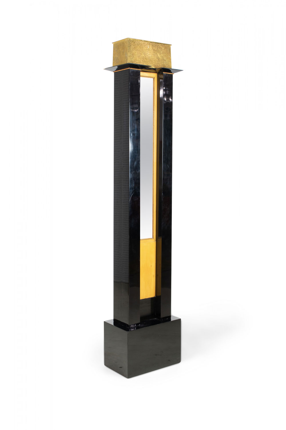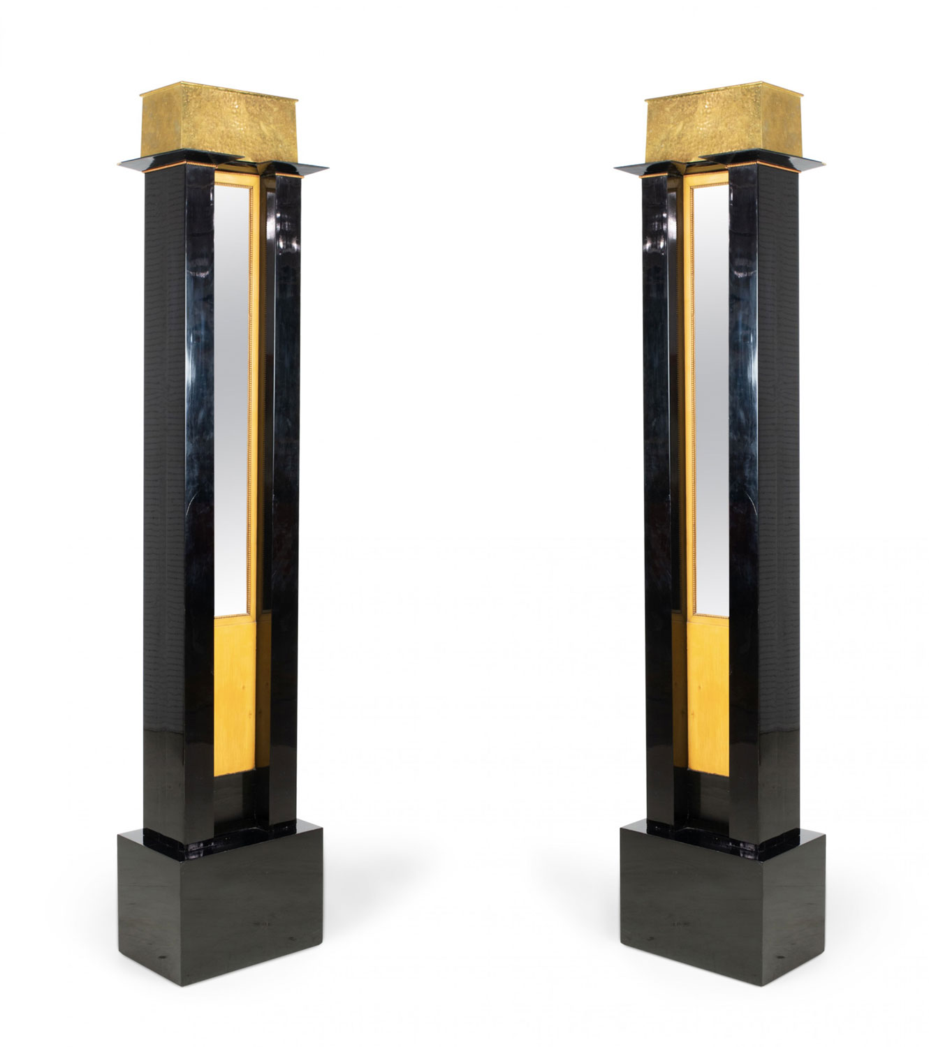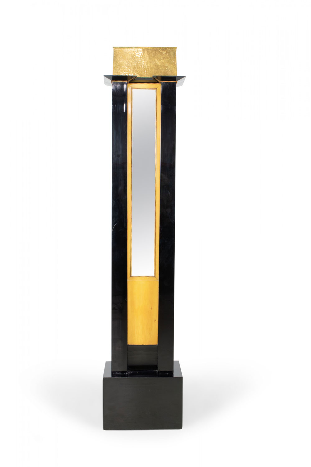PAIR of Austrian Secessionist pedestals / jardinieres with black lacquered and birch wood columns having beaded trim centering a beveled mirror topped with a separate hammered brass planter (attributed to JOSEF HOFFMAN) (PRICED AS PAIR).