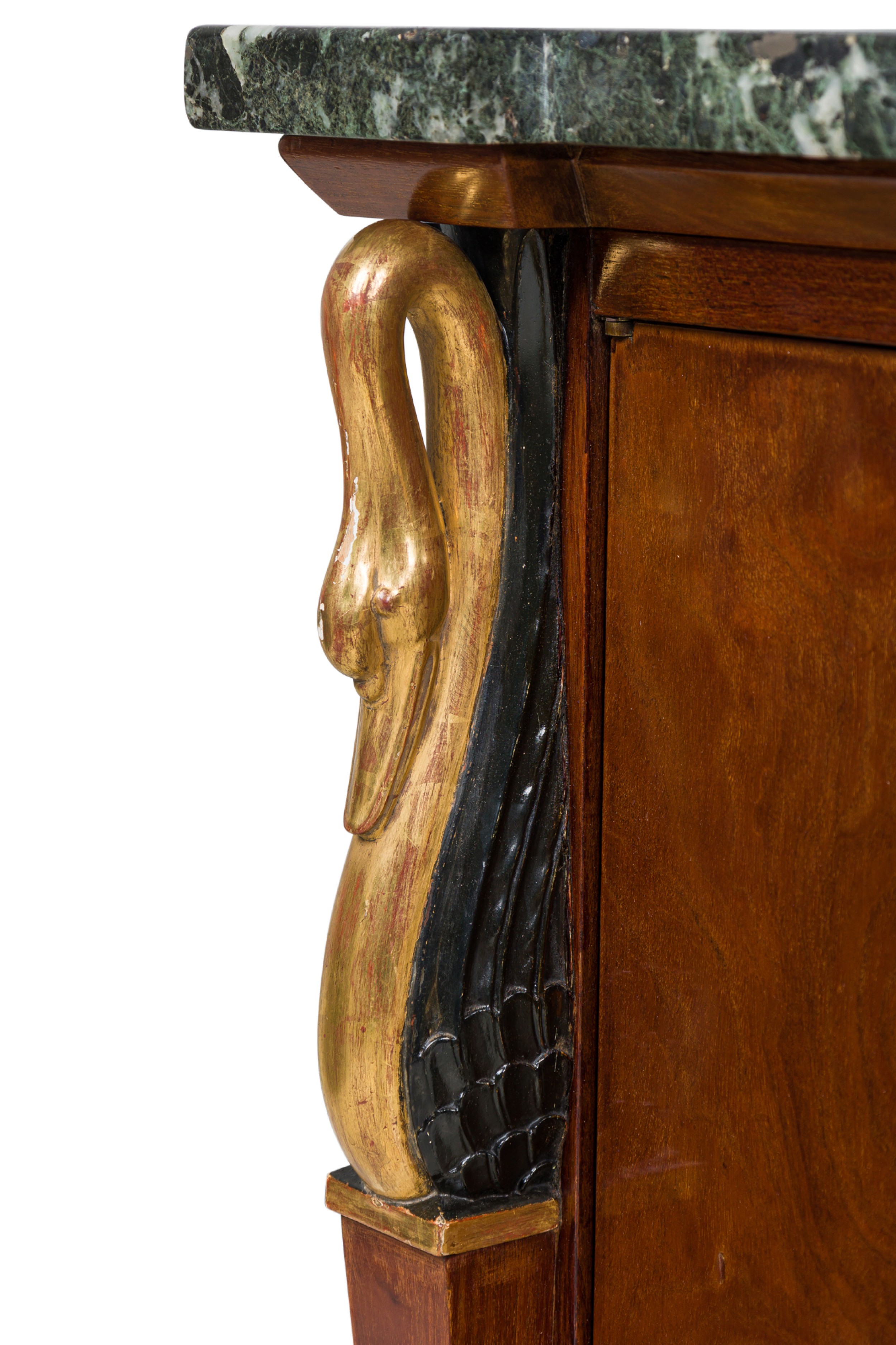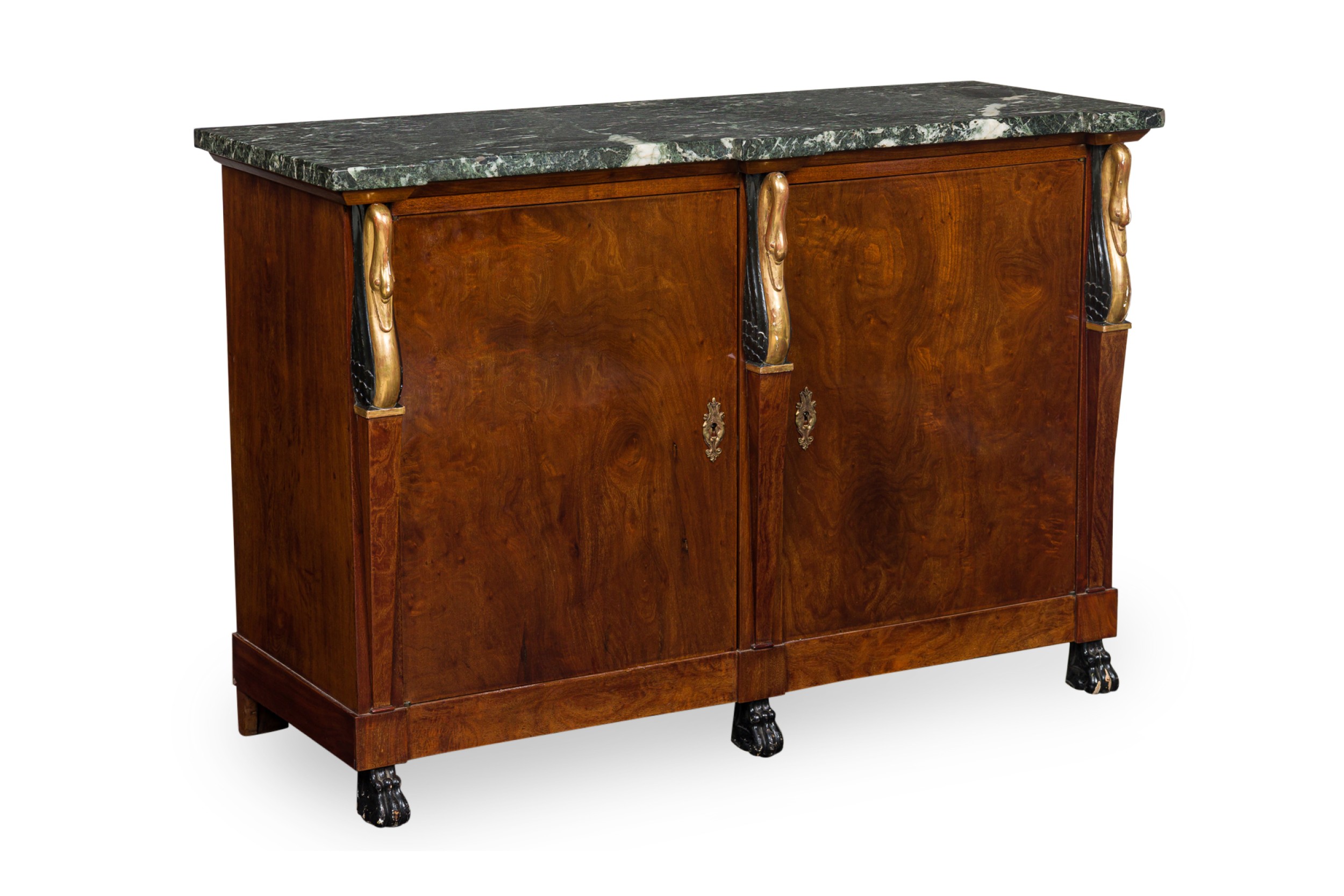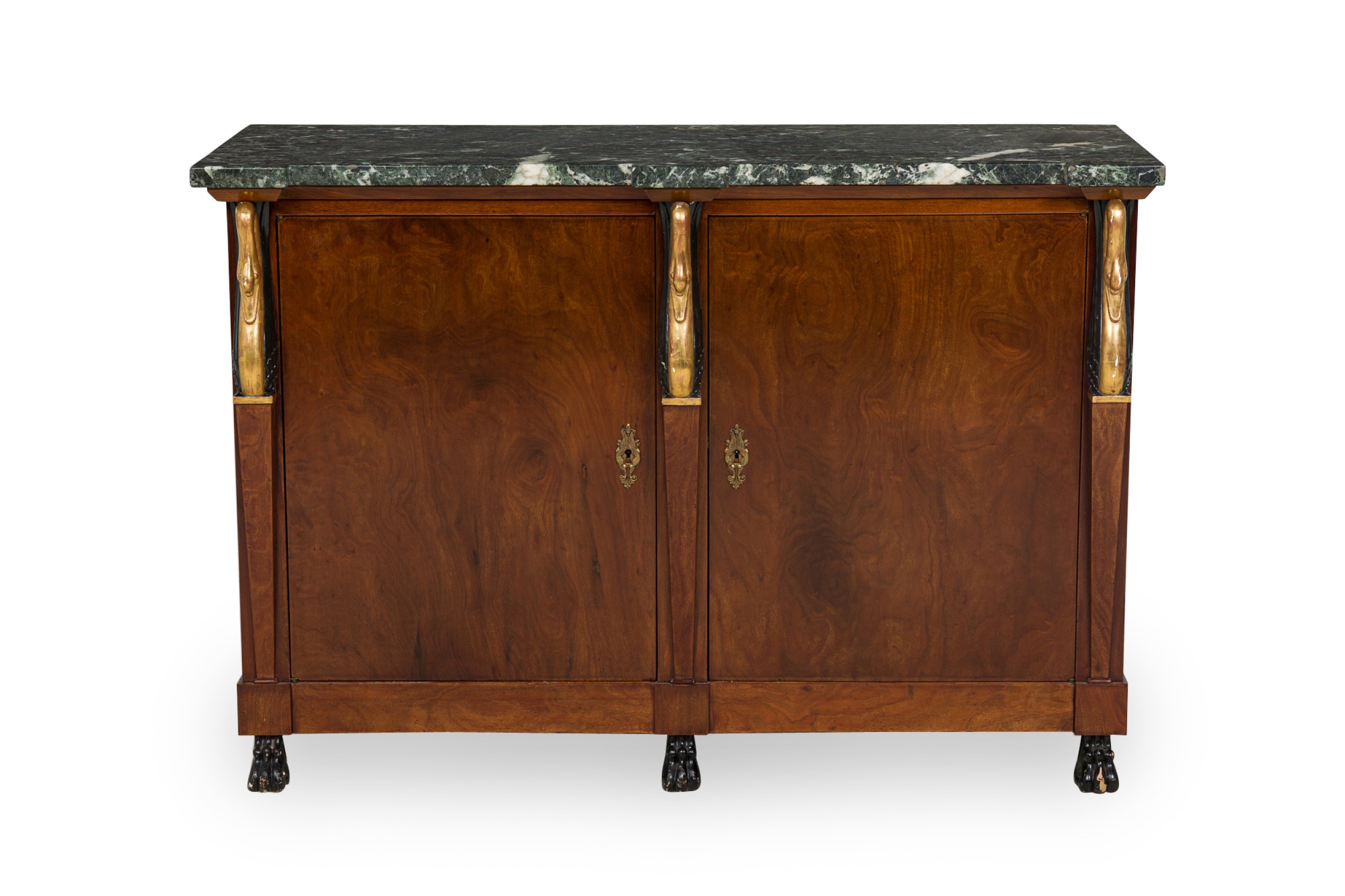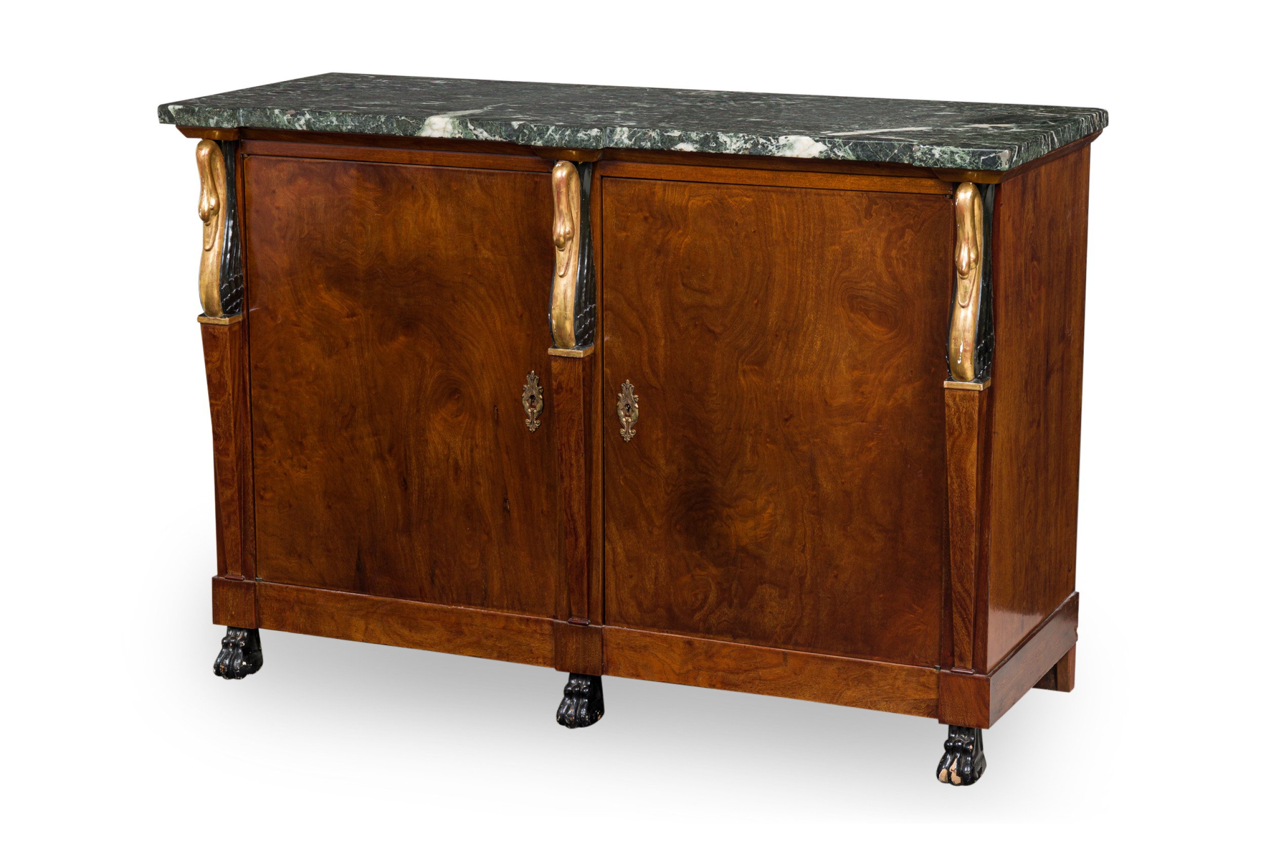 PAIR of Baltic Empire-style (19/20th Century) 2-door credenzas with mahogany cabinets with carved gilt and ebonized swan heads on the front supports, topped with a shaped piece of black / green marble, having two front doors and resting on ebonized carved paw feet. (PRICED AS PAIR)