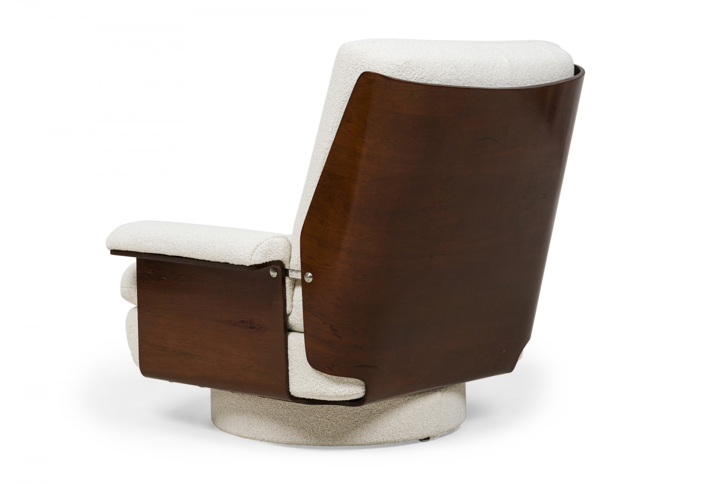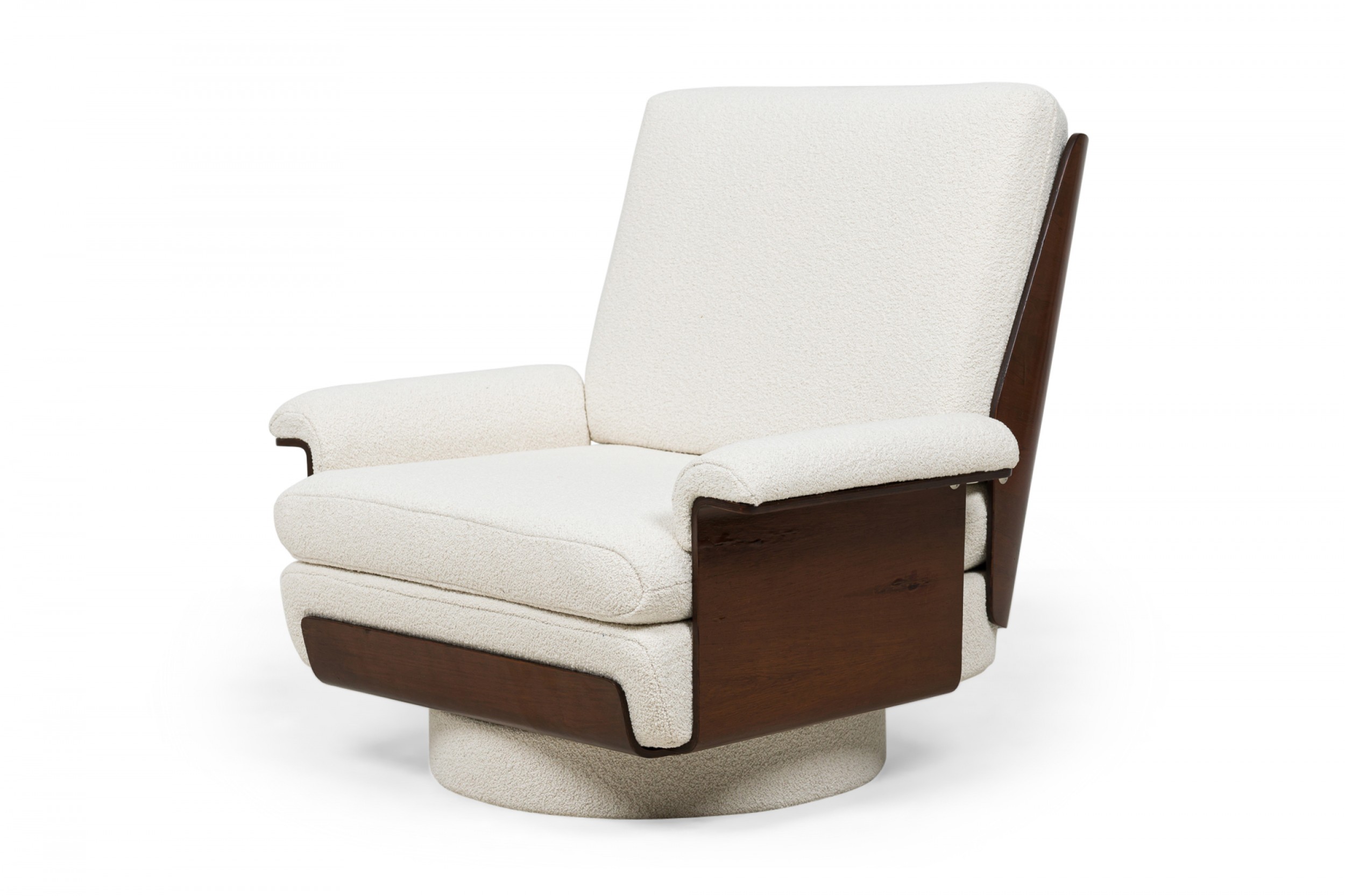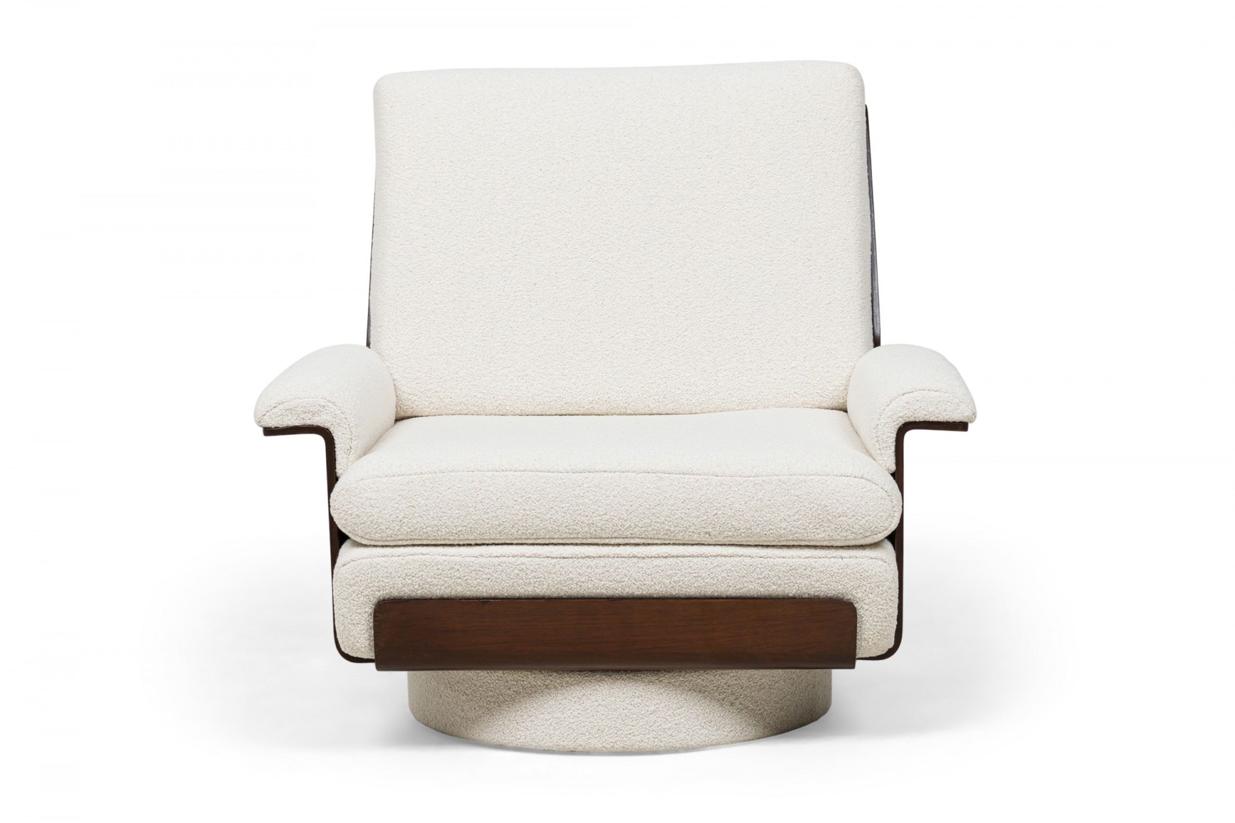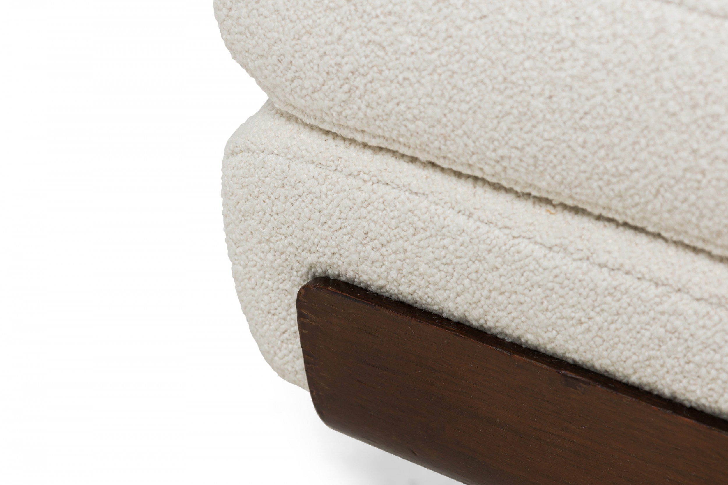 PAIR of Mid-Century French (1970s) rosewood "Viborg" armchairs with low roll arms and square backs upholstered in white bouclé fabric and resting on a solid cylindrical base (2 bolts anchoring the back to the arms. (BERNARD BRUNIER FOR COULON) (PRICED AS PAIR)