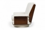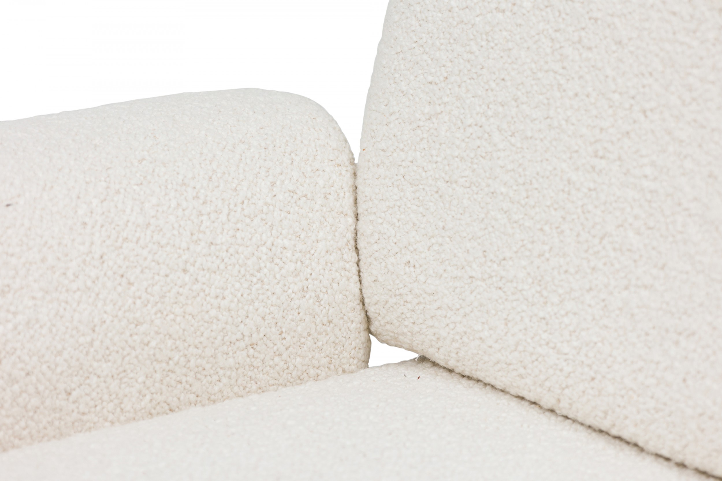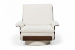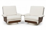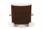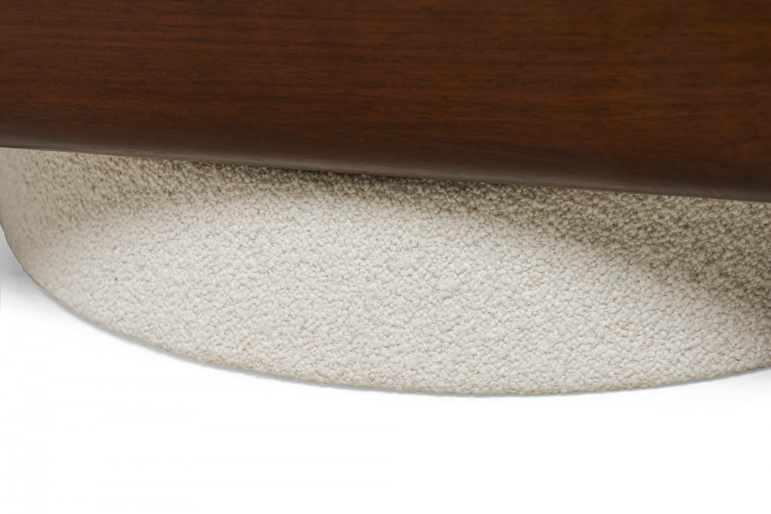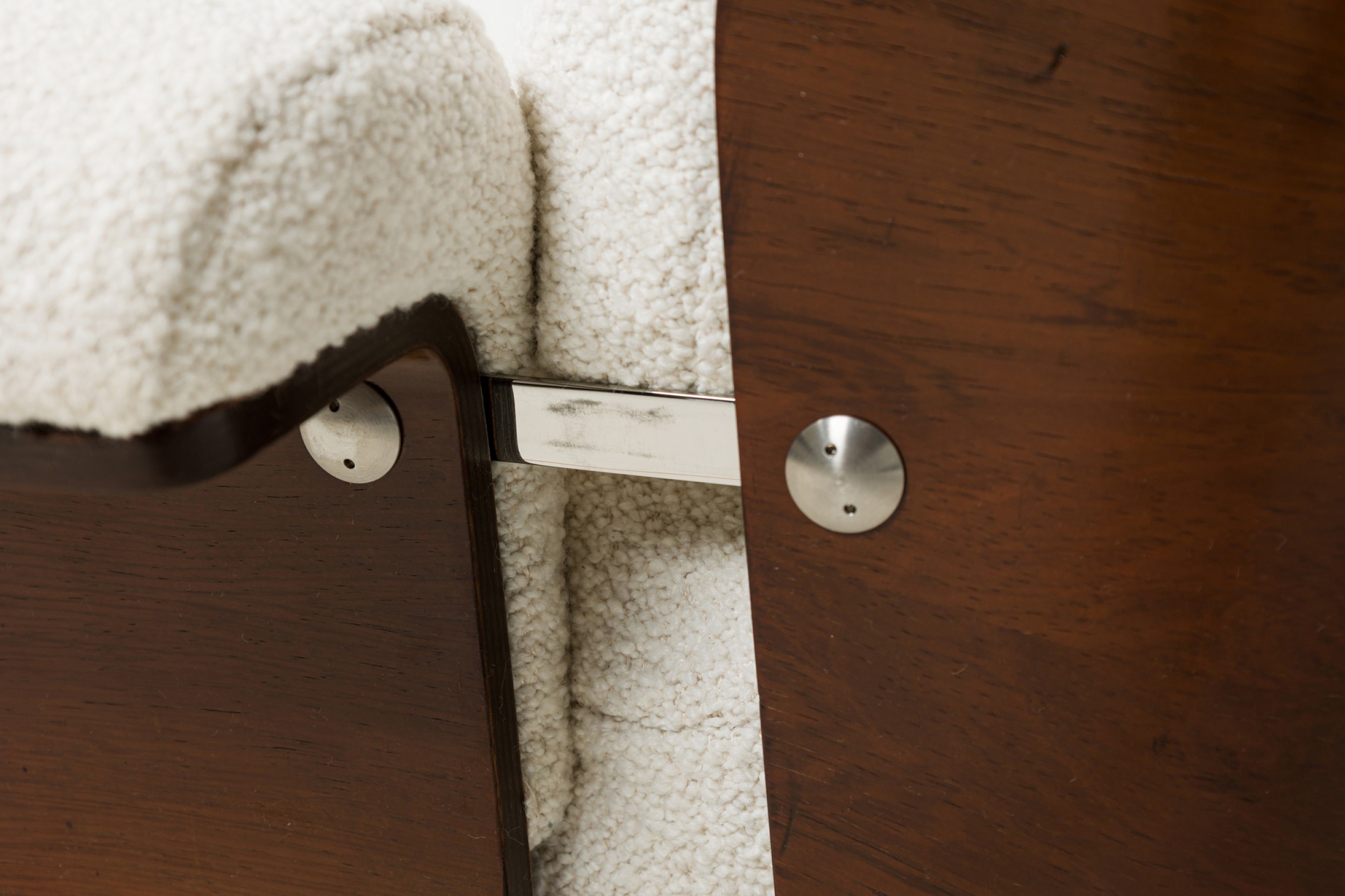 PAIR of Mid-Century French (1970s) rosewood "Viborg" armchairs with low roll arms and square backs upholstered in white bouclé fabric and resting on a solid cylindrical base (2 bolts anchoring the back to the arms. (BERNARD BRUNIER FOR COULON) (PRICED AS PAIR)