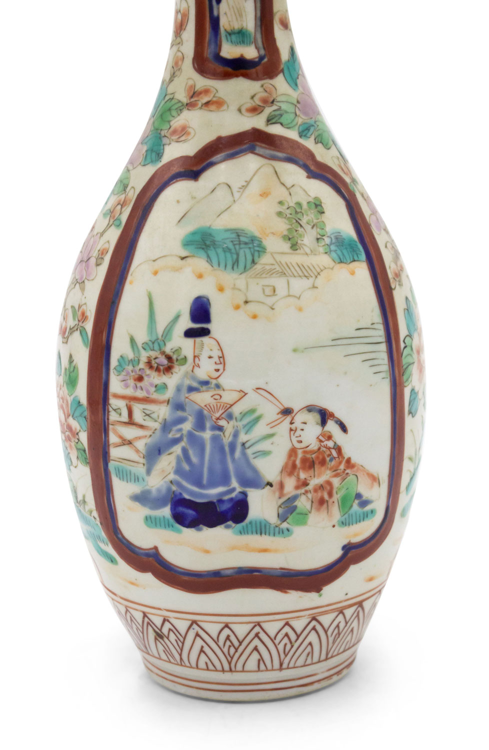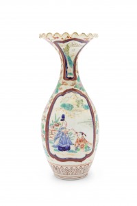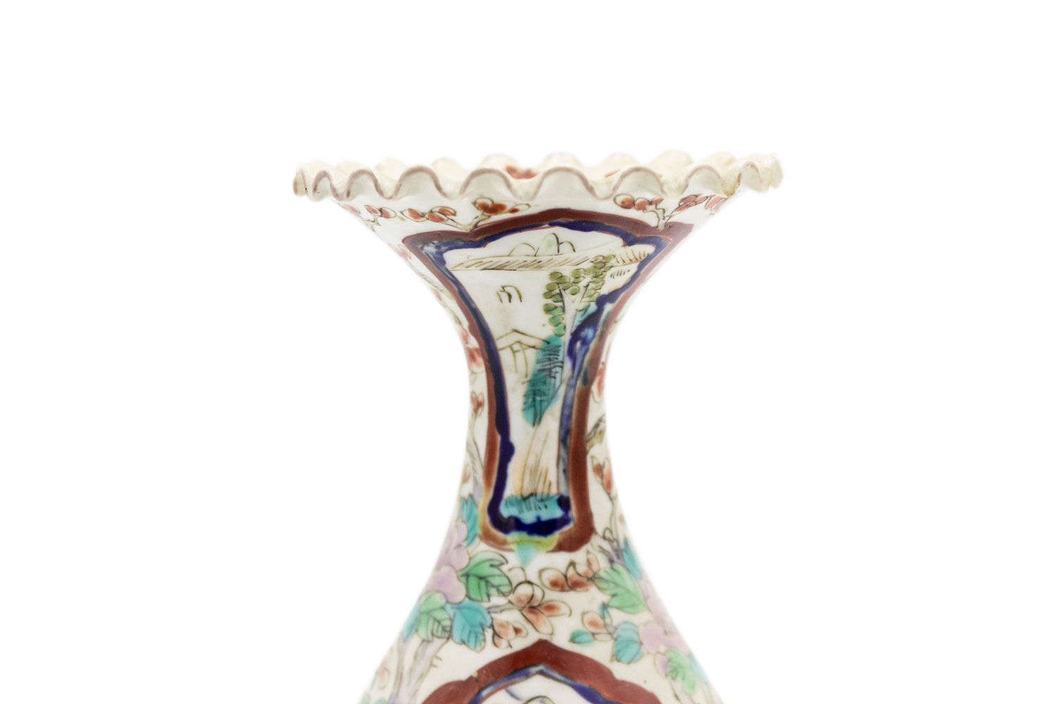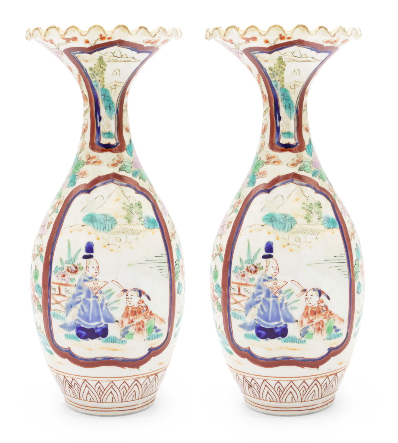 PAIR of Asian Chinese Imari (18th Cent) porcelain small vases with a scalloped top and scenes of figures and flowers. (Small chip to 1 top) (PRICED AS PAIR)
