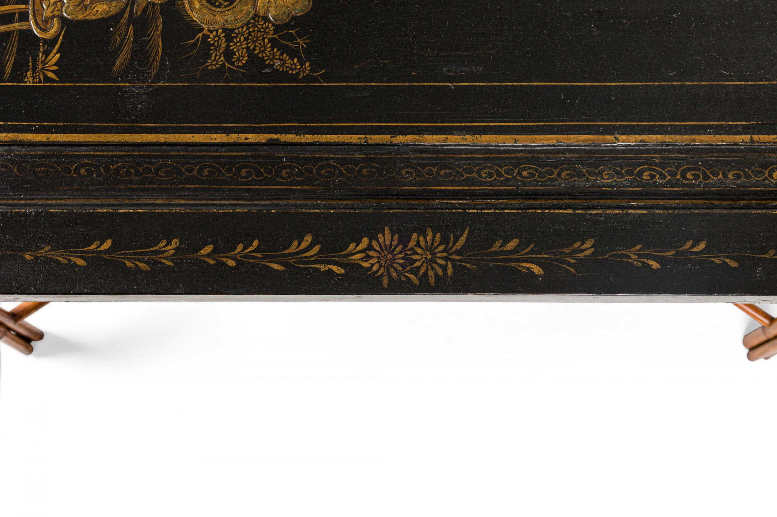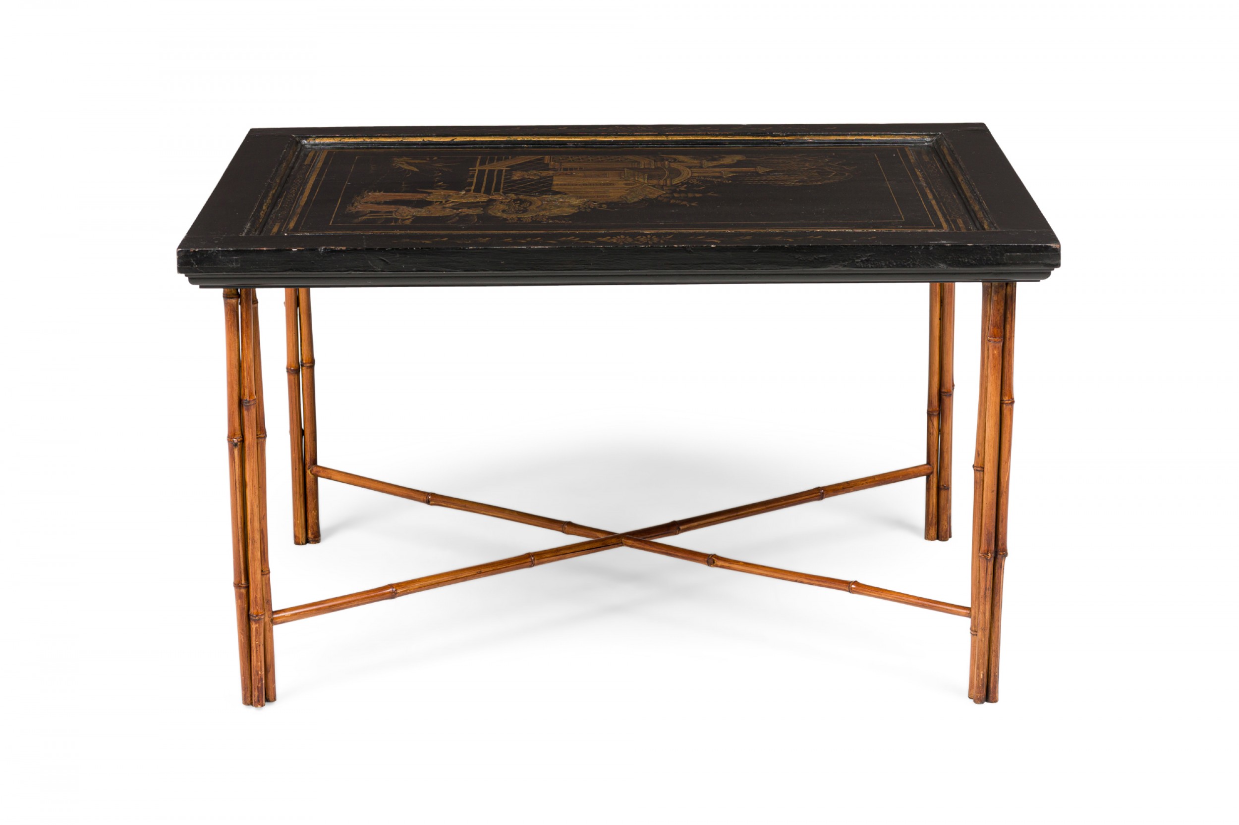 PAIR of similar Chinese end tables with black lacquered panel tops (19th Century) having figural and parcel gilt highlights within an inset painted floral border resting on bamboo cluster legs connectec by an X-stretcher. (PRICED AS PAIR) (Prov: Estate of Michael Taylor).