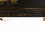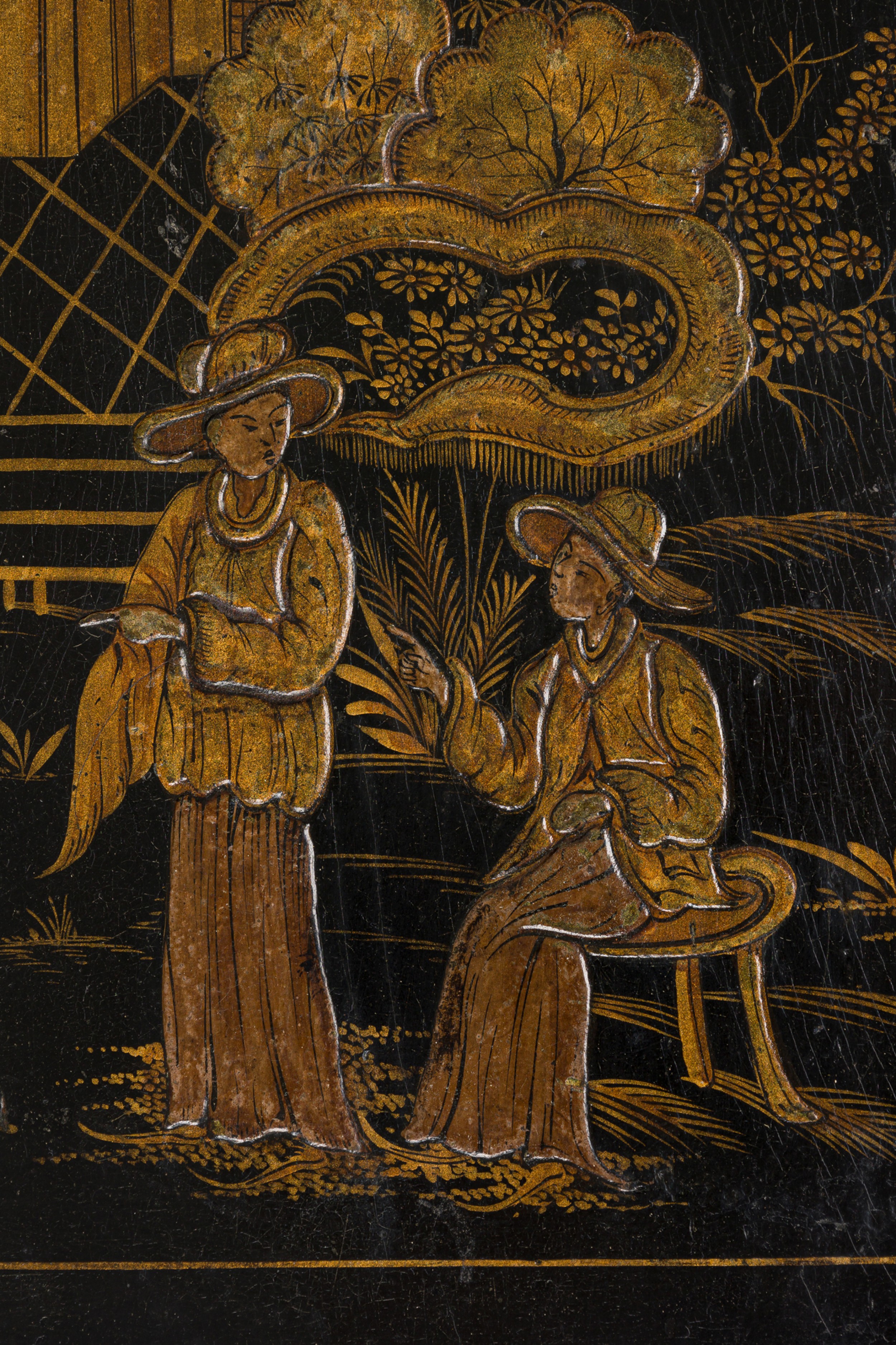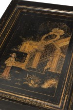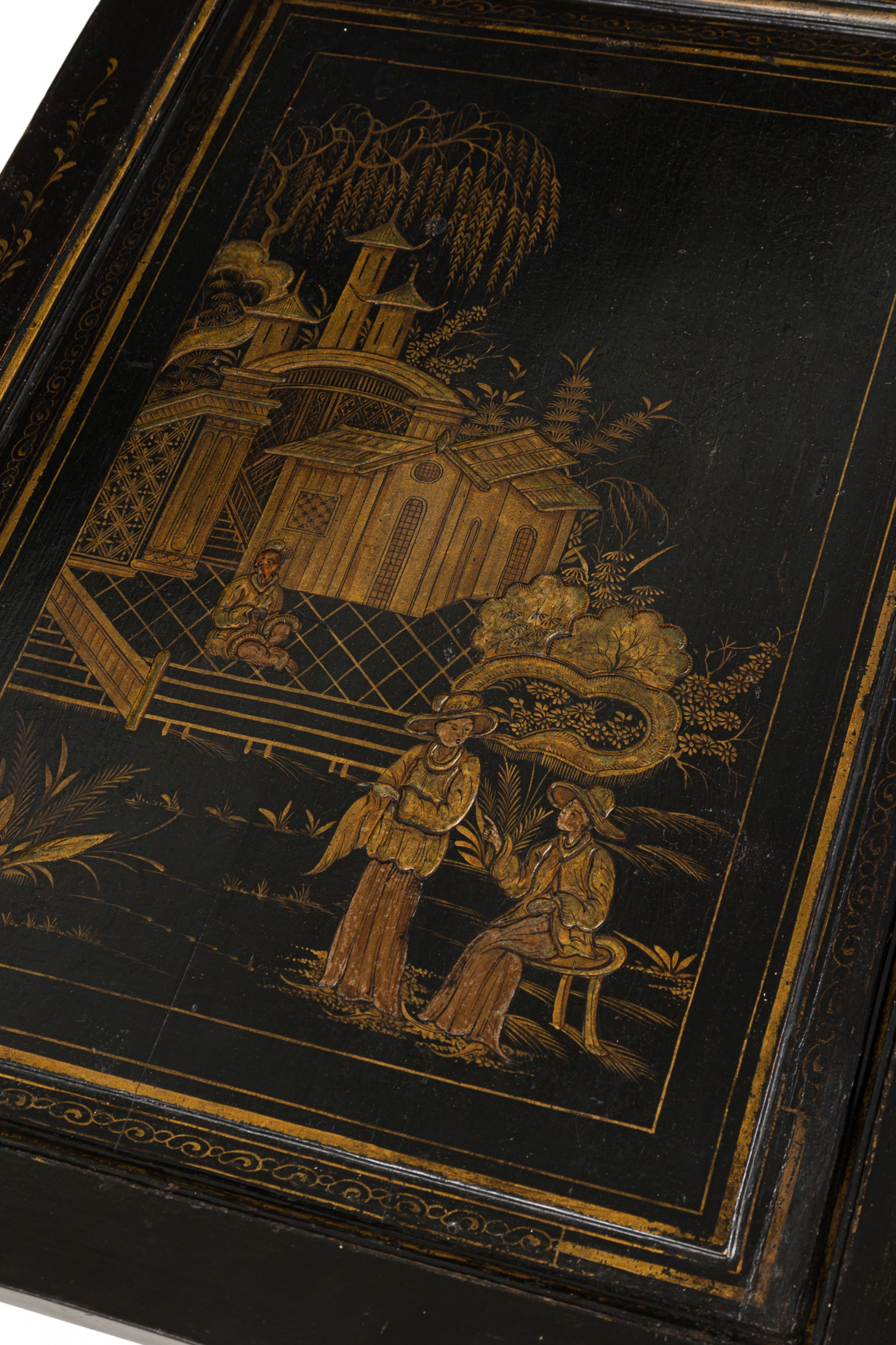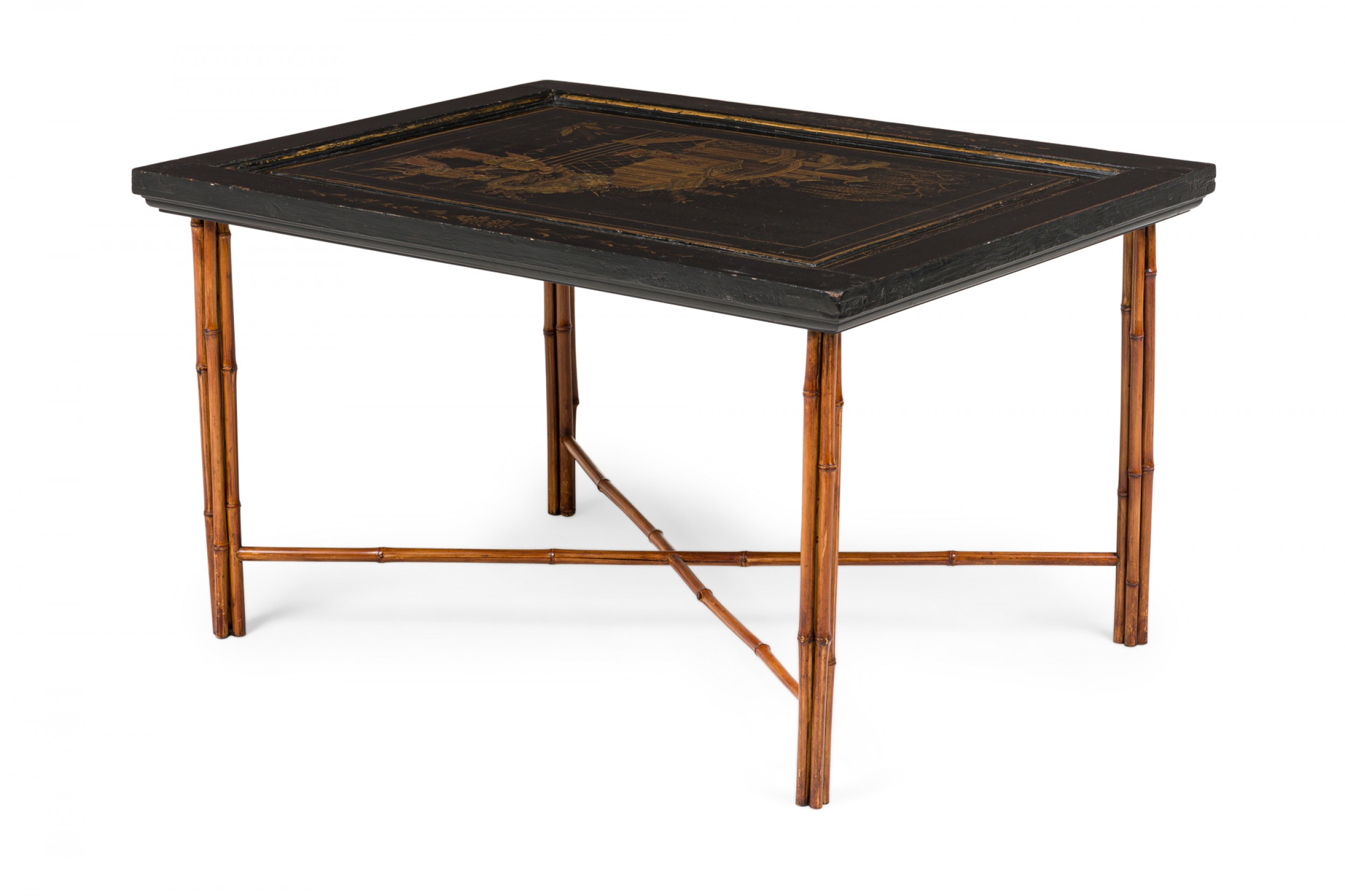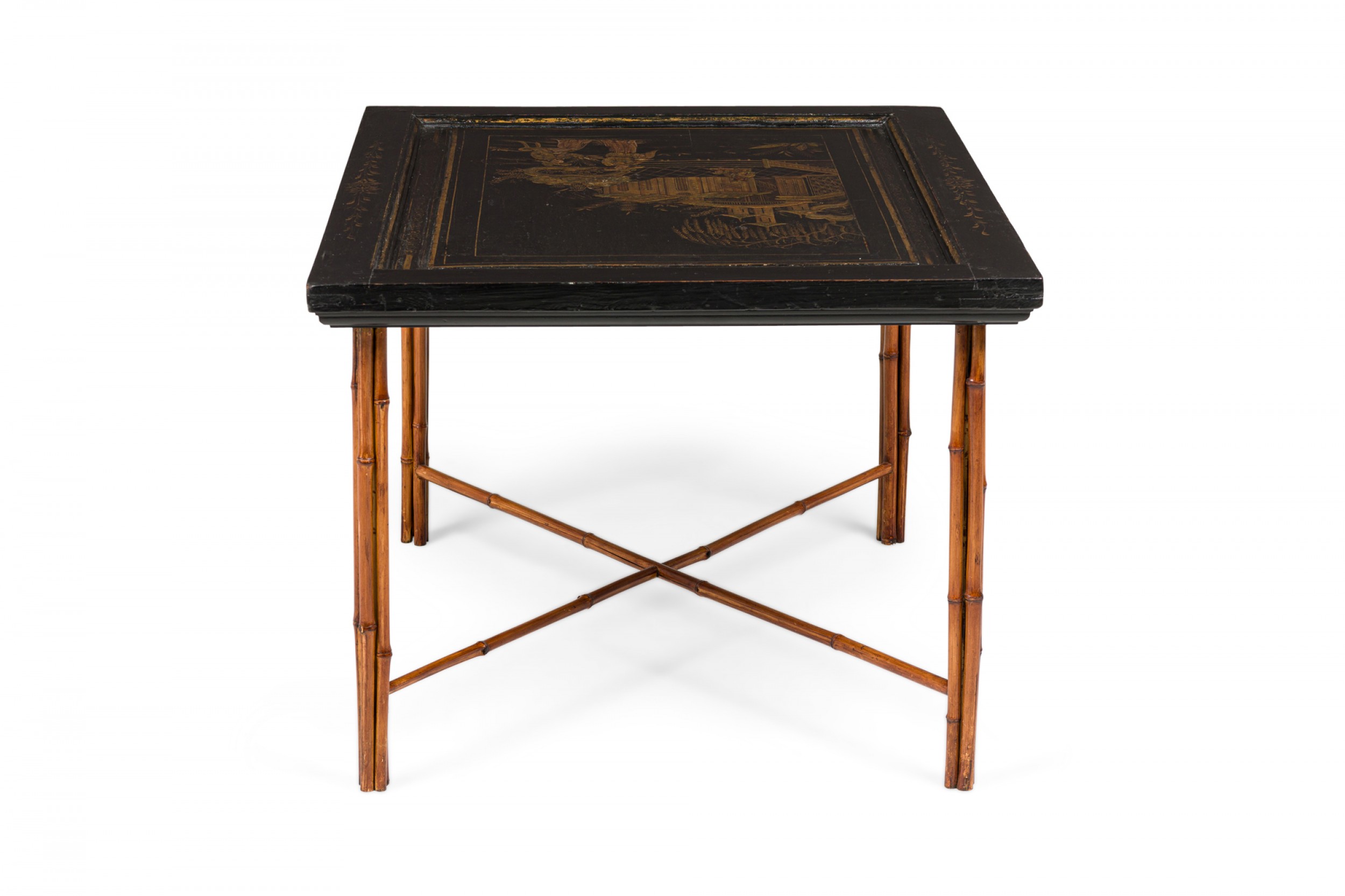 PAIR of similar Chinese end tables with black lacquered panel tops (19th Century) having figural and parcel gilt highlights within an inset painted floral border resting on bamboo cluster legs connectec by an X-stretcher. (PRICED AS PAIR) (Prov: Estate of Michael Taylor)
