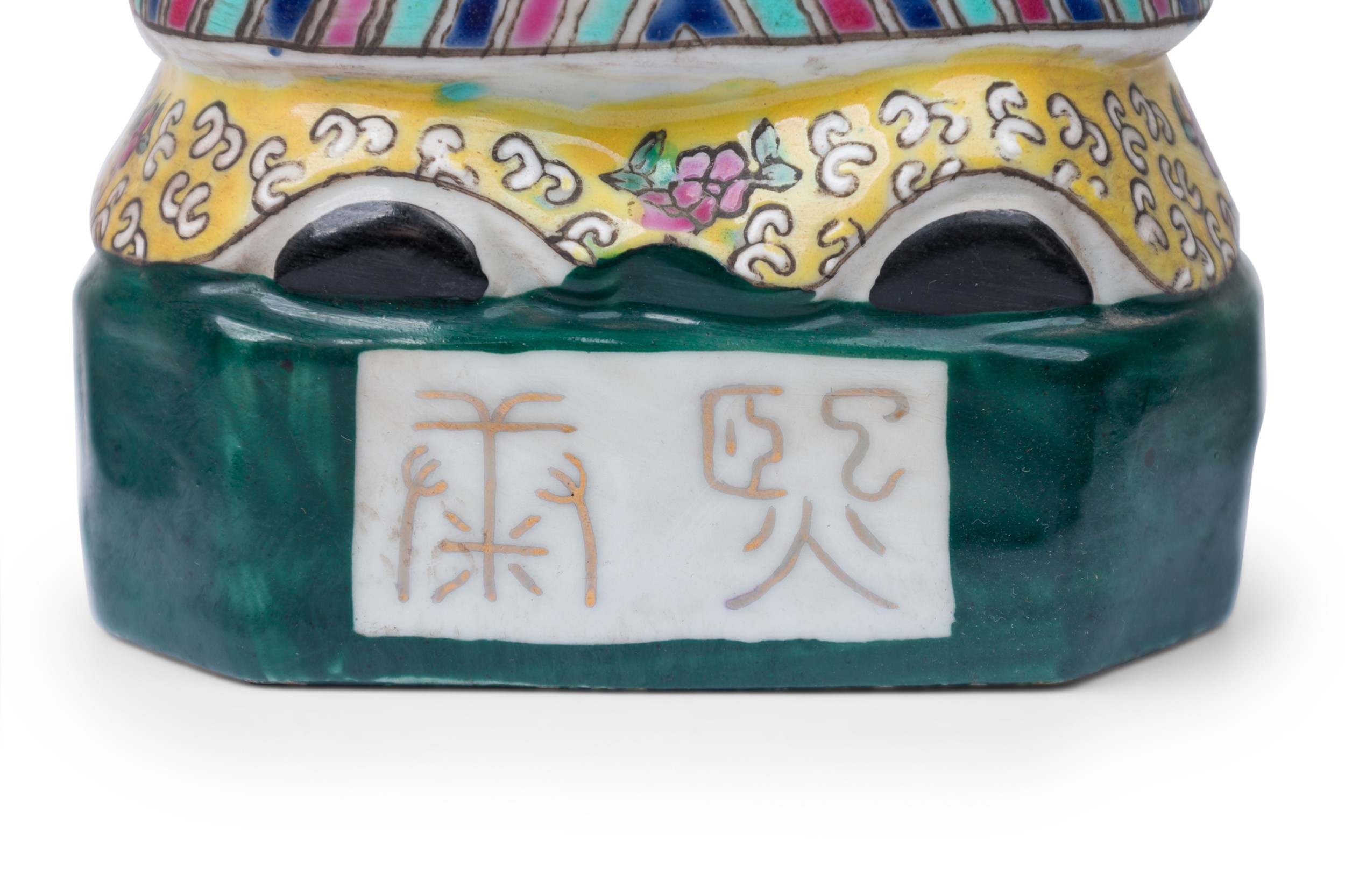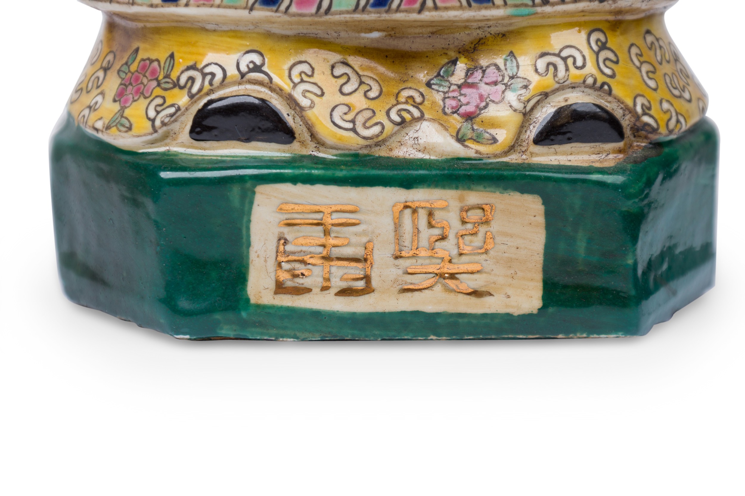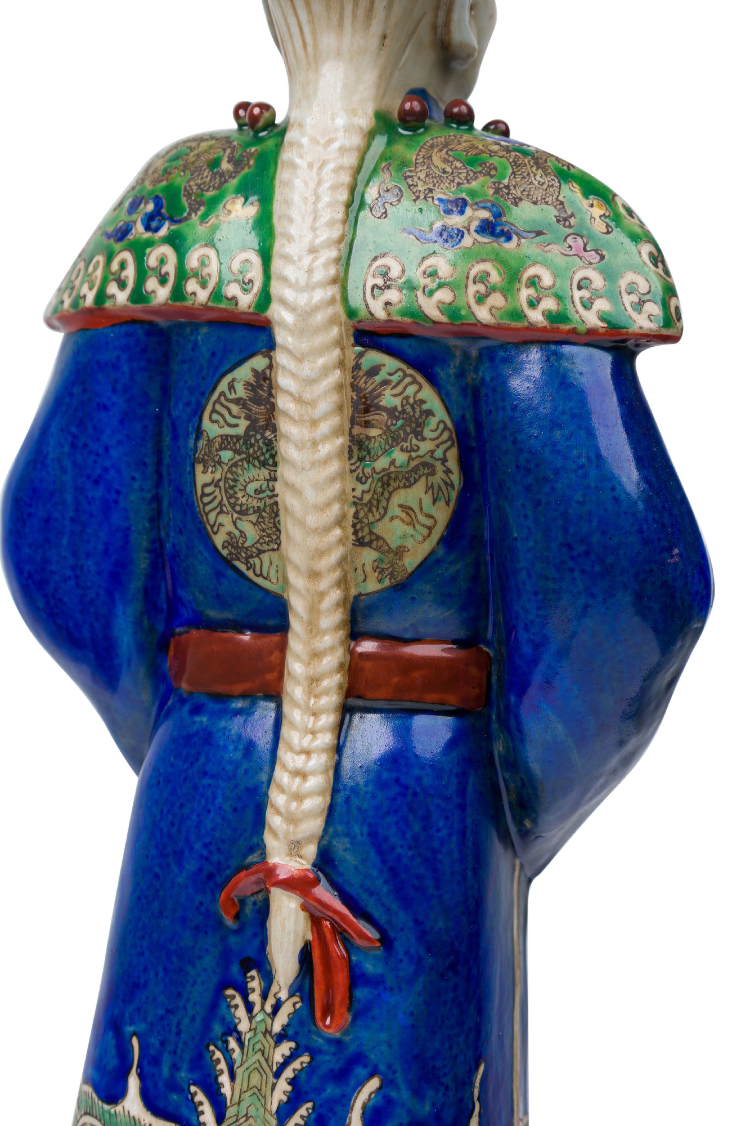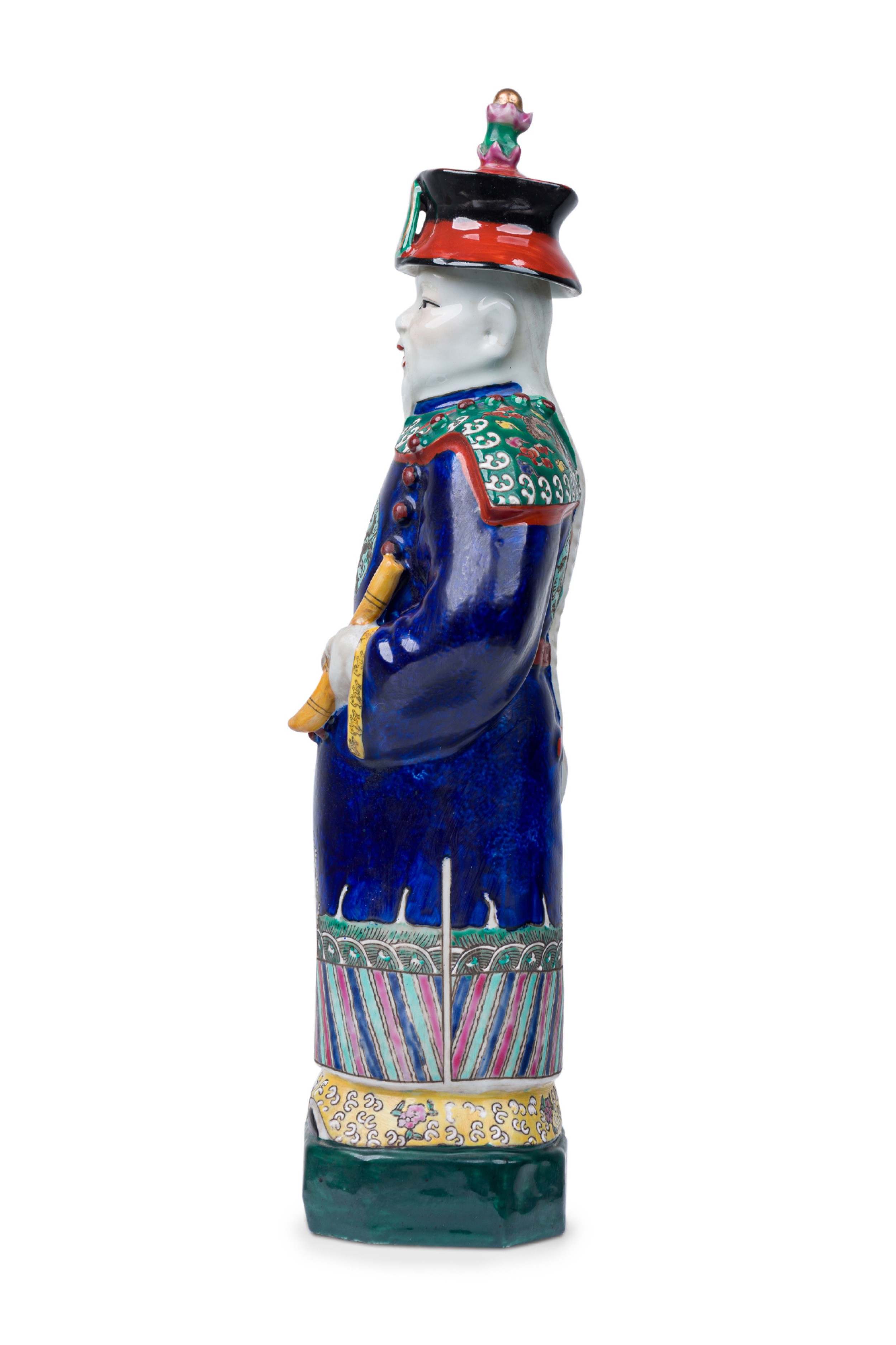 PAIR of Chinese (20th Century) decorated glazed ceramic figures of an emperor in a formal blue robe with dragon medallion holding a bamboo pipe standing on an octagonal base featuring a calligraphic rectangular front panel. (PRICED AS PAIR) (similar pair: 063770)
