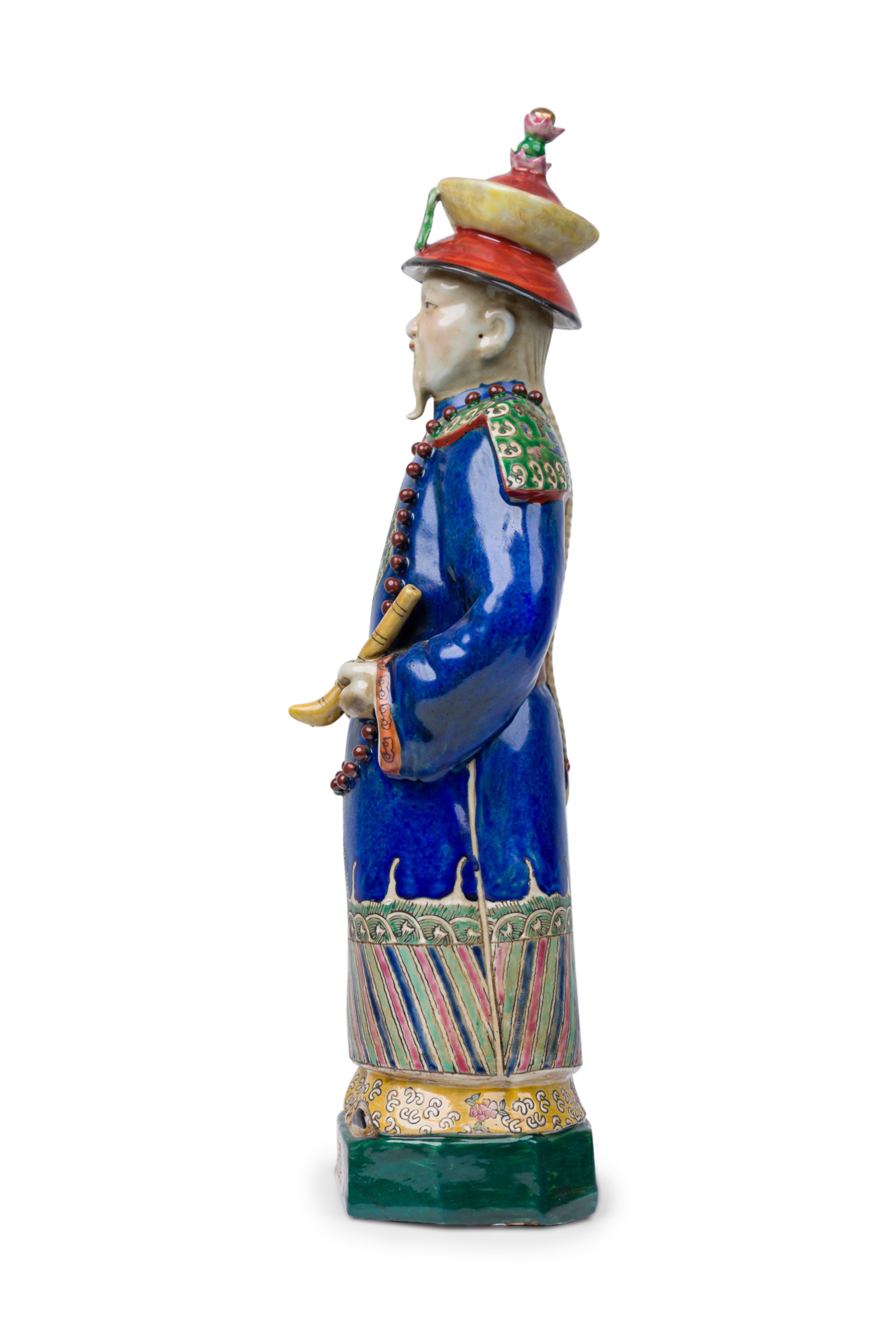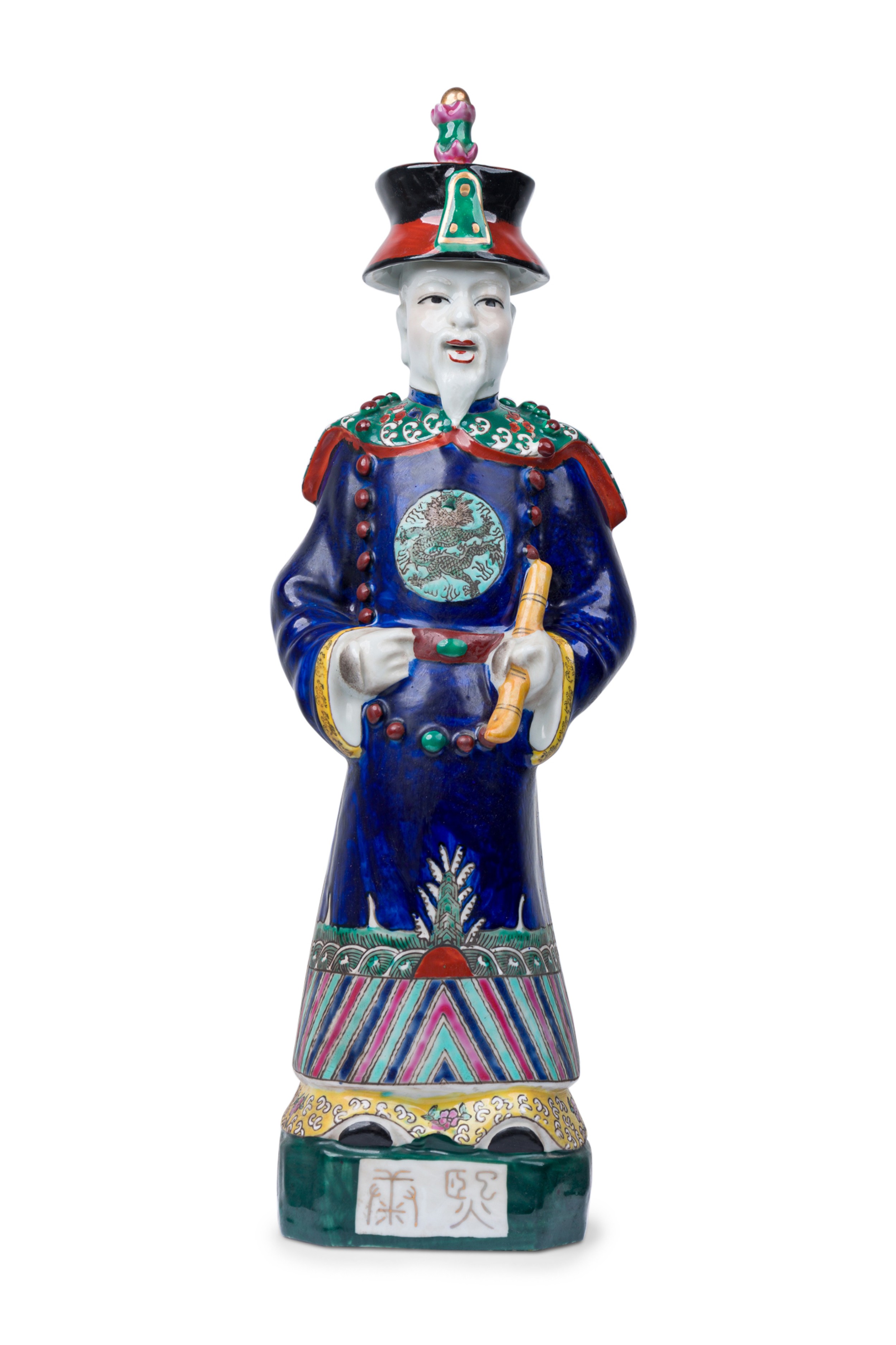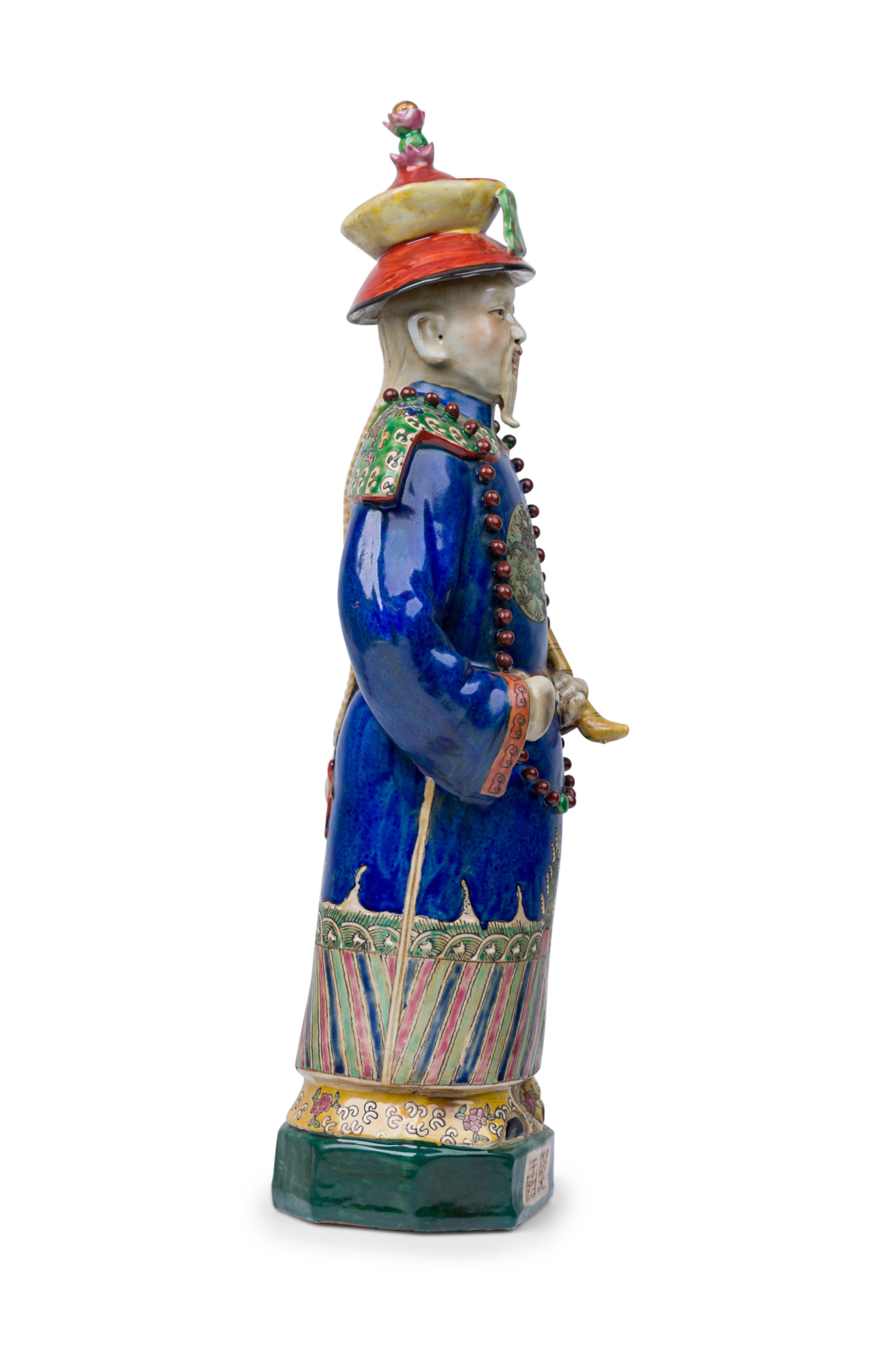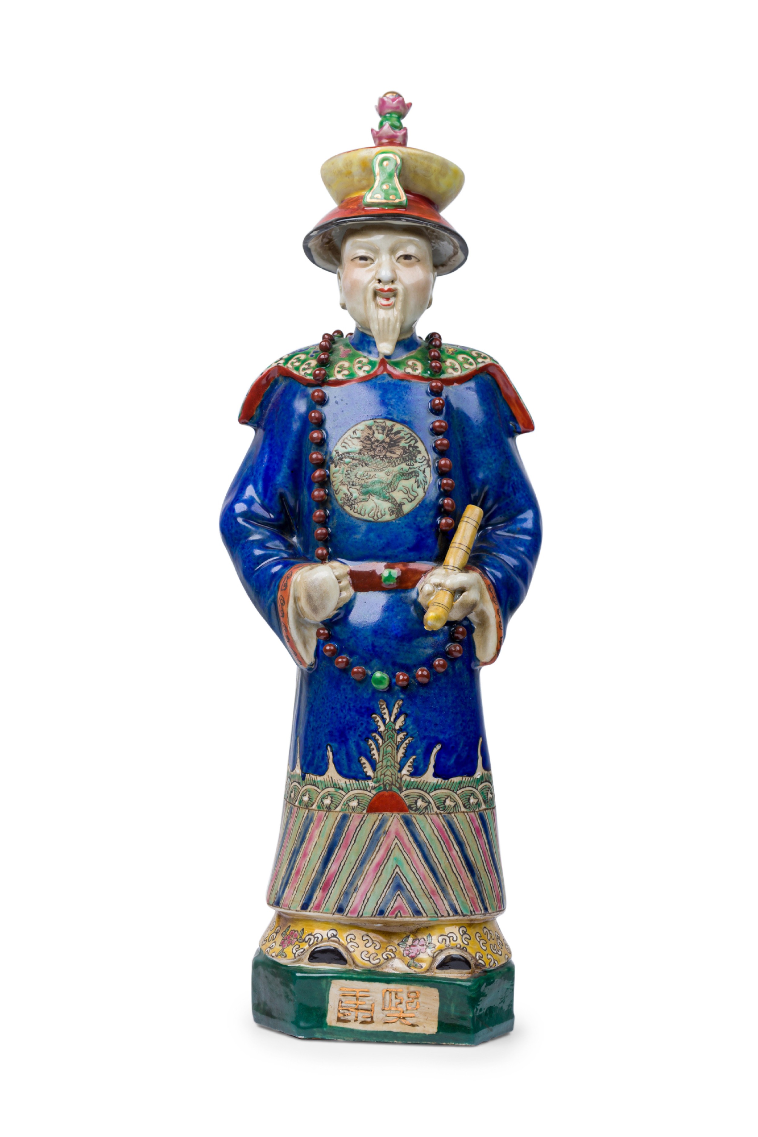 Pair of Chinese Painted Ceramic Figures Depicting a Blue Robed Emperor