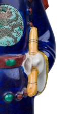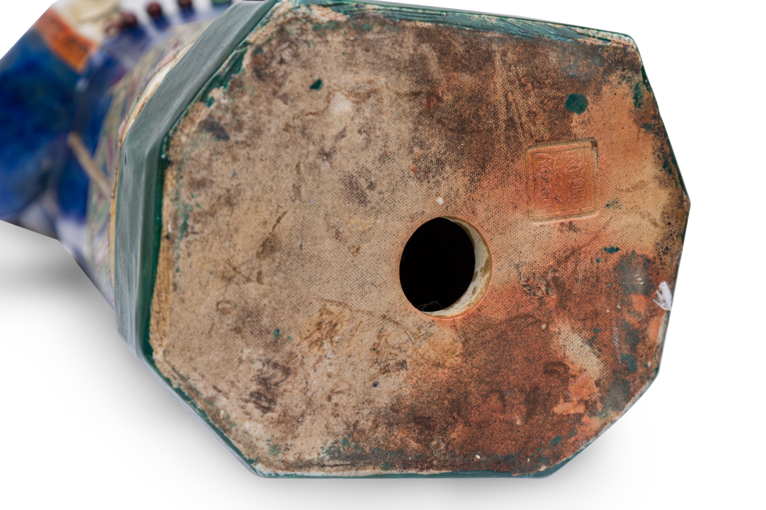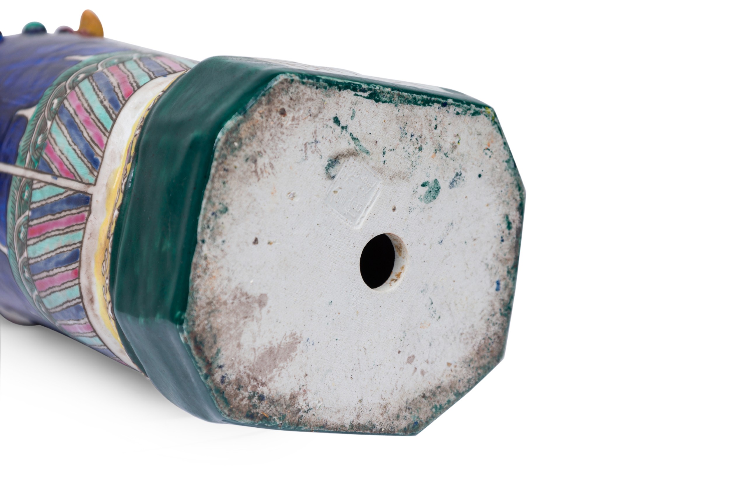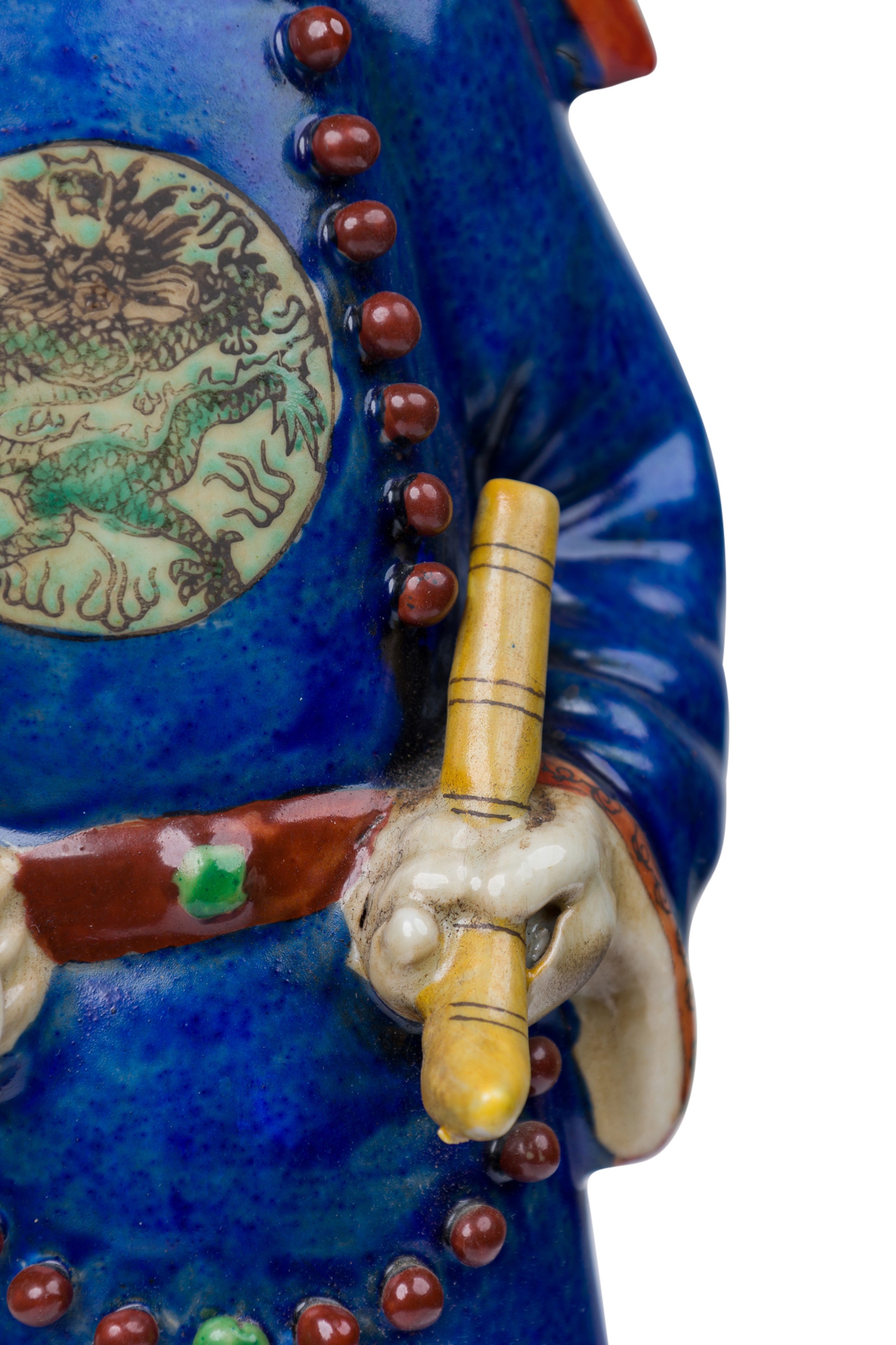 PAIR of Chinese (20th Century) decorated glazed ceramic figures of an emperor in a formal blue robe with dragon medallion holding a bamboo pipe standing on an octagonal base featuring a calligraphic rectangular front panel. (PRICED AS PAIR) (similar pair: 063770).