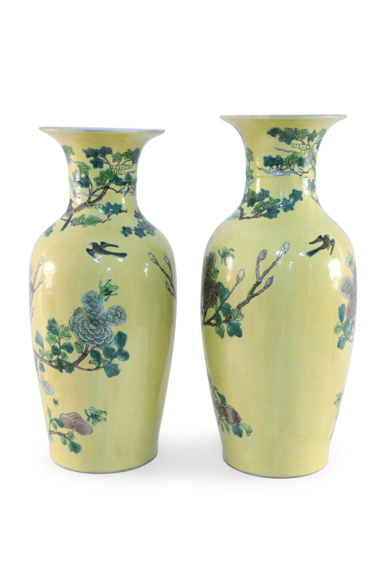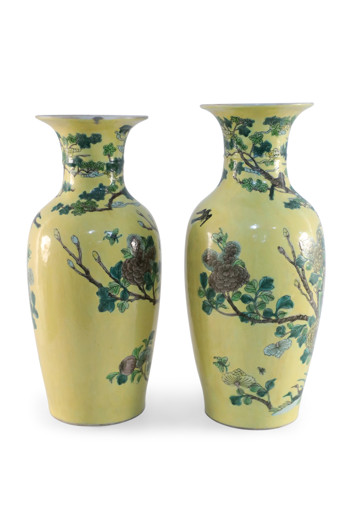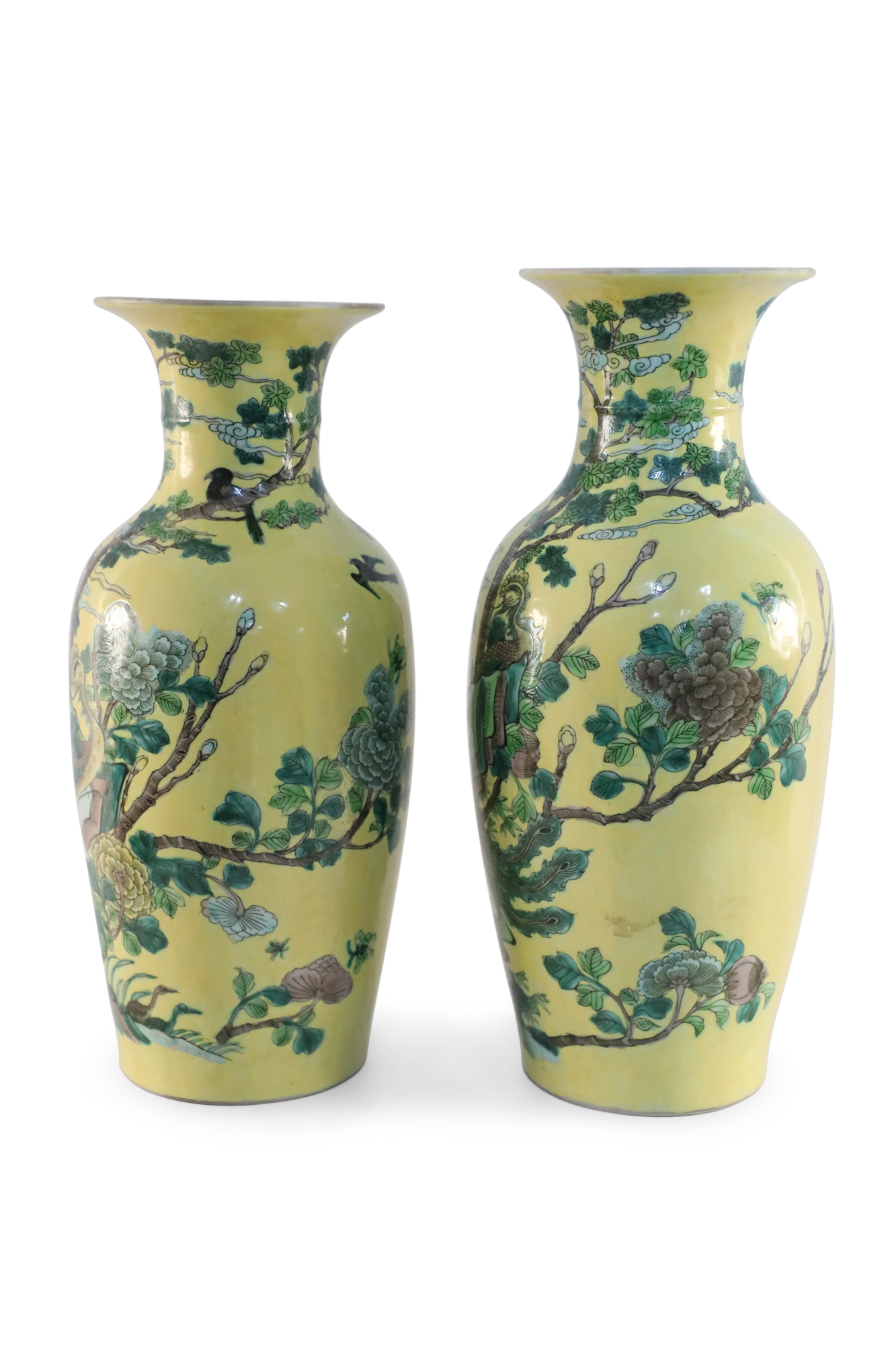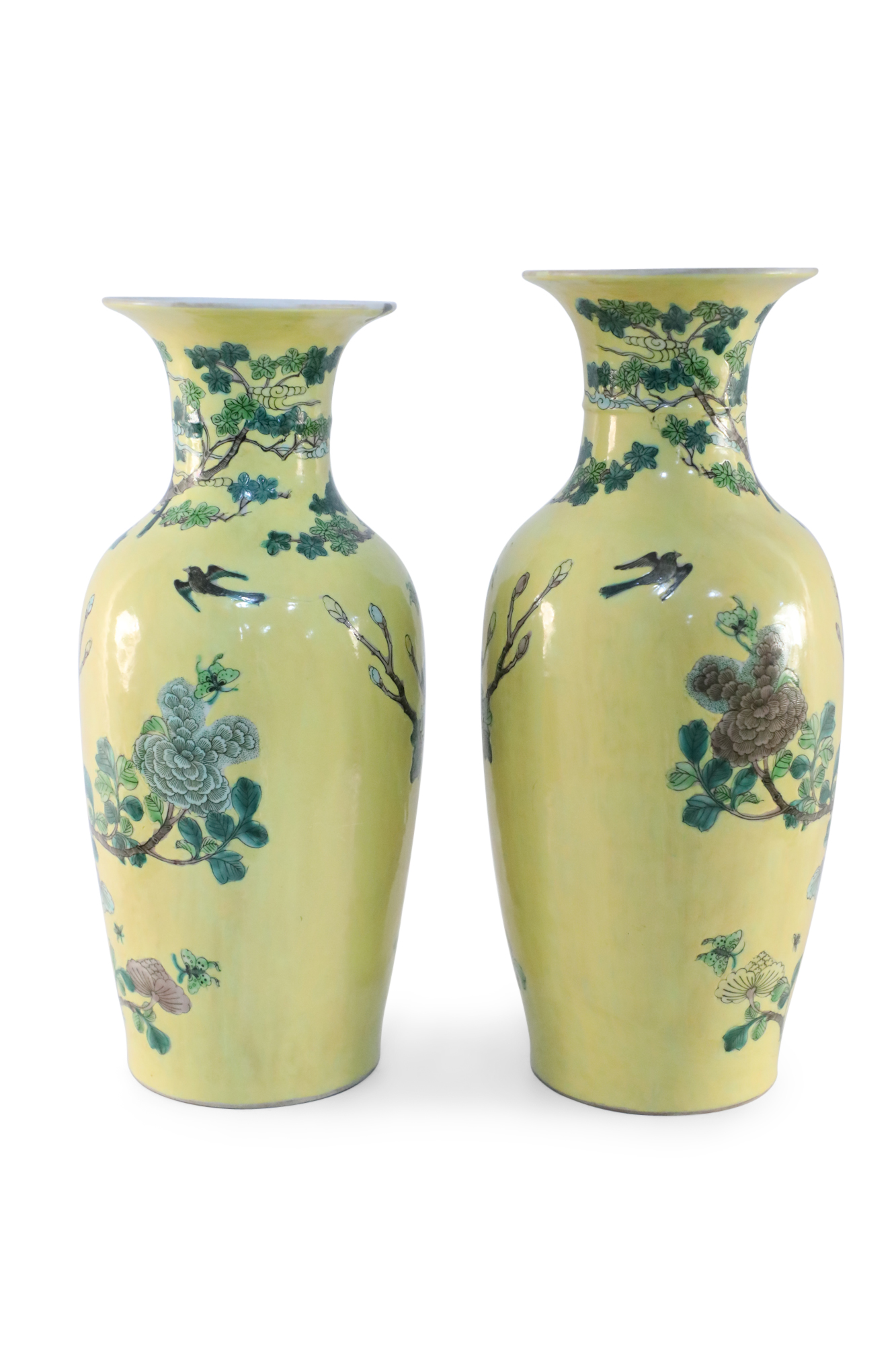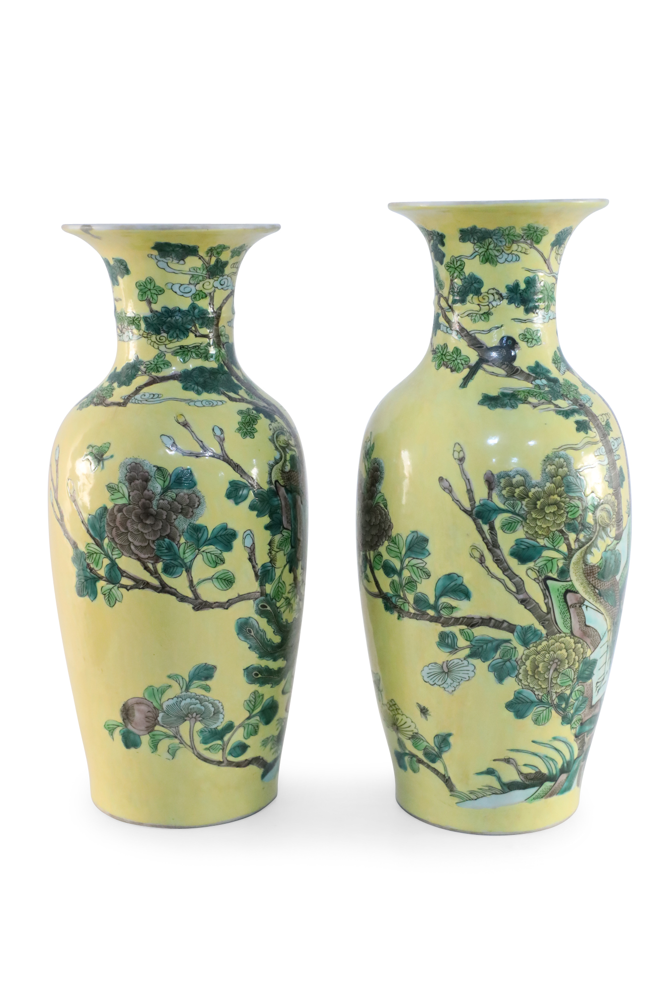 PAIR of antique Chinese (late 19th-early 20th Century) export porcelain yellow ceramic vases wrapped in large scale branches teeming with birds, flowers and foliage (PRICED AS PAIR).