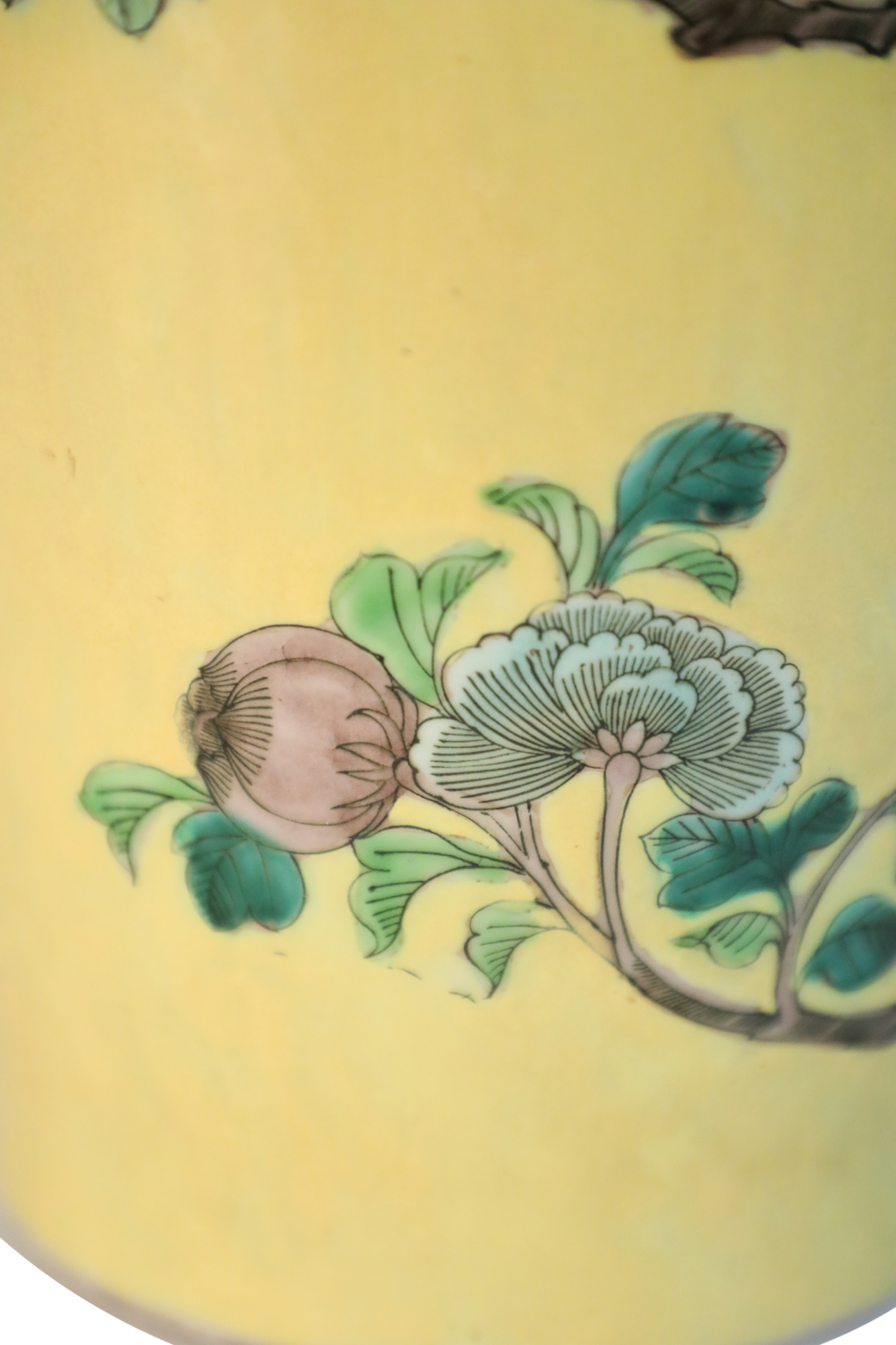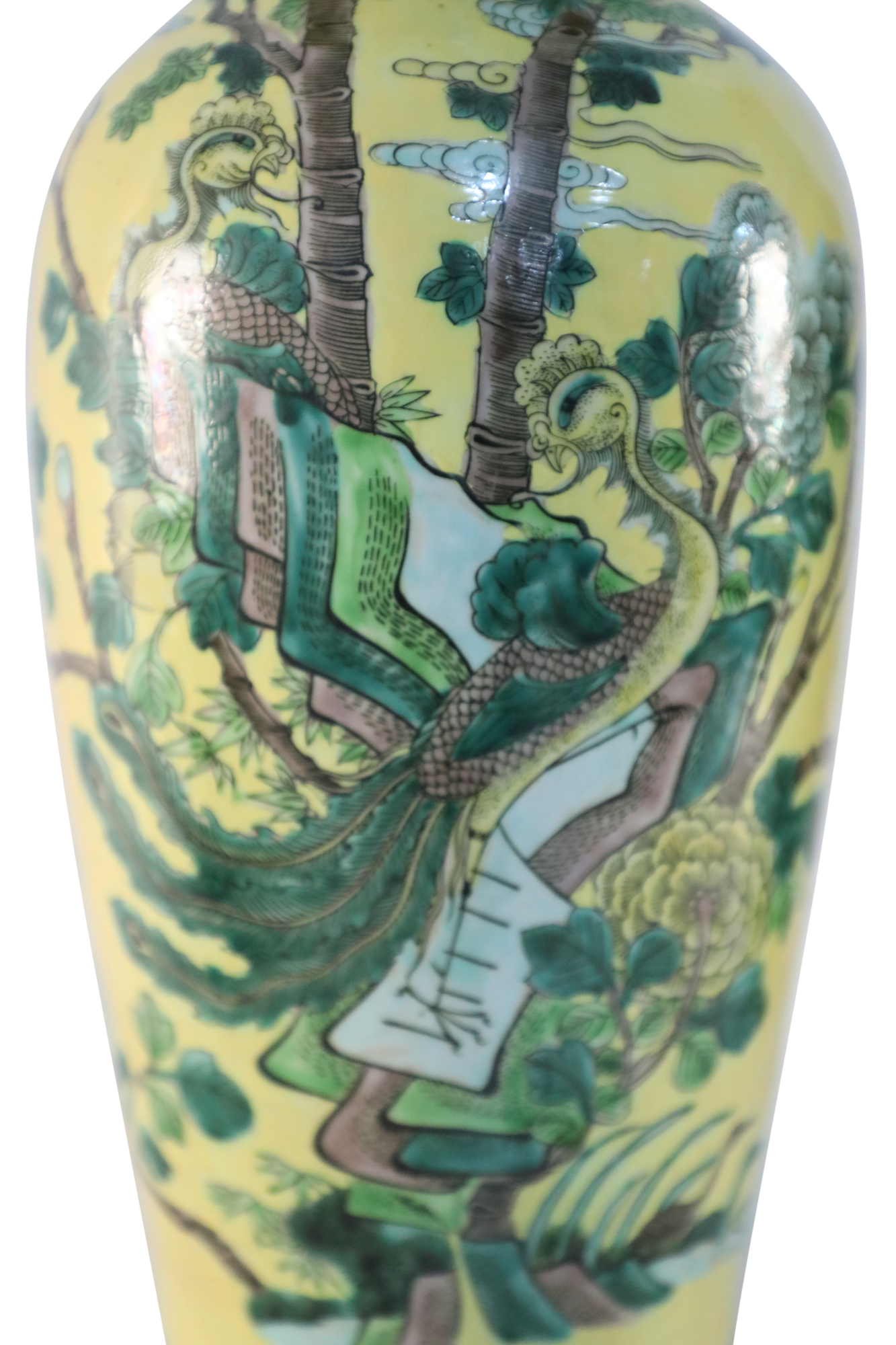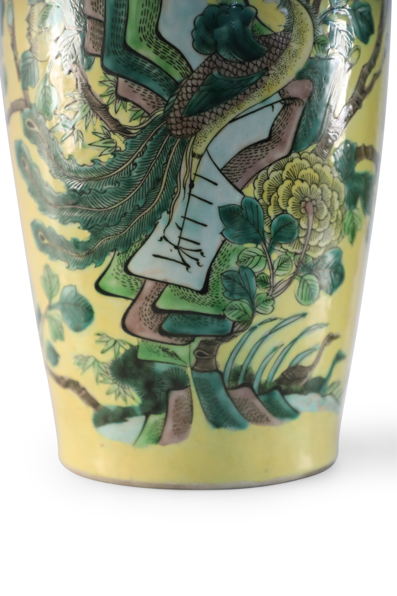 PAIR of antique Chinese (late 19th-early 20th Century) export porcelain yellow ceramic vases wrapped in large scale branches teeming with birds, flowers and foliage (PRICED AS PAIR)..