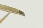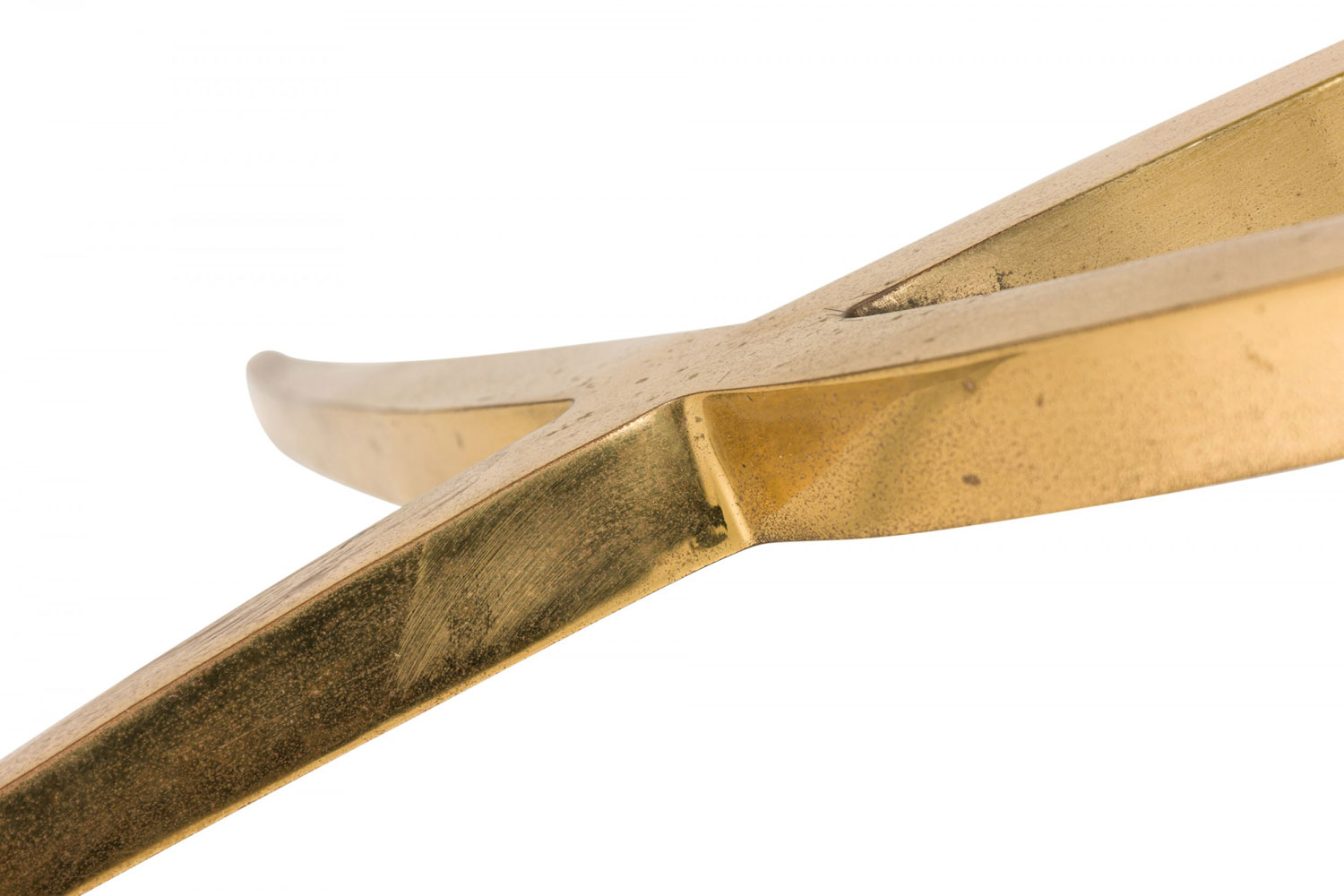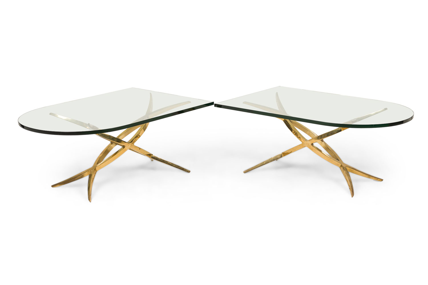 PAIR of Contemporary American bronze tables in a curved, tapered "X" form intersecting at the center points, topped with clear demilune glass tops that can be adjoined to create a larger table or used independently. (PRICED AS PAIR).