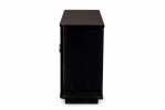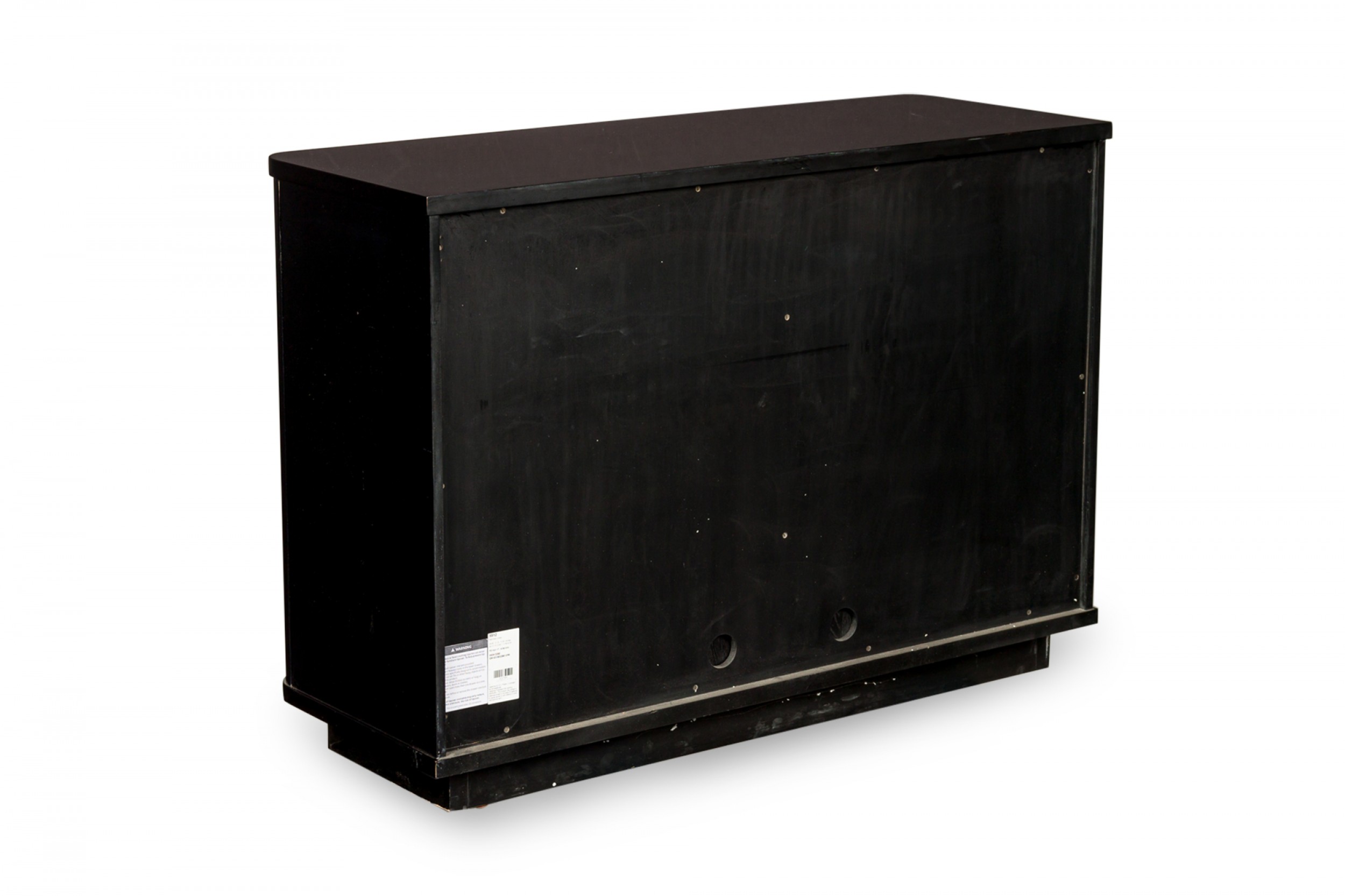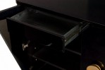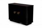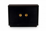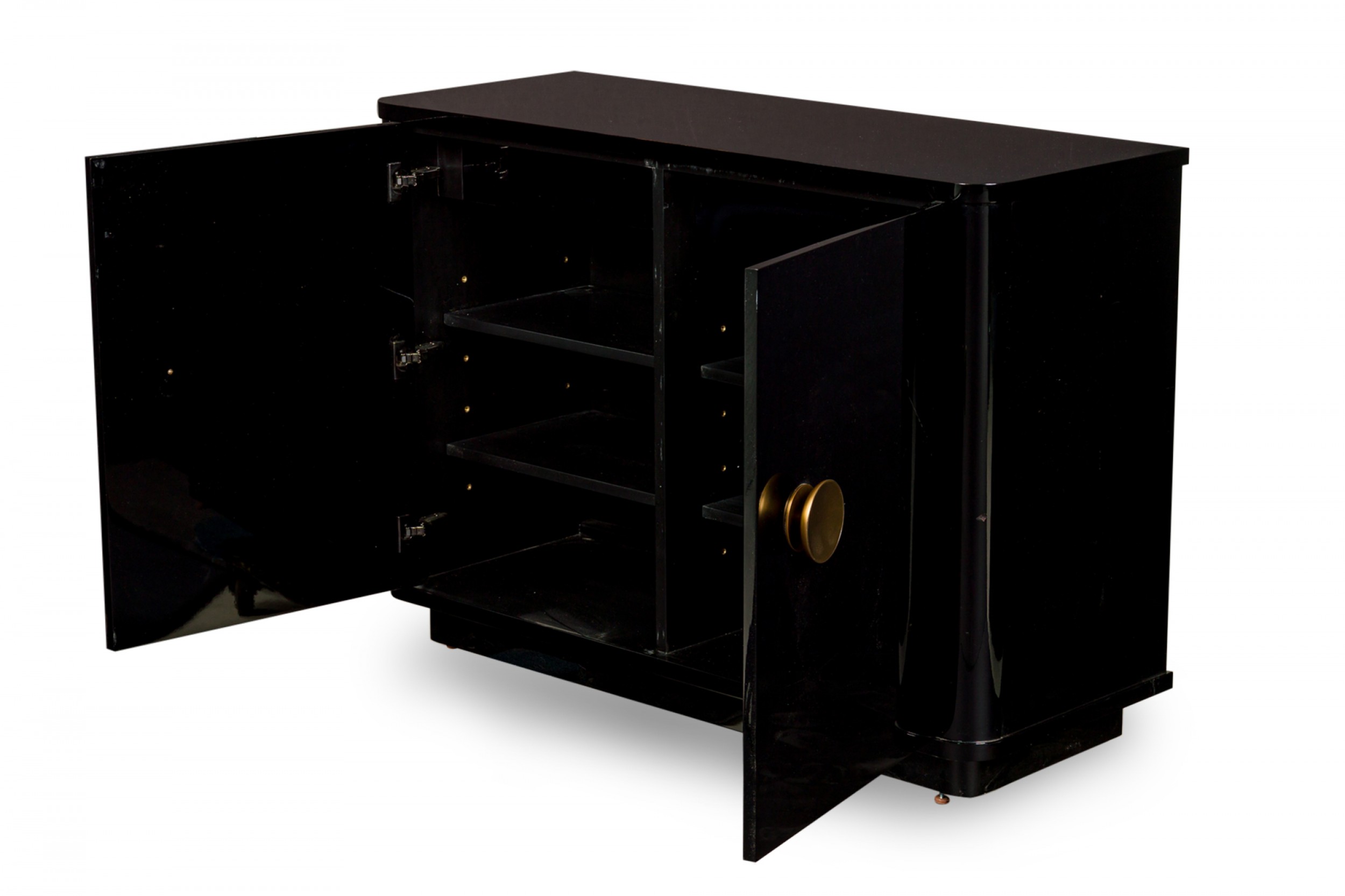PAIR of Contemporary commode cabinets with a black lacquered exterior and two cabinet doors with circular gilt metal door handles that open to reveal two upper drawers and three interior shelves. (PRICED AS PAIR)