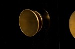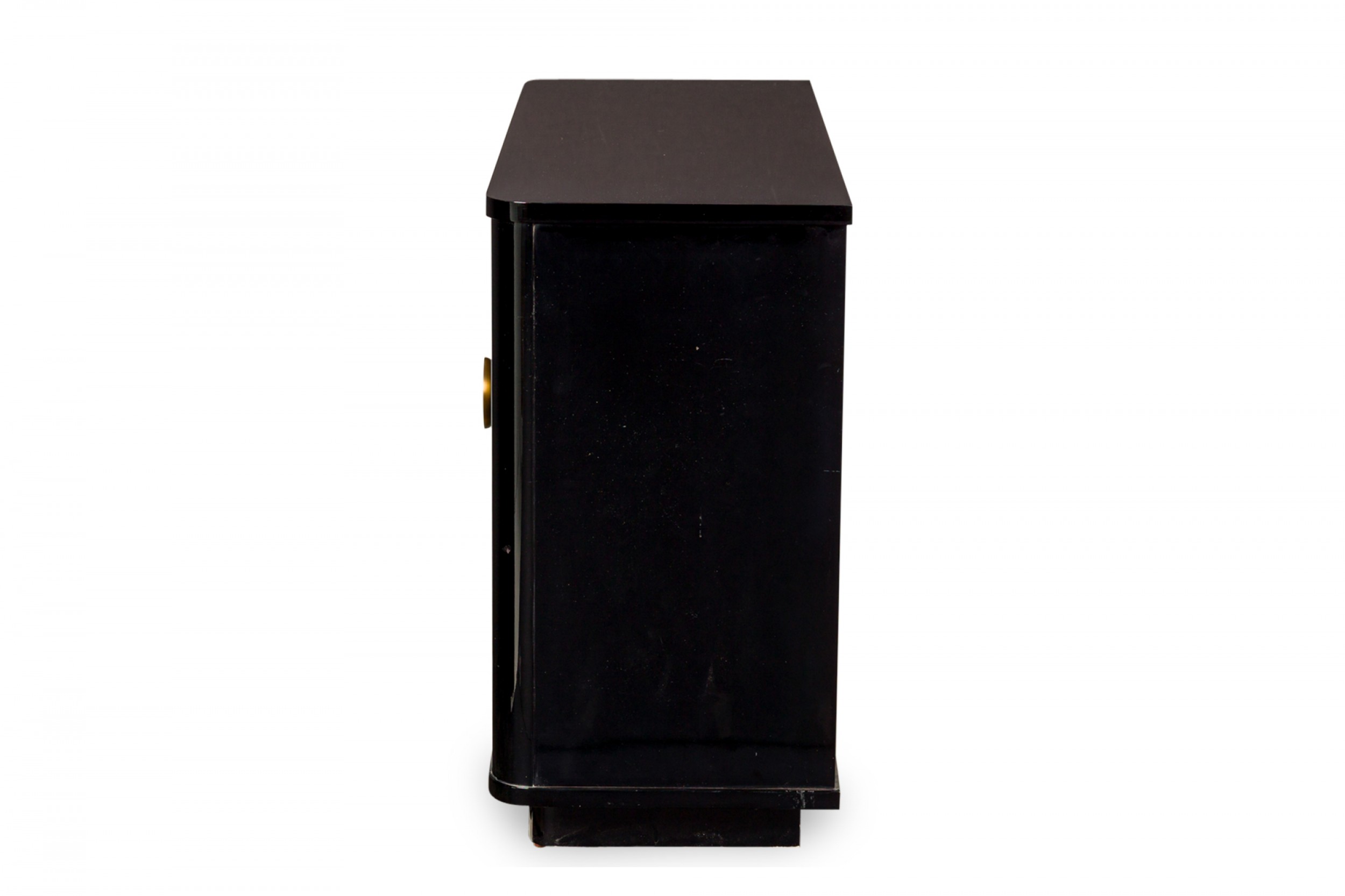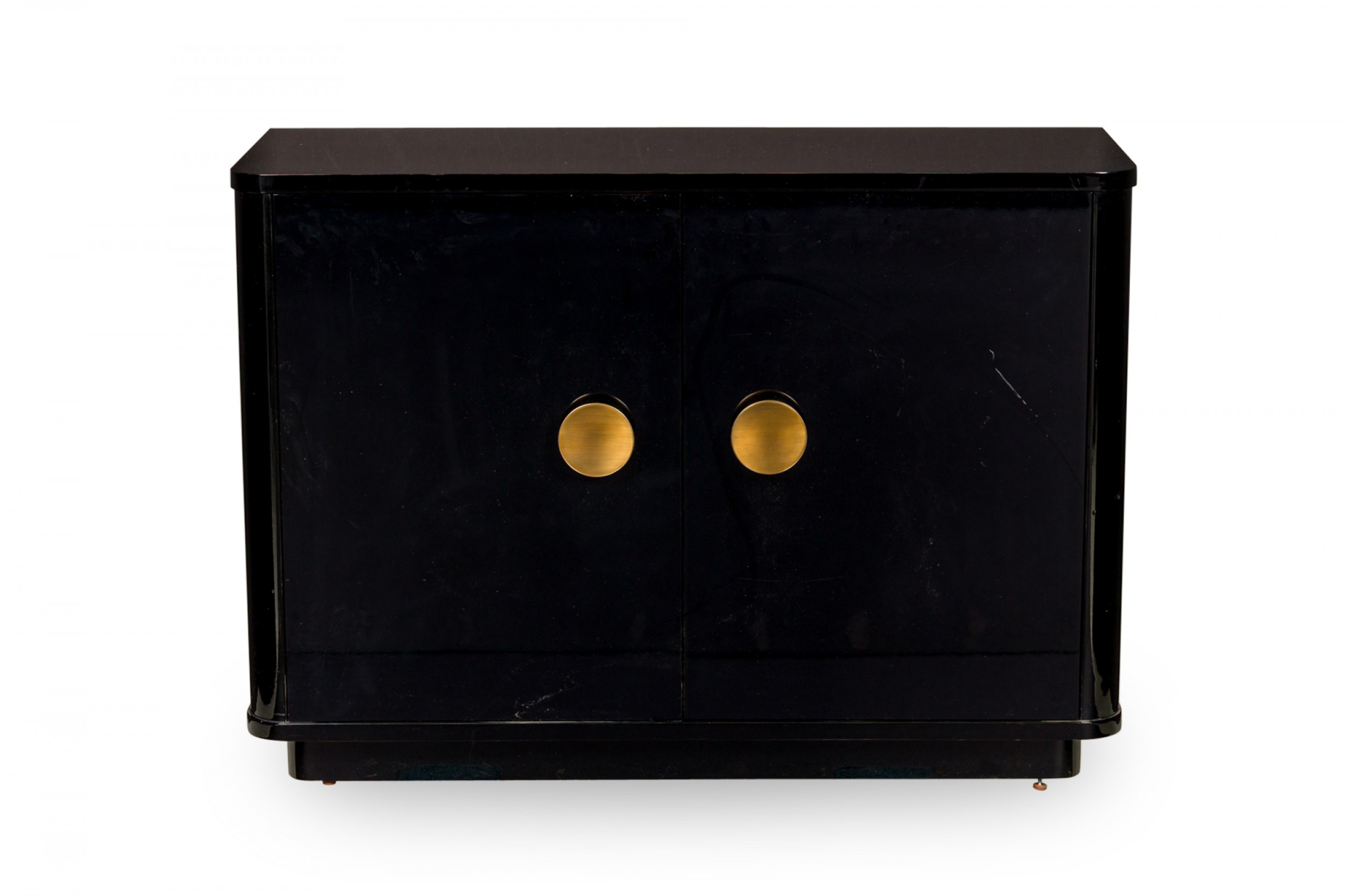 Pair of Contemporary Black Lacquered Low Breakfront Cabinets with Large Circular Gilt Metal Door Pul