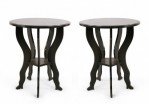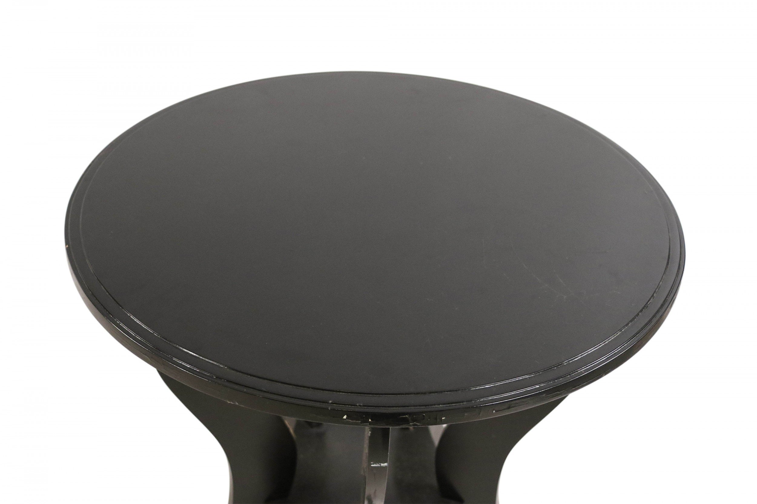 PAIR of Contemporary wooden end tables with a brown painted finish with a circular top and five shaped legs with a lower 5-sided stretcher shelf. (PRICED AS PAIR) (Similar table: NWL0612)
