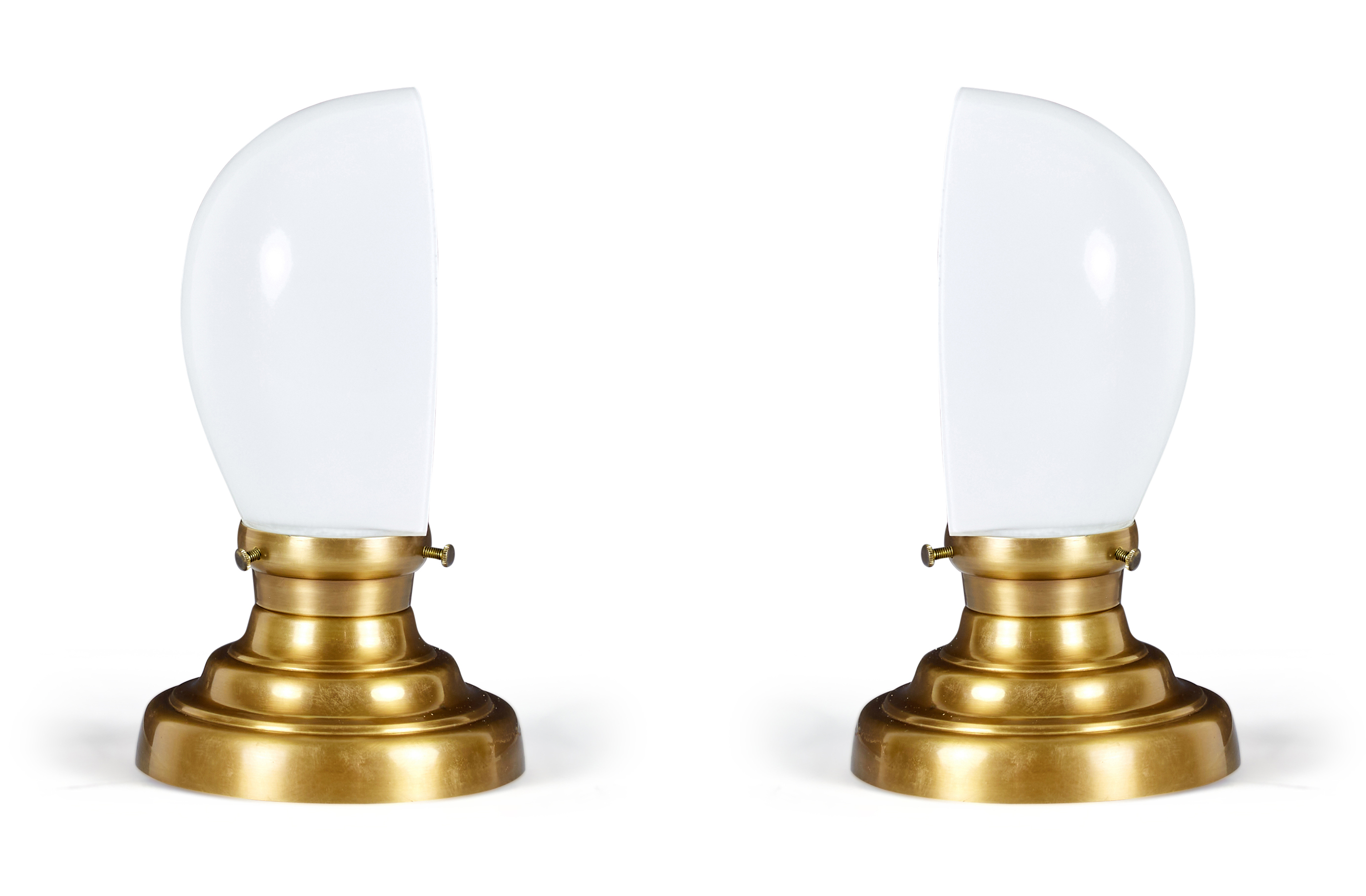 PAIR of Contemporary brass flush-mount wall sconces with white glass half globe shades. (URBAN ARCHAEOLOGY)(PRICED AS PAIR)
