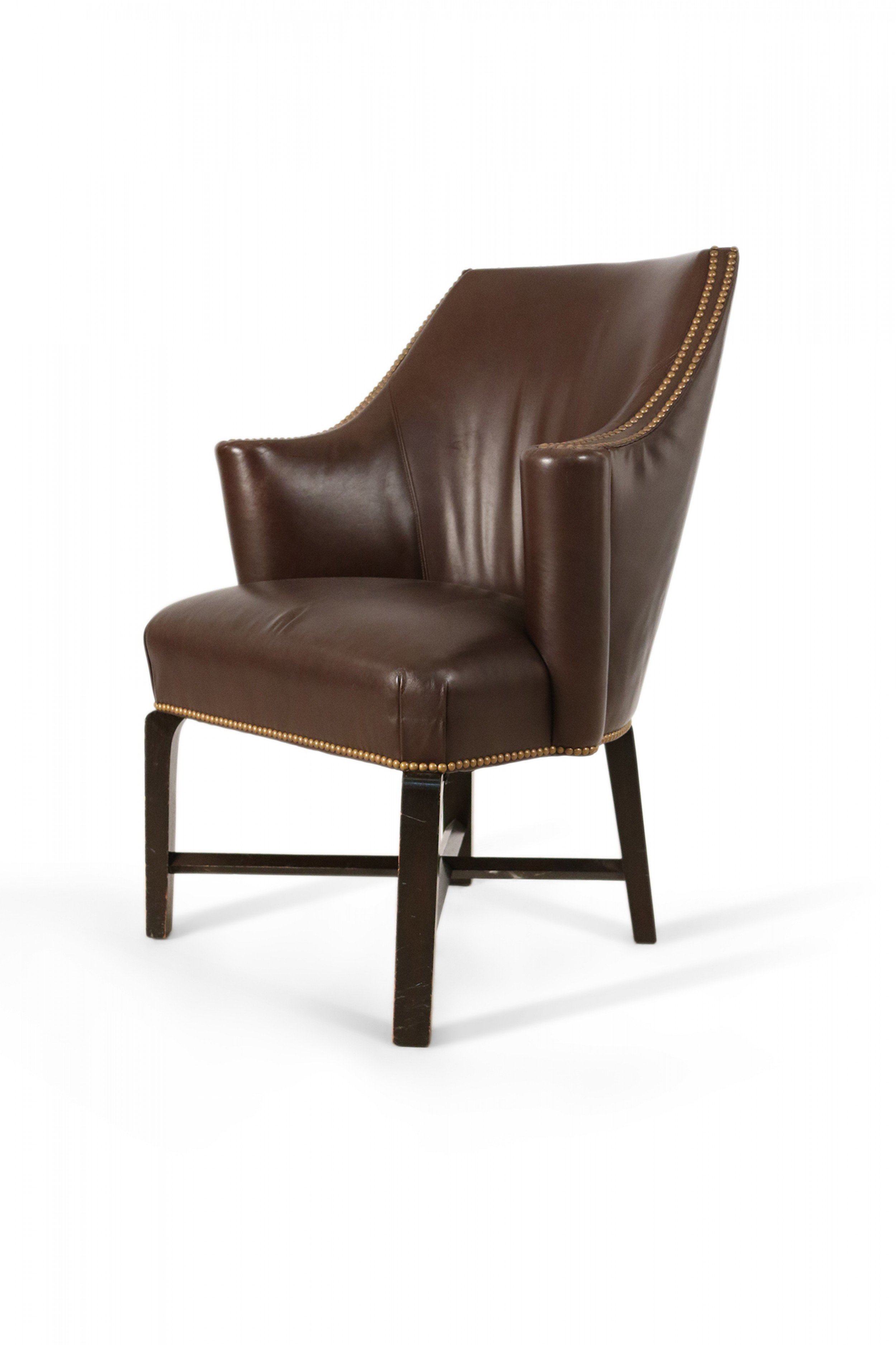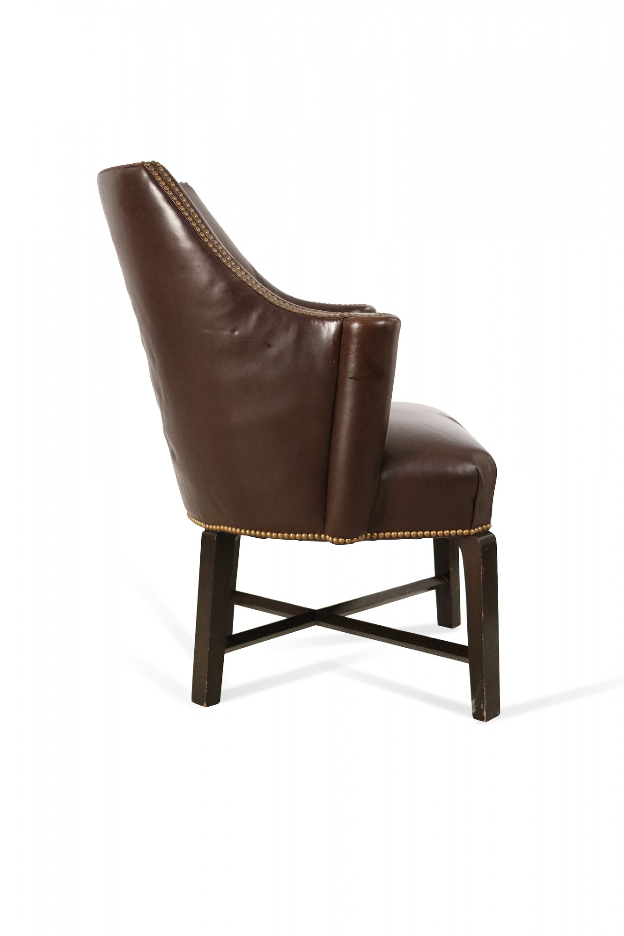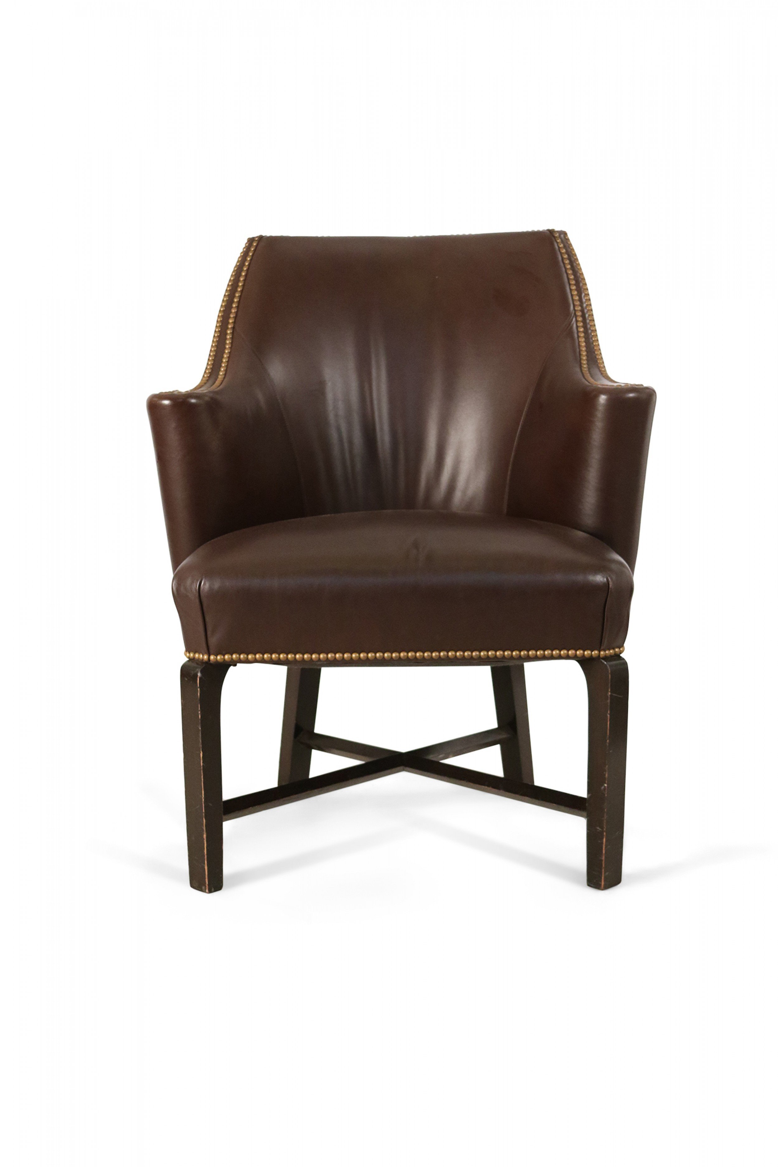 Contemporary brown leather club / armchair with rounded back, black painted wooden legs with an x-shaped stretcher, and brass upholstery nail detail..
