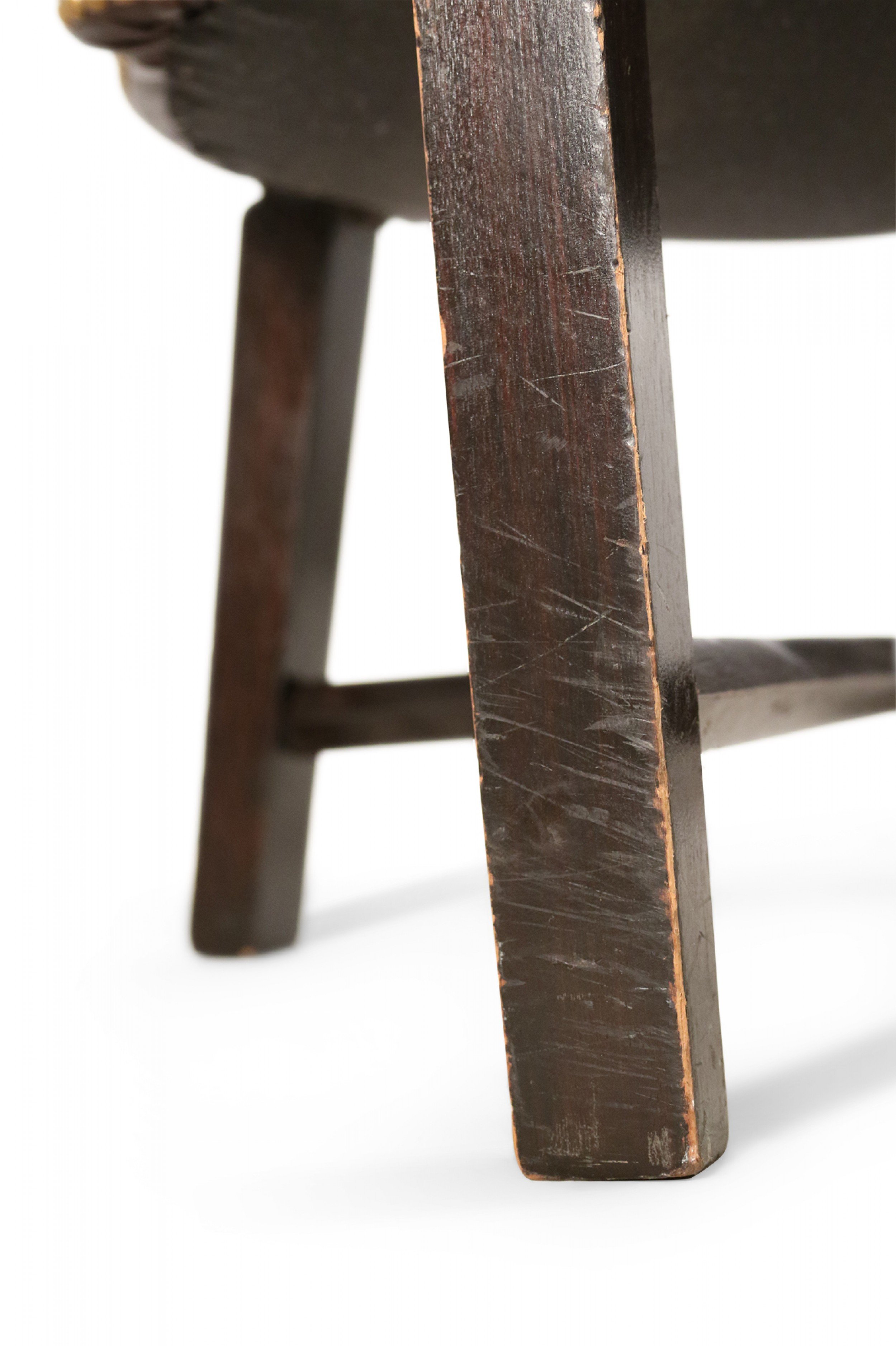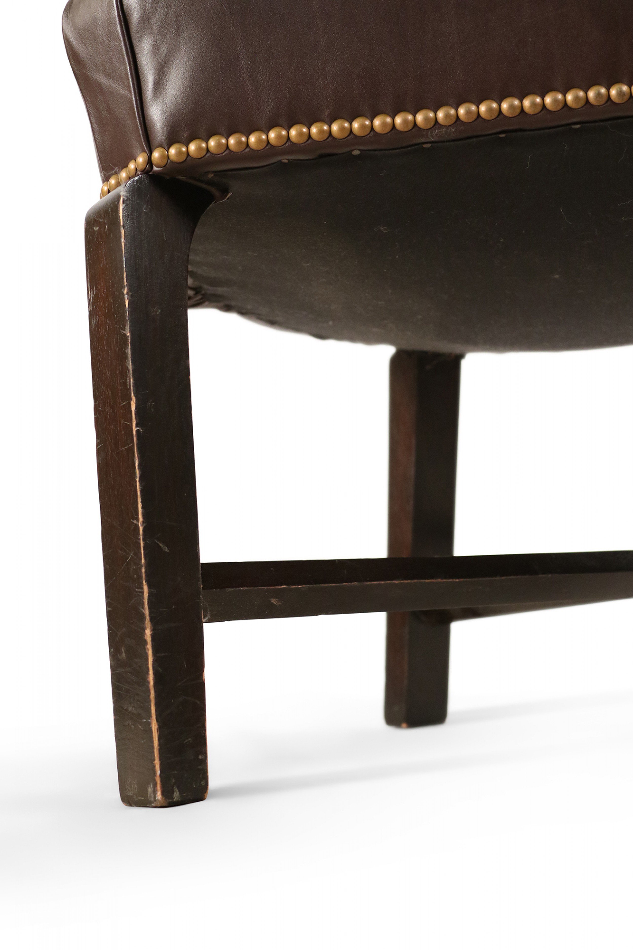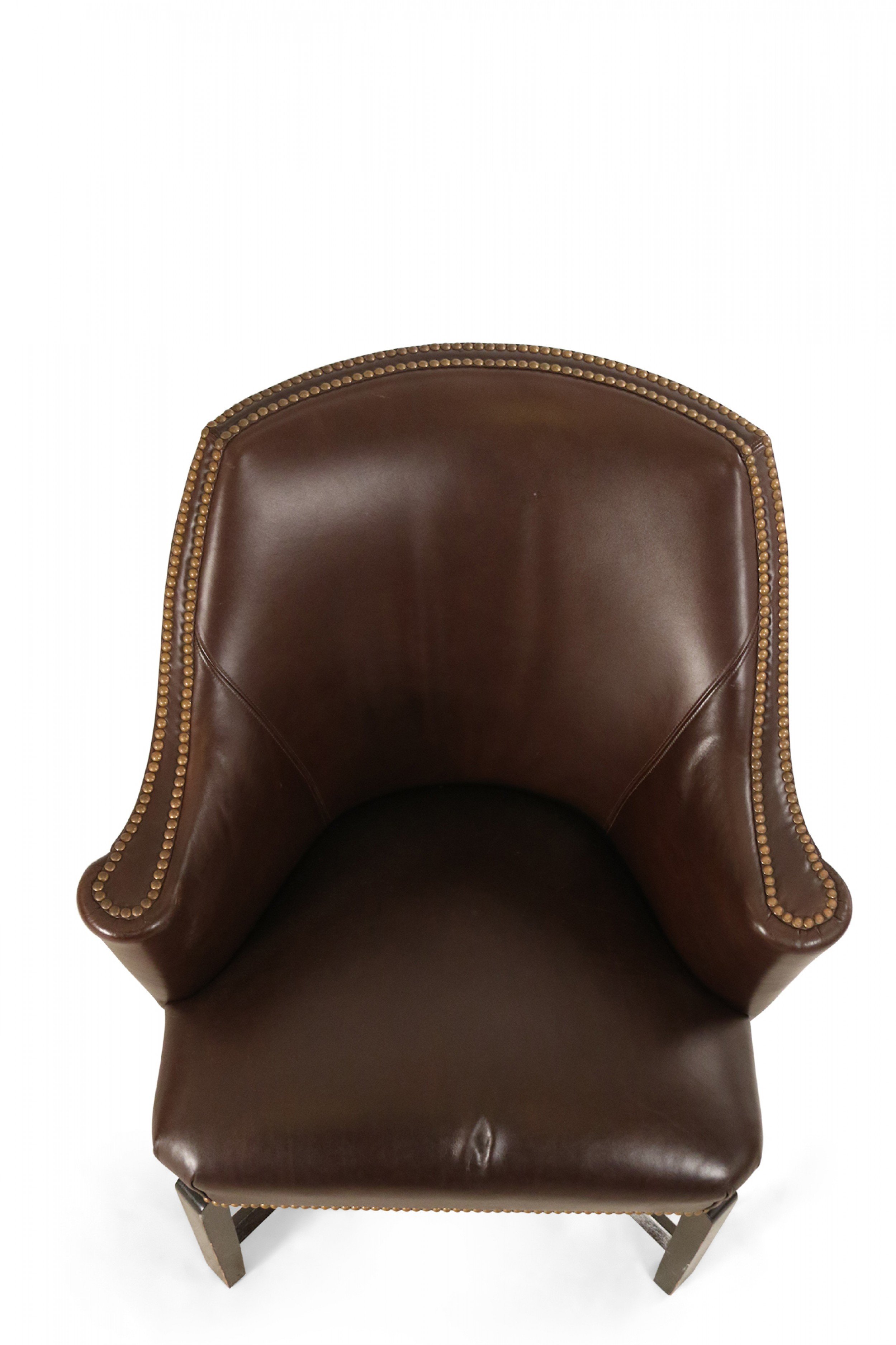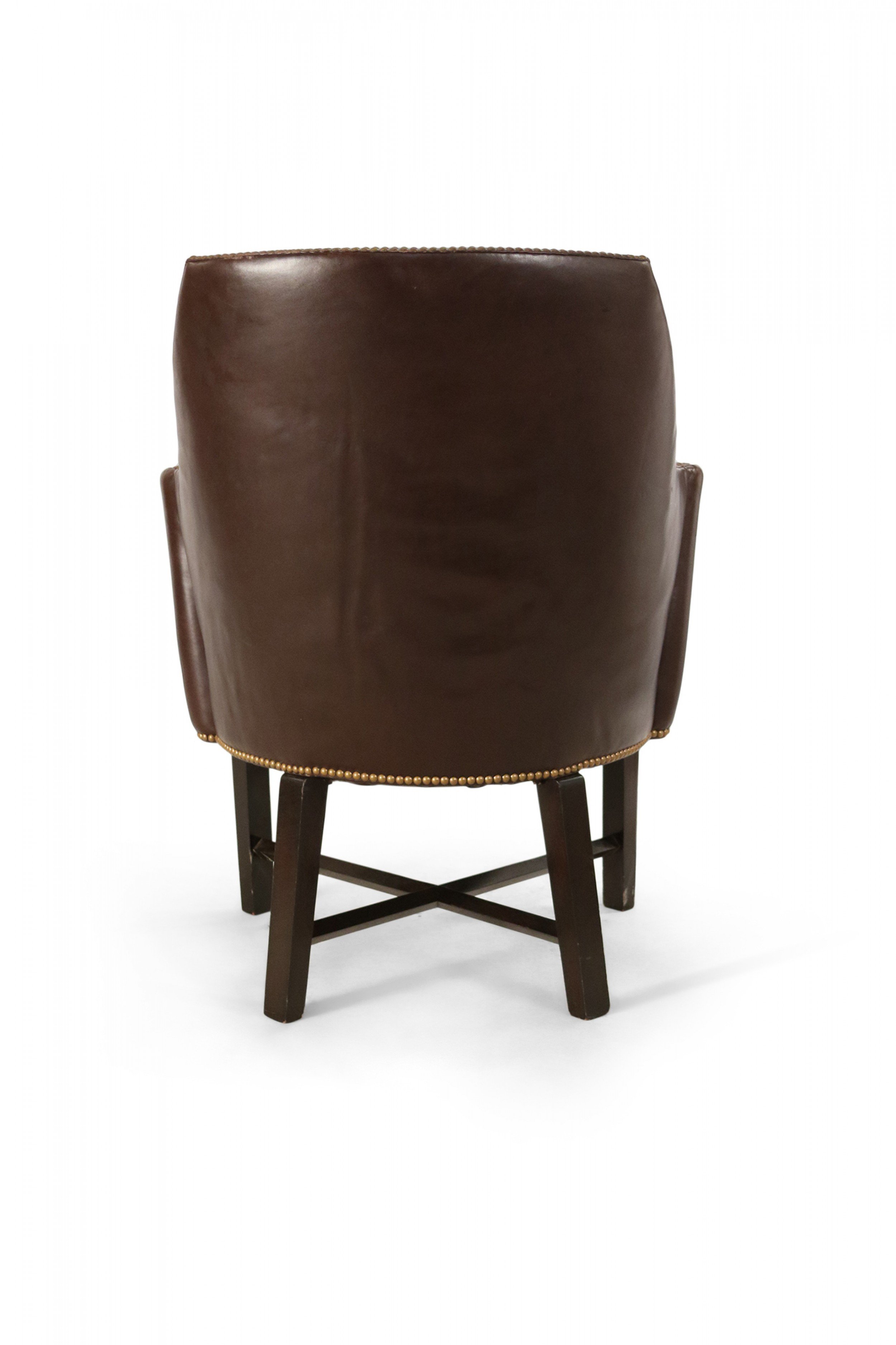 Contemporary brown leather club / armchair with rounded back, black painted wooden legs with an x-shaped stretcher, and brass upholstery nail detail..