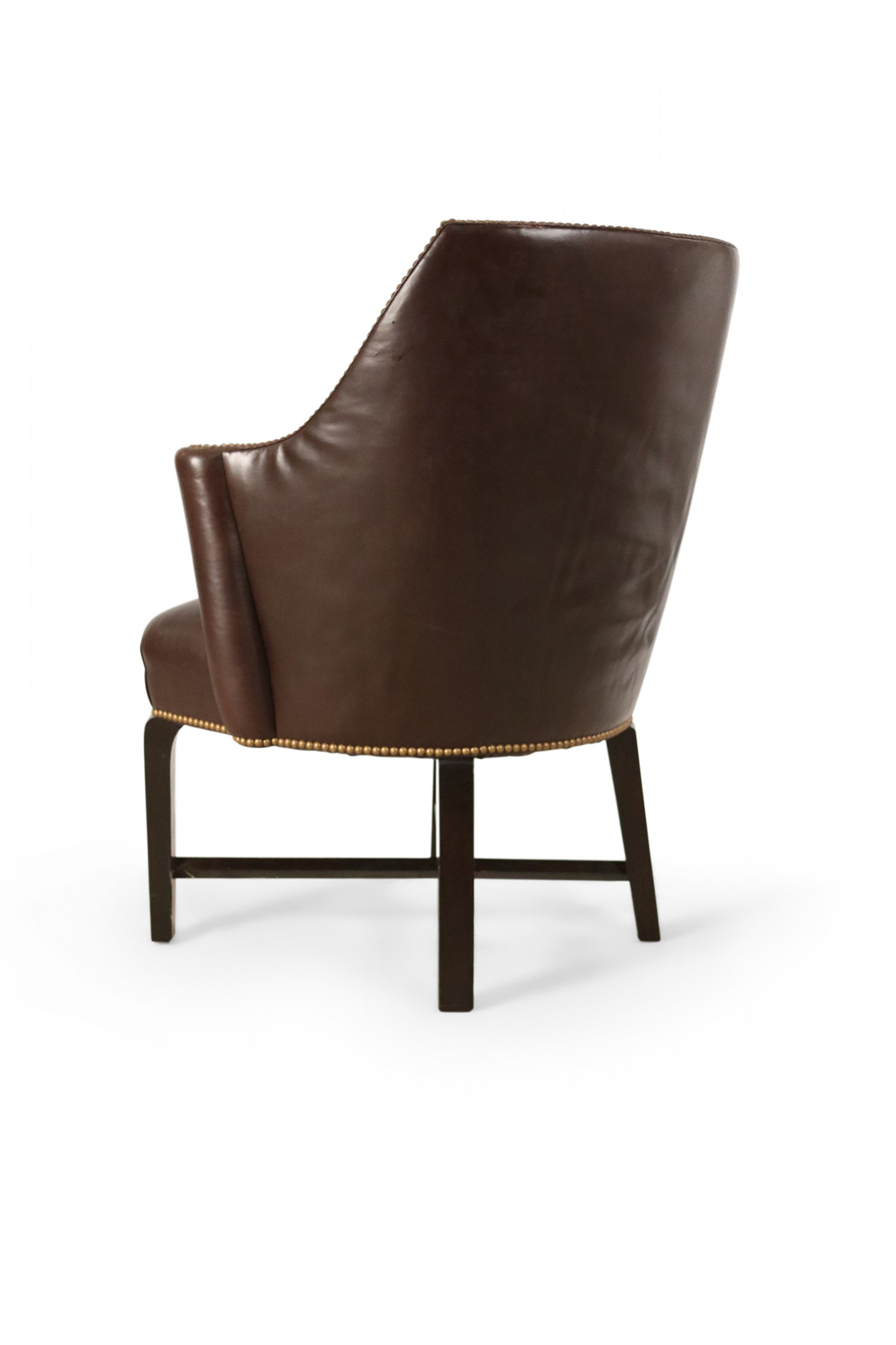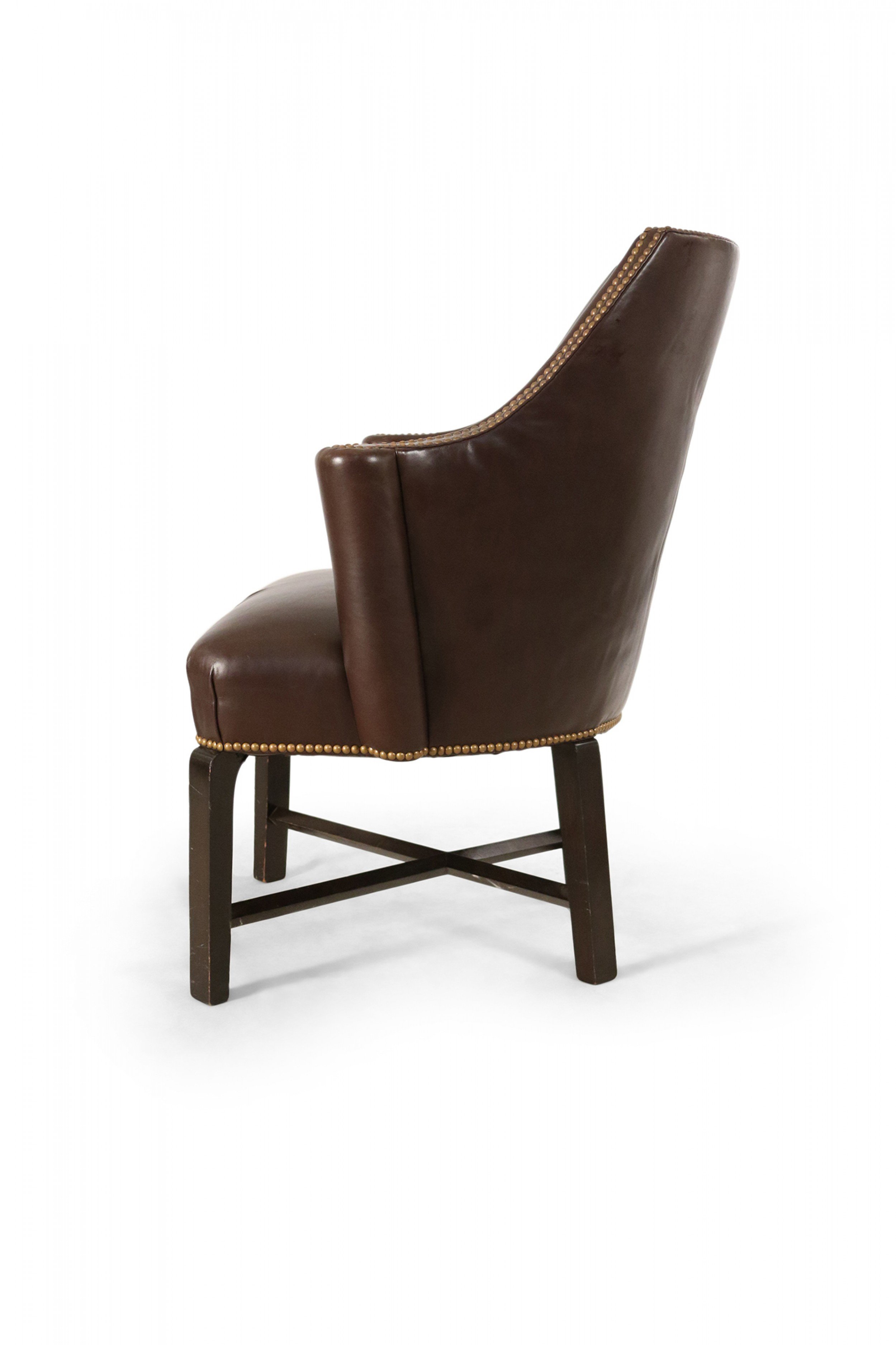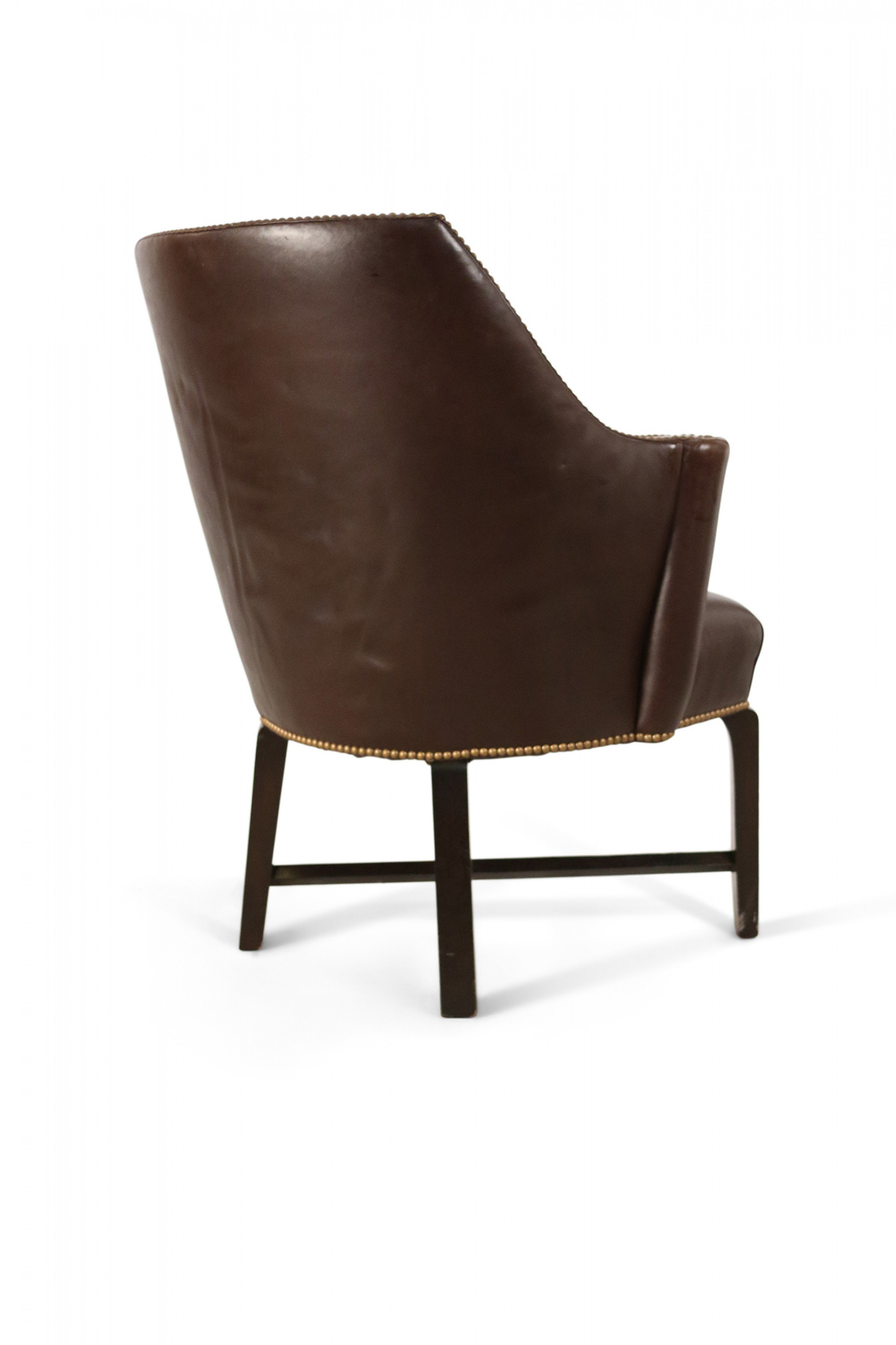 Contemporary brown leather club / armchair with rounded back, black painted wooden legs with an x-shaped stretcher, and brass upholstery nail detail.