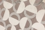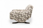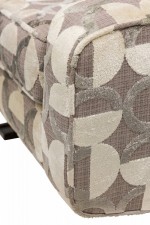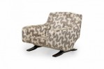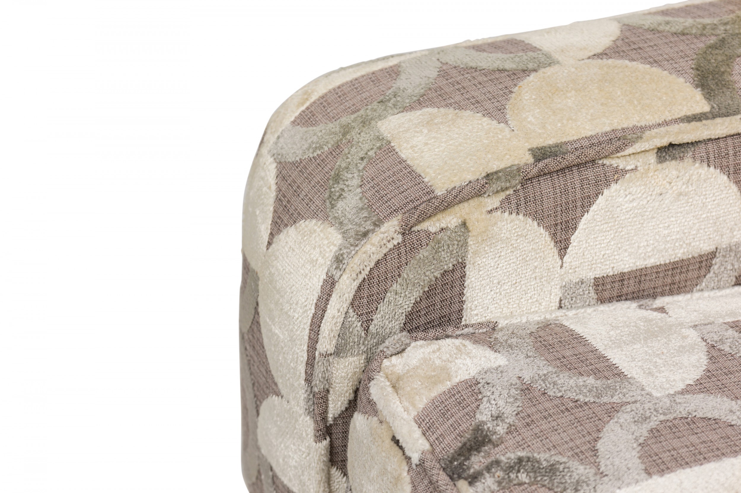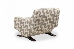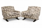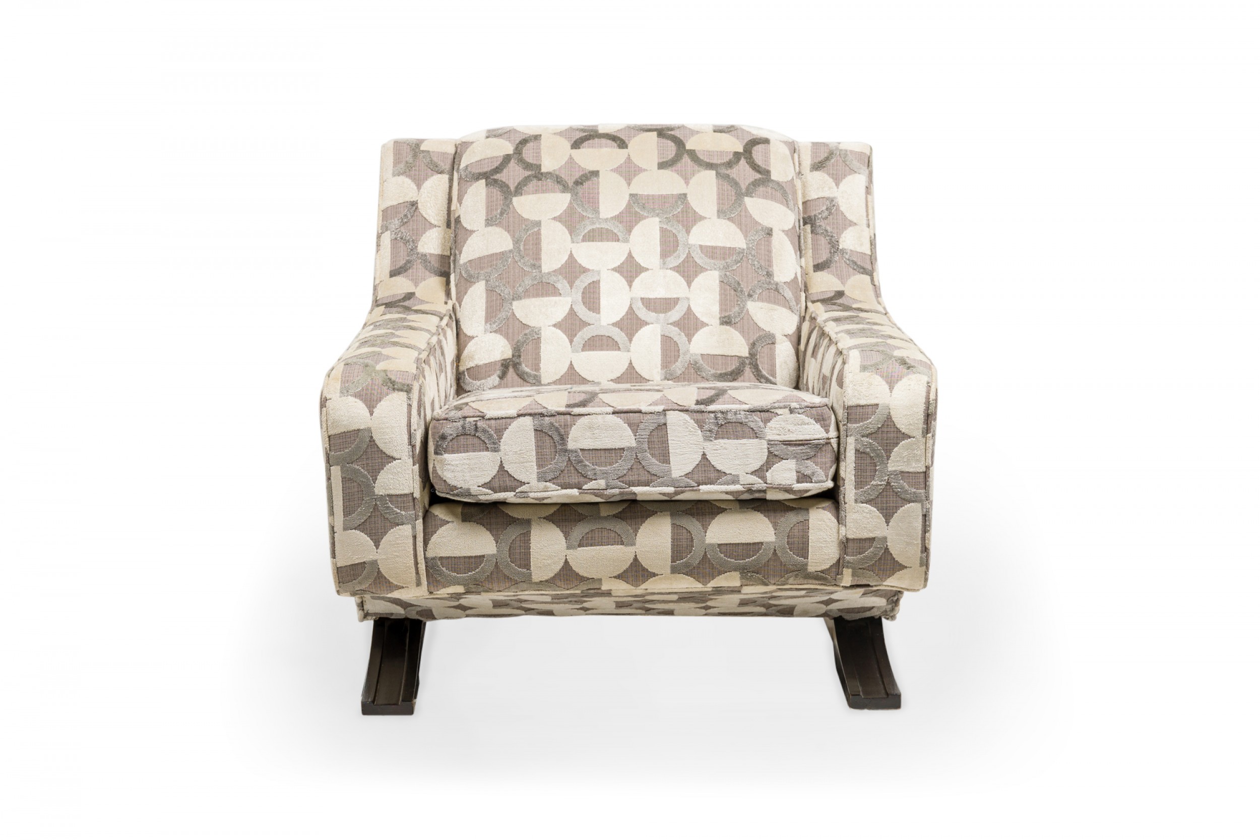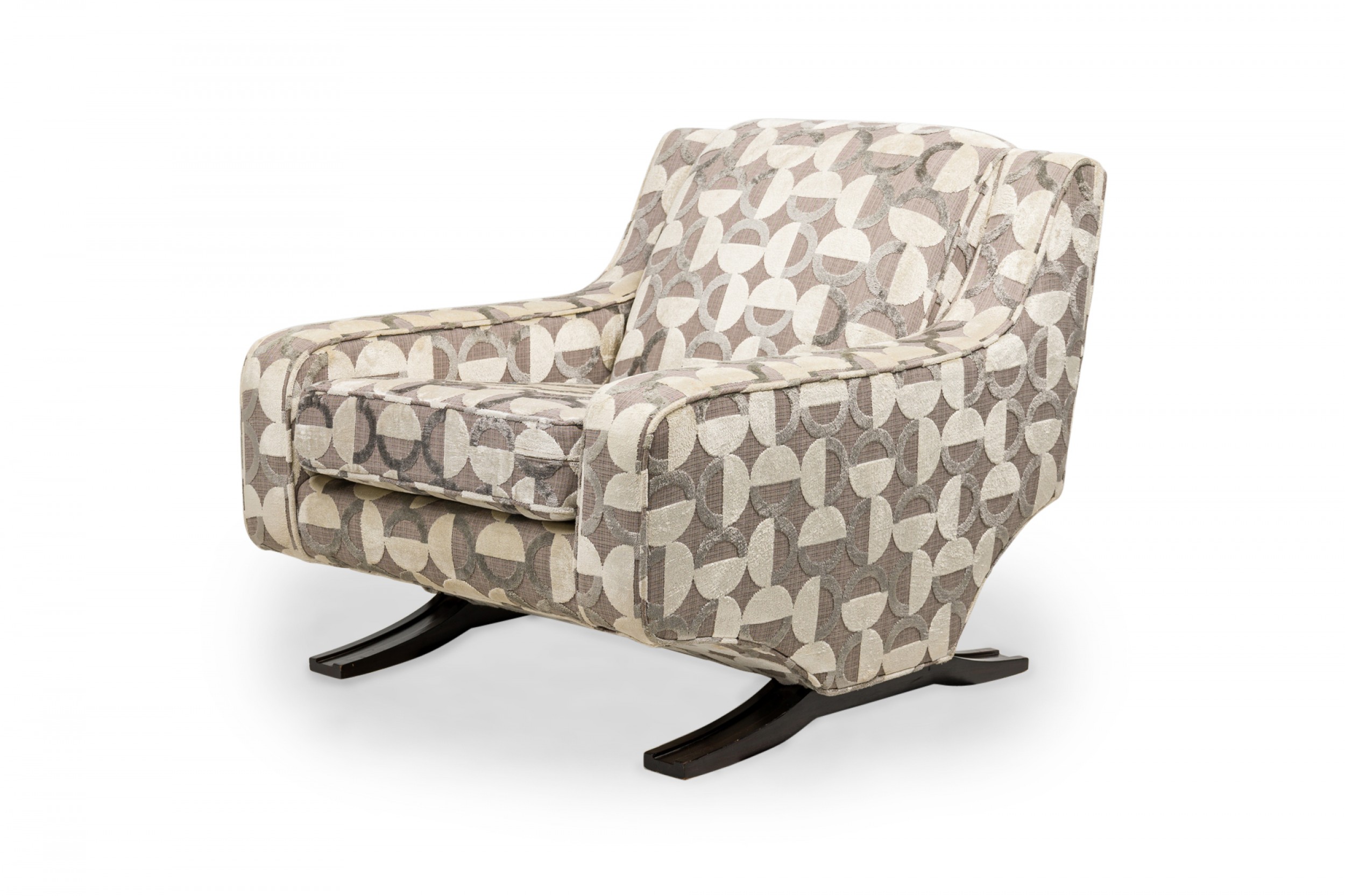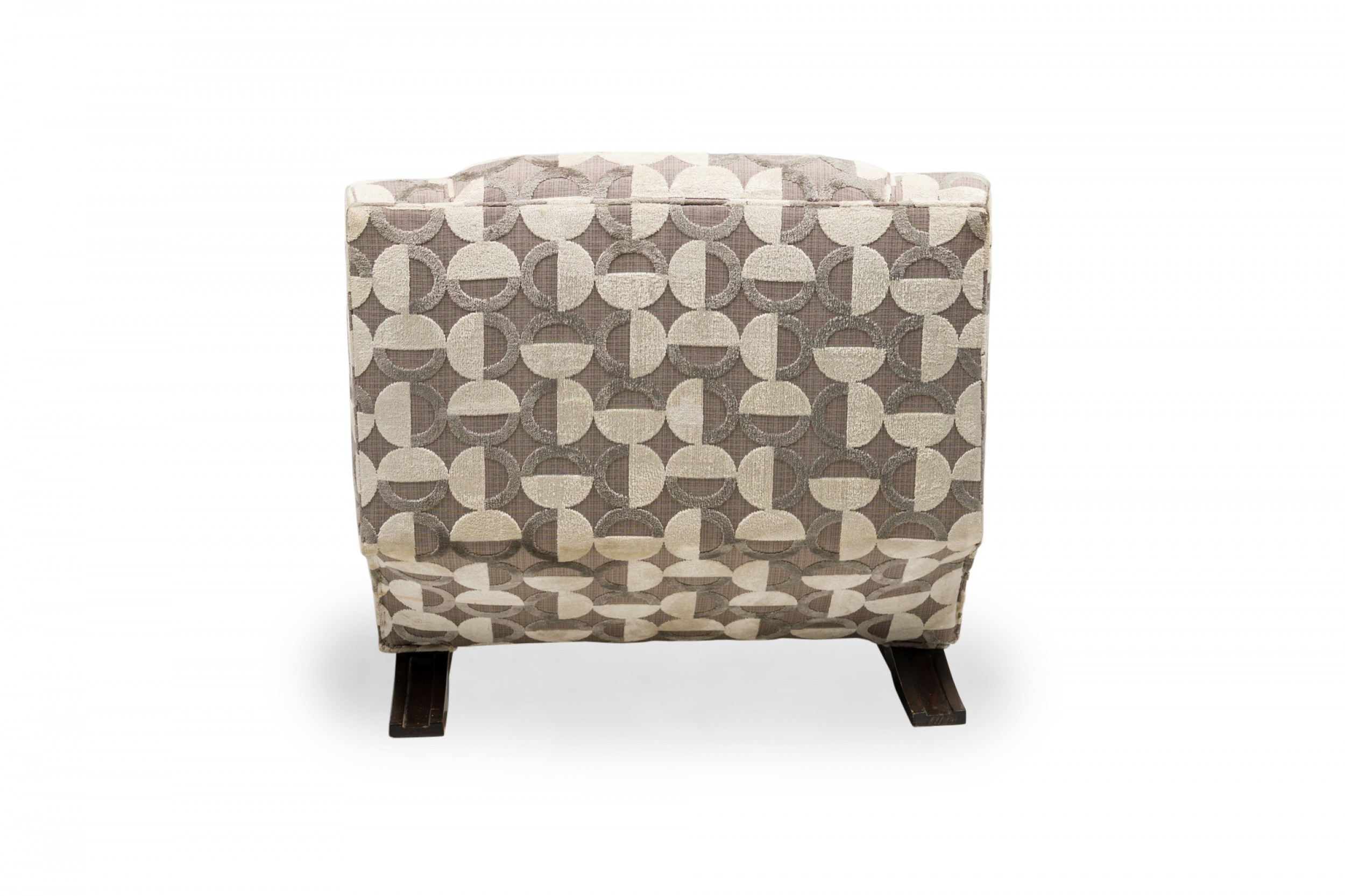 PAIR of Contemporary Modern square form armchairs with sloped low backs, upholstered in an alternating, geometric pattern of beige and gray half-spheres and resting on ebonized bases. (PRICED AS PAIR).