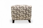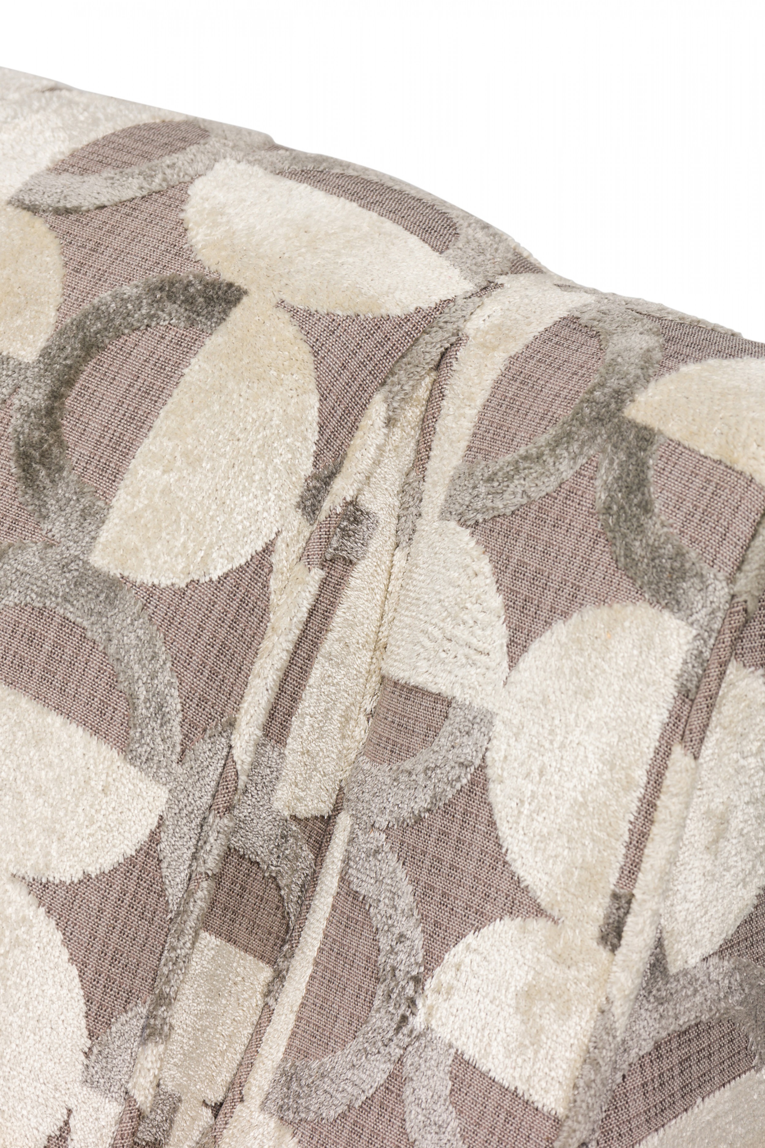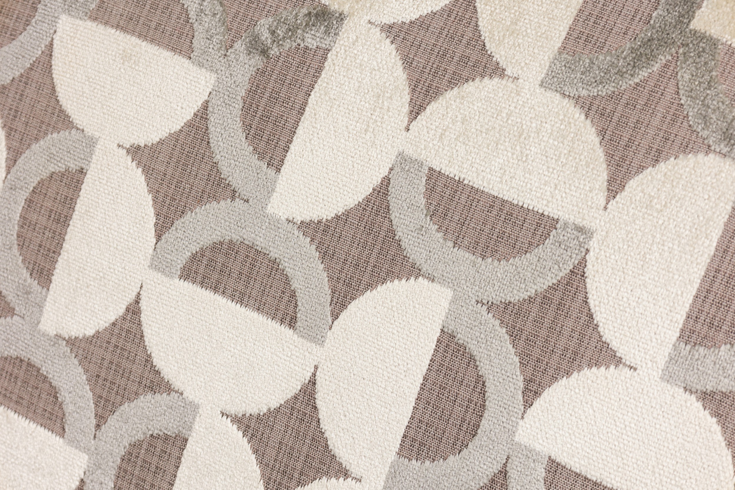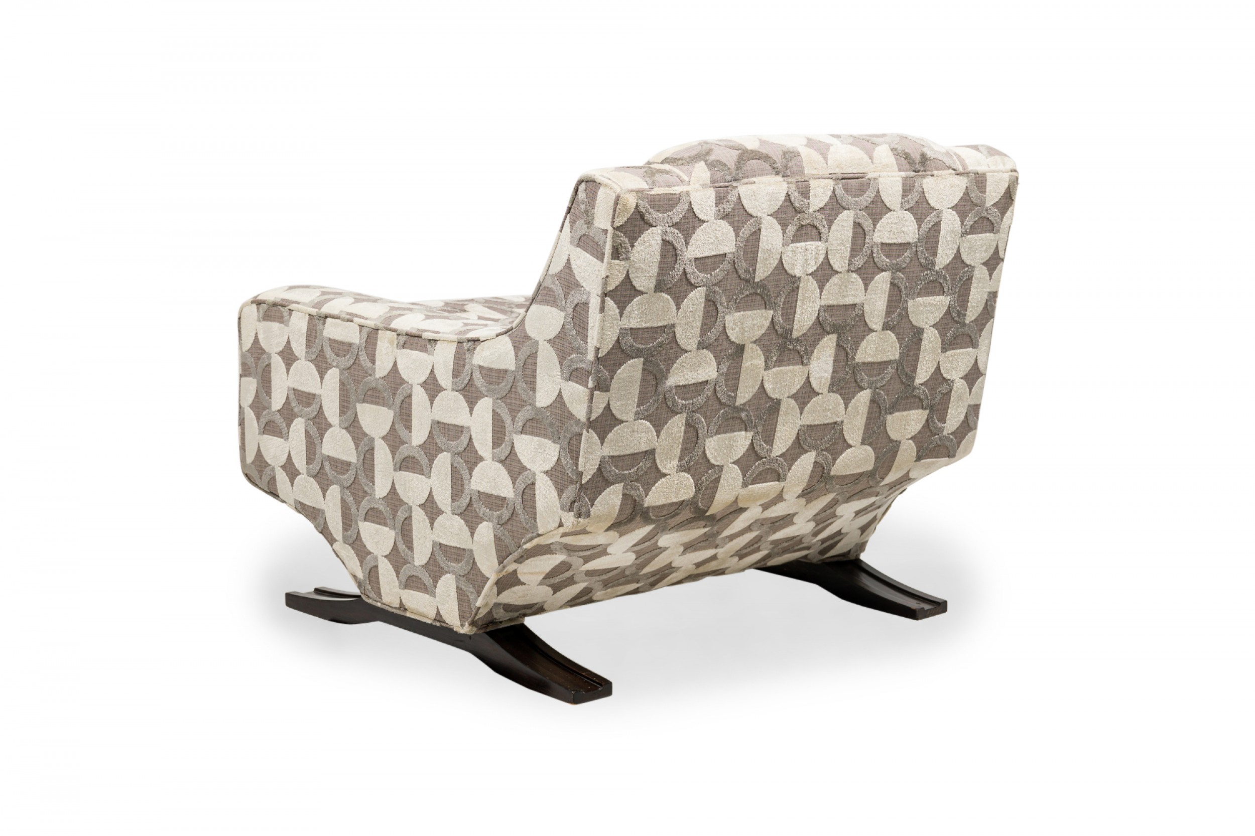 PAIR of Contemporary Modern square form armchairs with sloped low backs, upholstered in an alternating, geometric pattern of beige and gray half-spheres and resting on ebonized bases. (PRICED AS PAIR)
