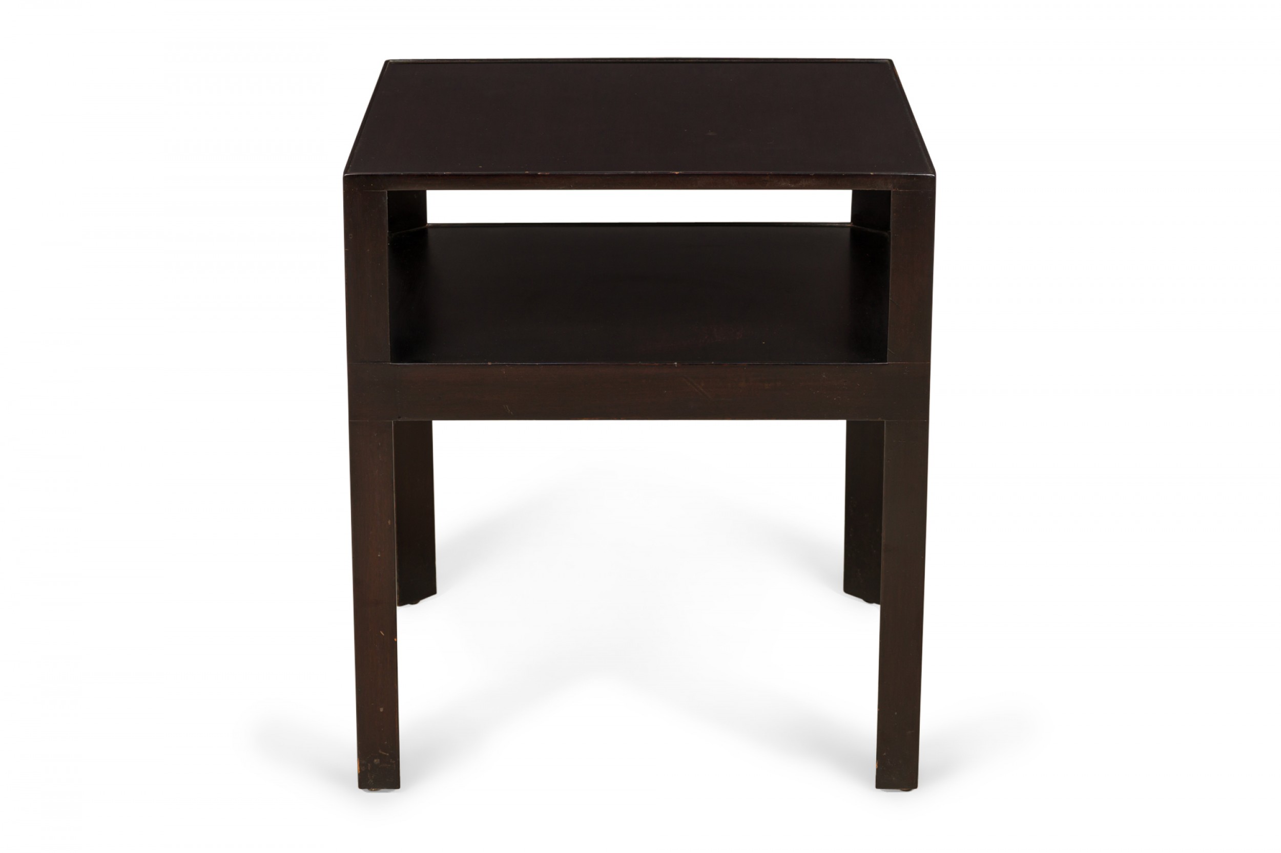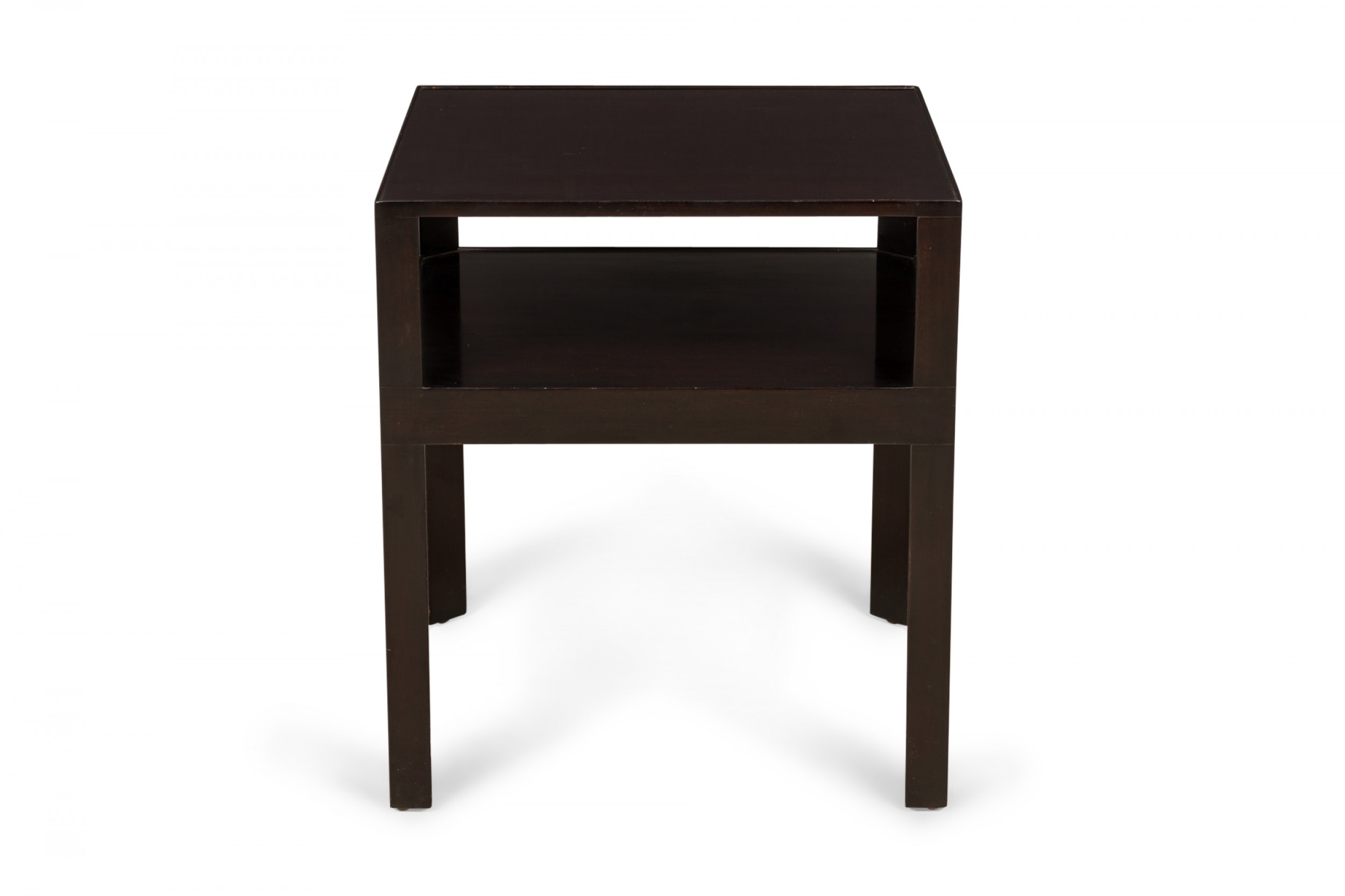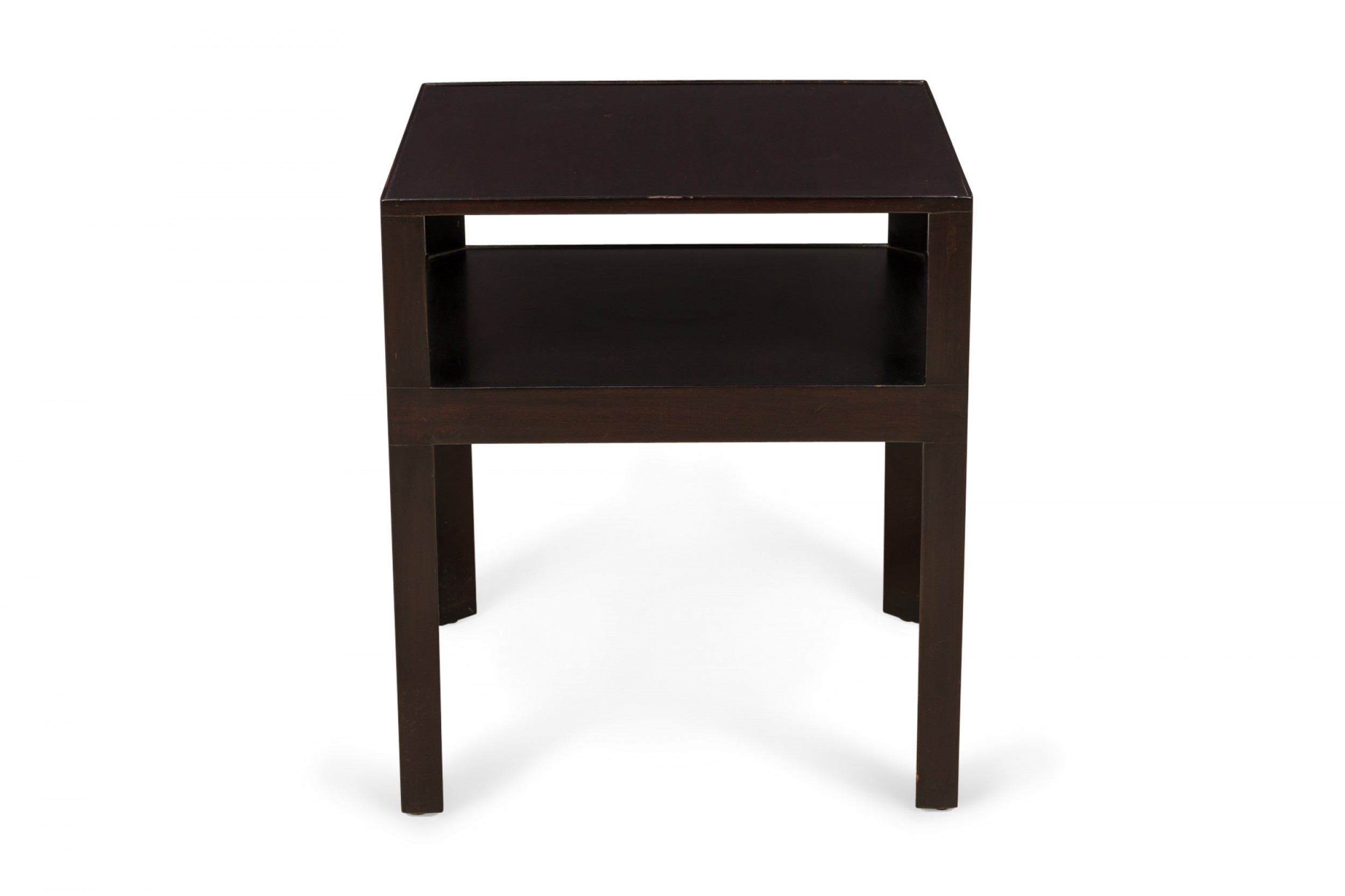 PAIR of American Mid-Century end / side tables with lacquered dark wooden frames with a square top and lower shelf supported by four square legs. (EDWARD WORMLEY)(PRICED AS PAIR)