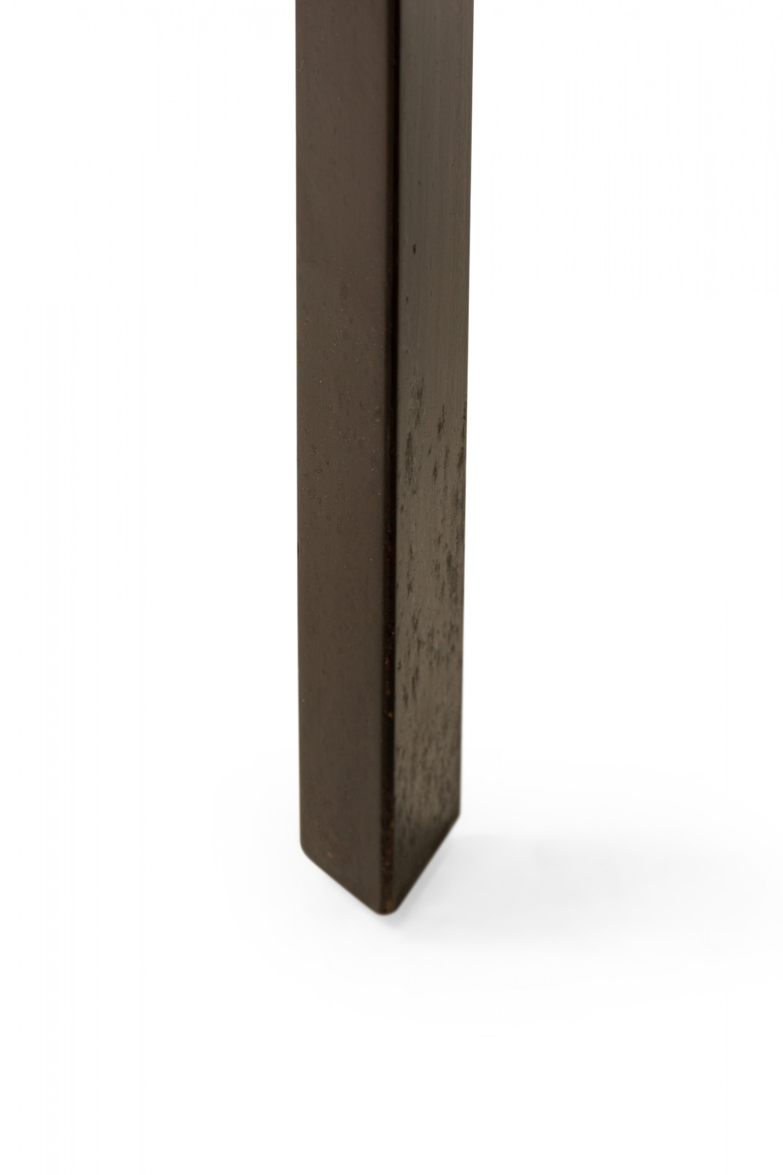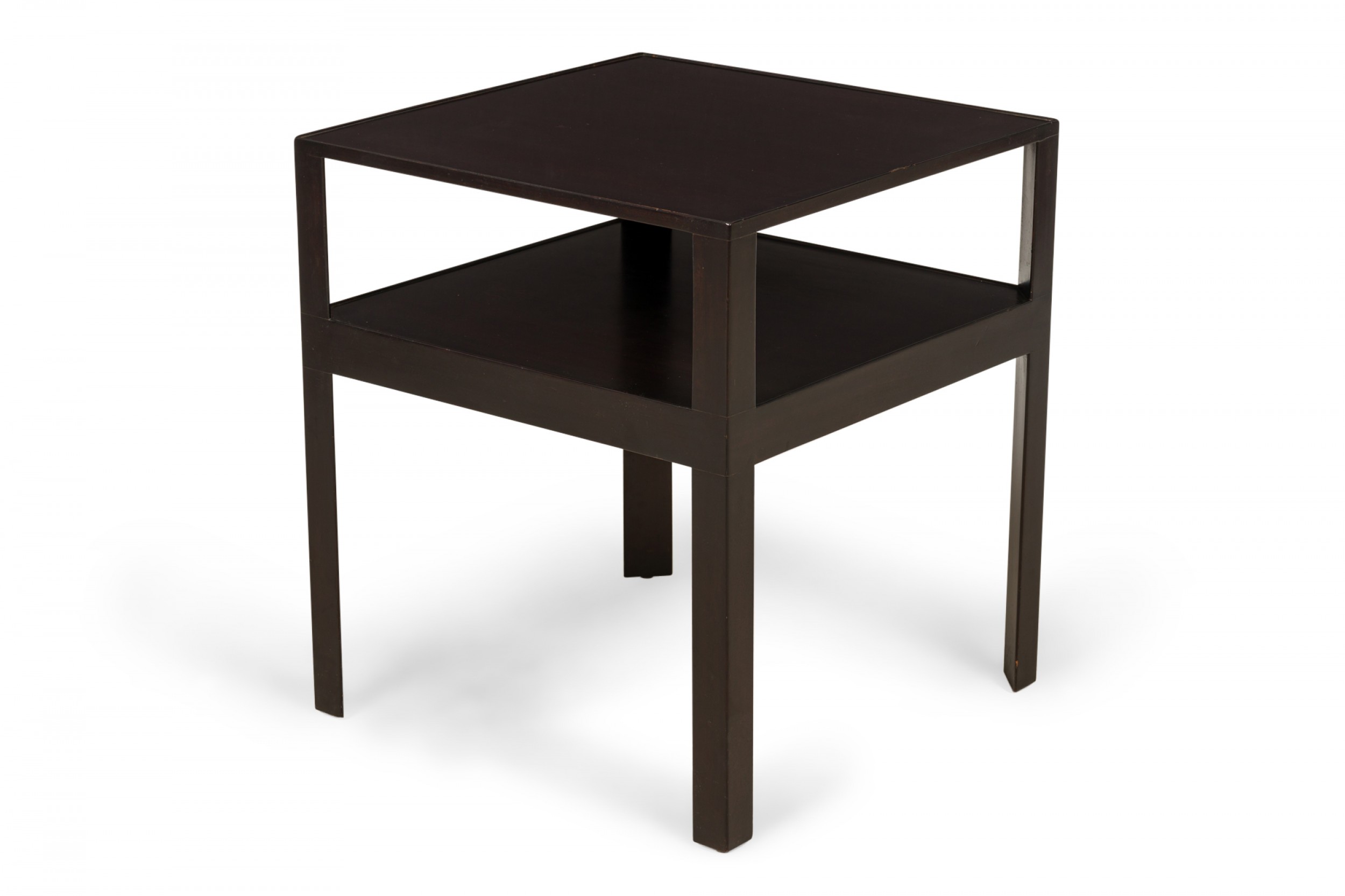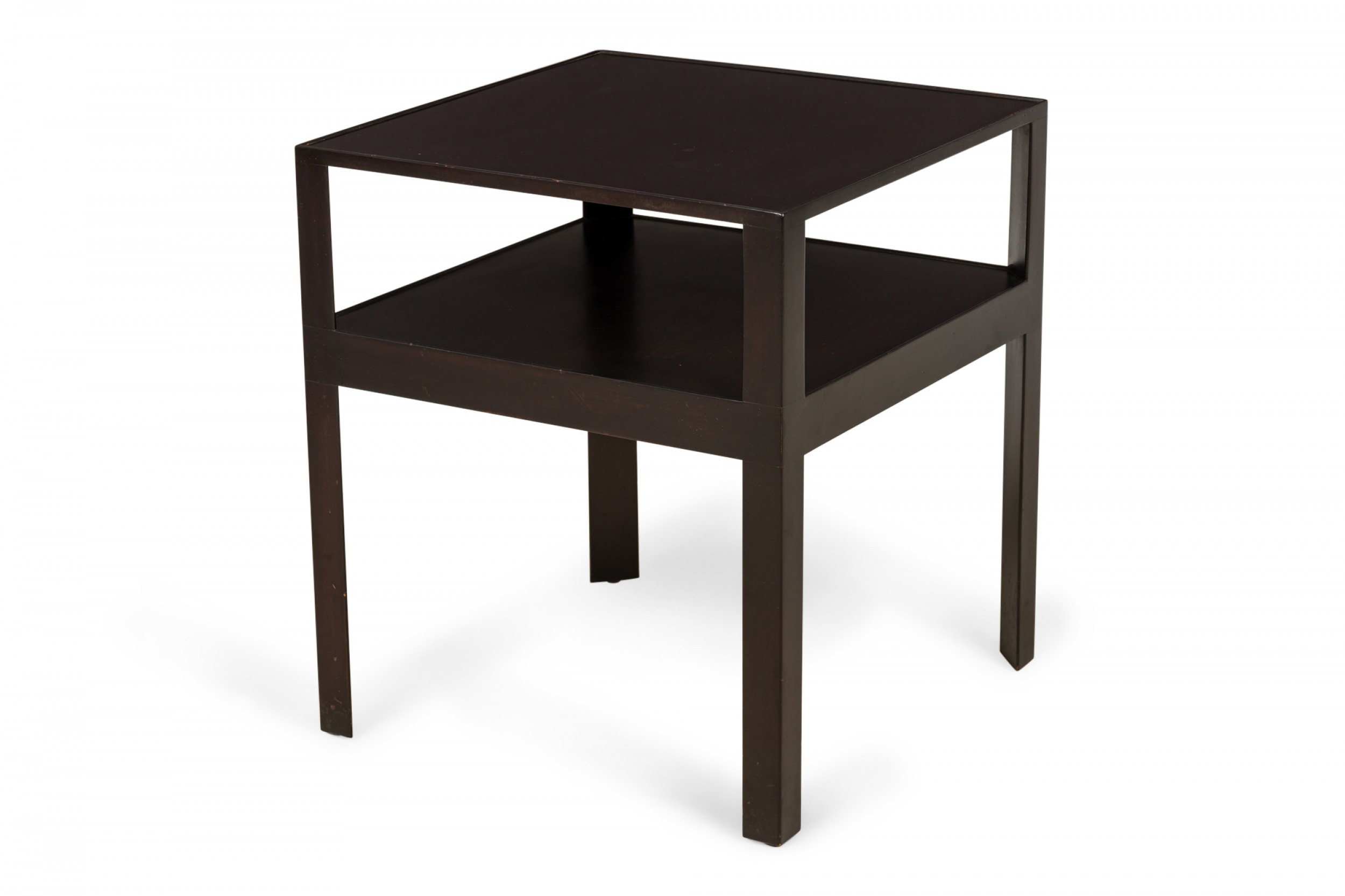 PAIR of American Mid-Century end / side tables with lacquered dark wooden frames with a square top and lower shelf supported by four square legs. (EDWARD WORMLEY)(PRICED AS PAIR)