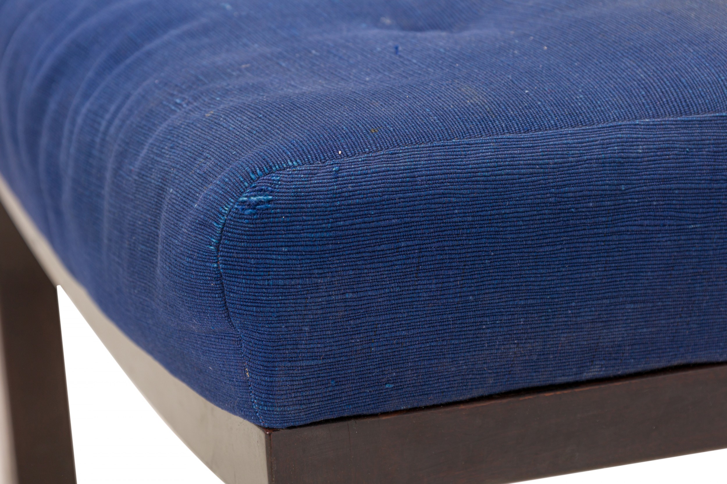 PAIR of American Mid-Century slipper / side chairs, upholstered in a dark blue fabric with button tufting on the seat backs, resting on four square walnut legs. (EDWARD WORMLEY FOR DUNBAR FURNITURE COMPANY)(PRICED AS PAIR)