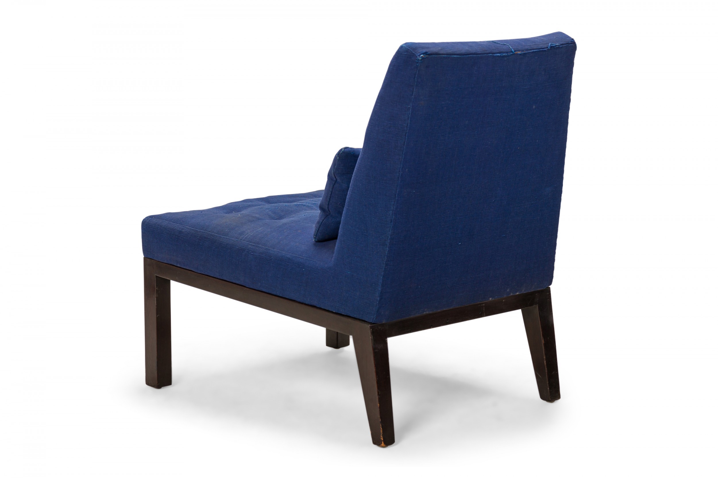 PAIR of American Mid-Century slipper / side chairs, upholstered in a dark blue fabric with button tufting on the seat backs, resting on four square walnut legs. (EDWARD WORMLEY FOR DUNBAR FURNITURE COMPANY)(PRICED AS PAIR).