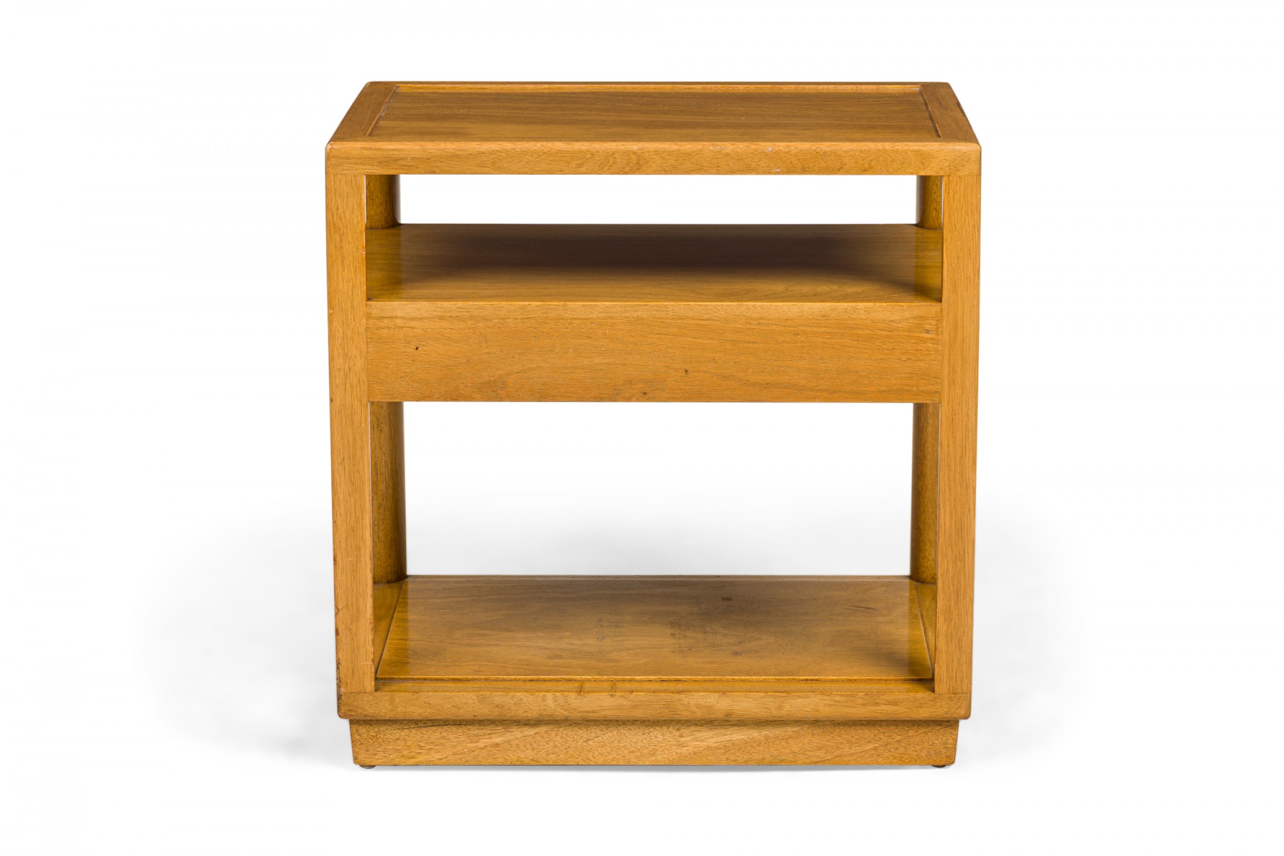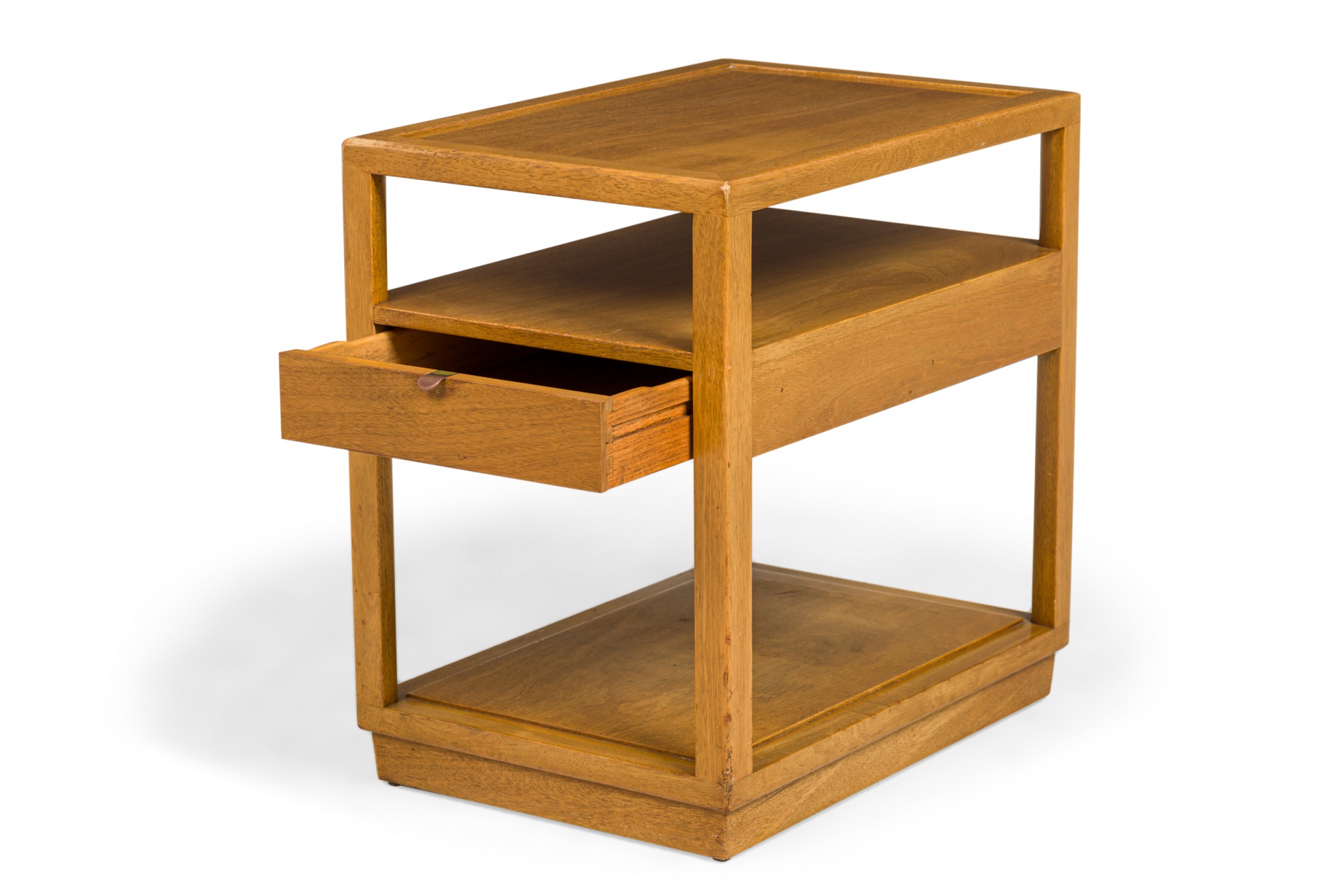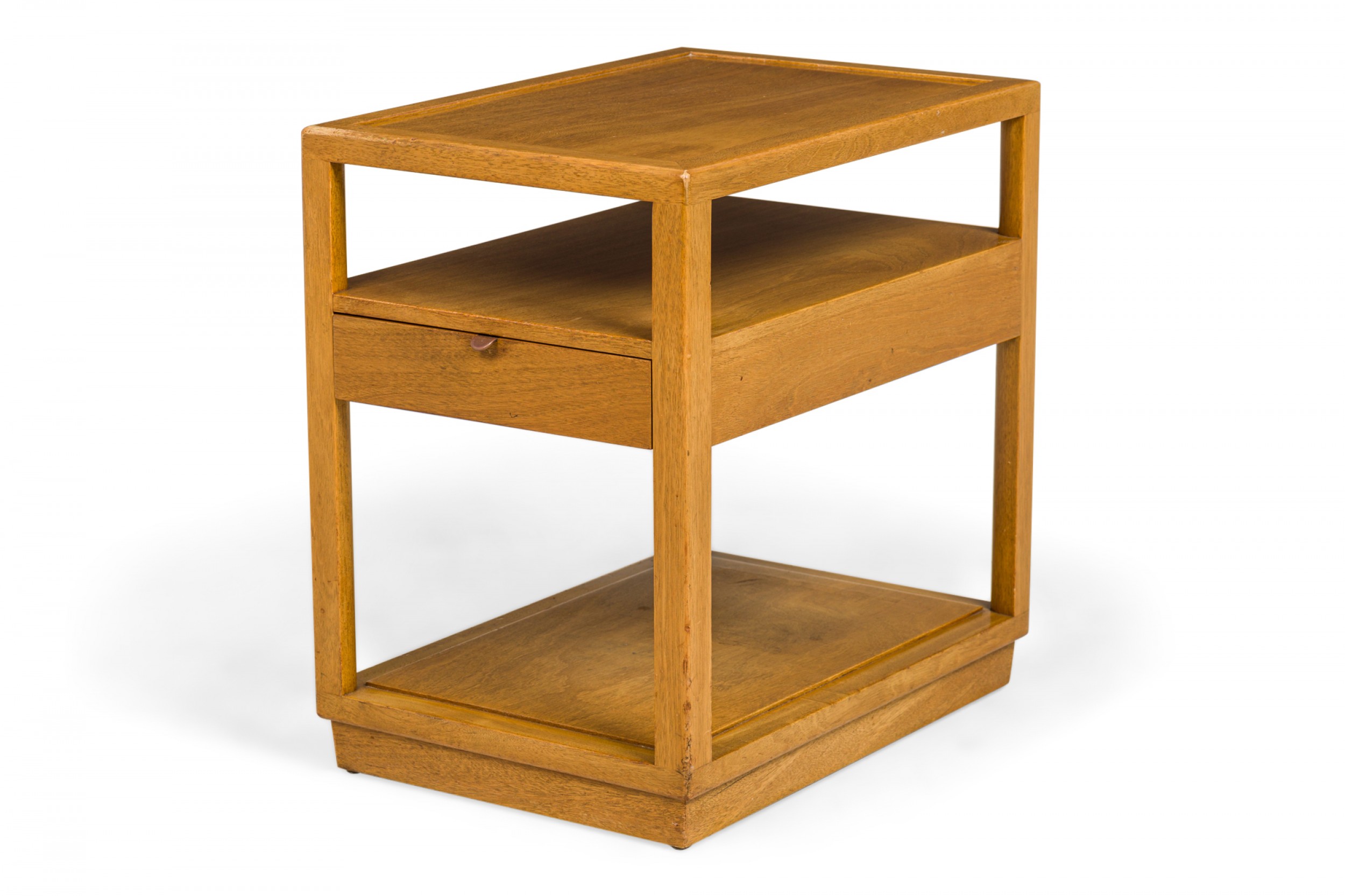 PAIR of American Mid-Century wooden end / side tables with a rectangular table top above an open shelf containing a single drawer below with a curved brass tab drawer pull, resting on a solid base creating another large open shelf. (EDWARD WORMLEY FOR DUNBAR FURNITURE COMPANY)(PRICED AS PAIR)