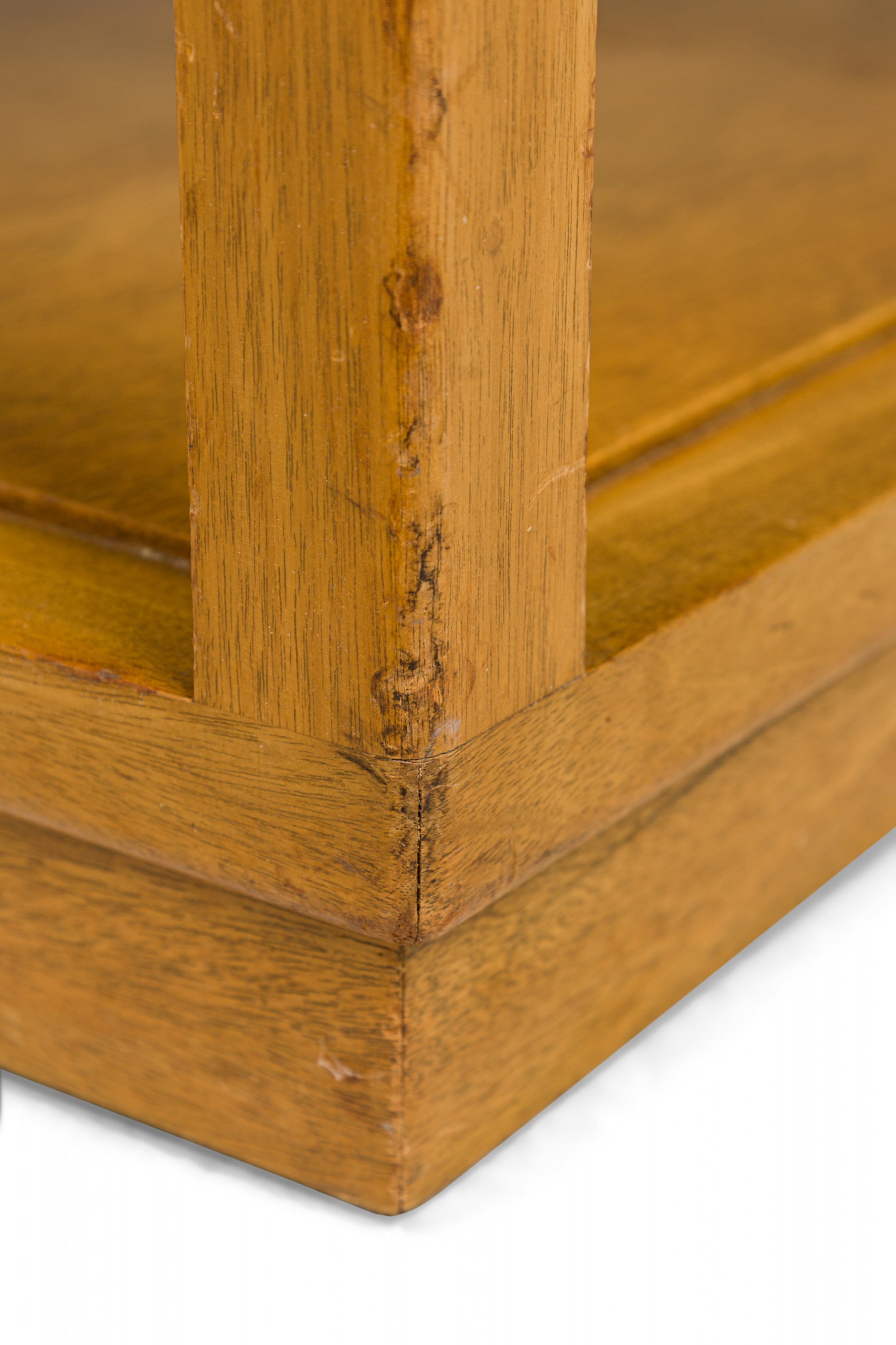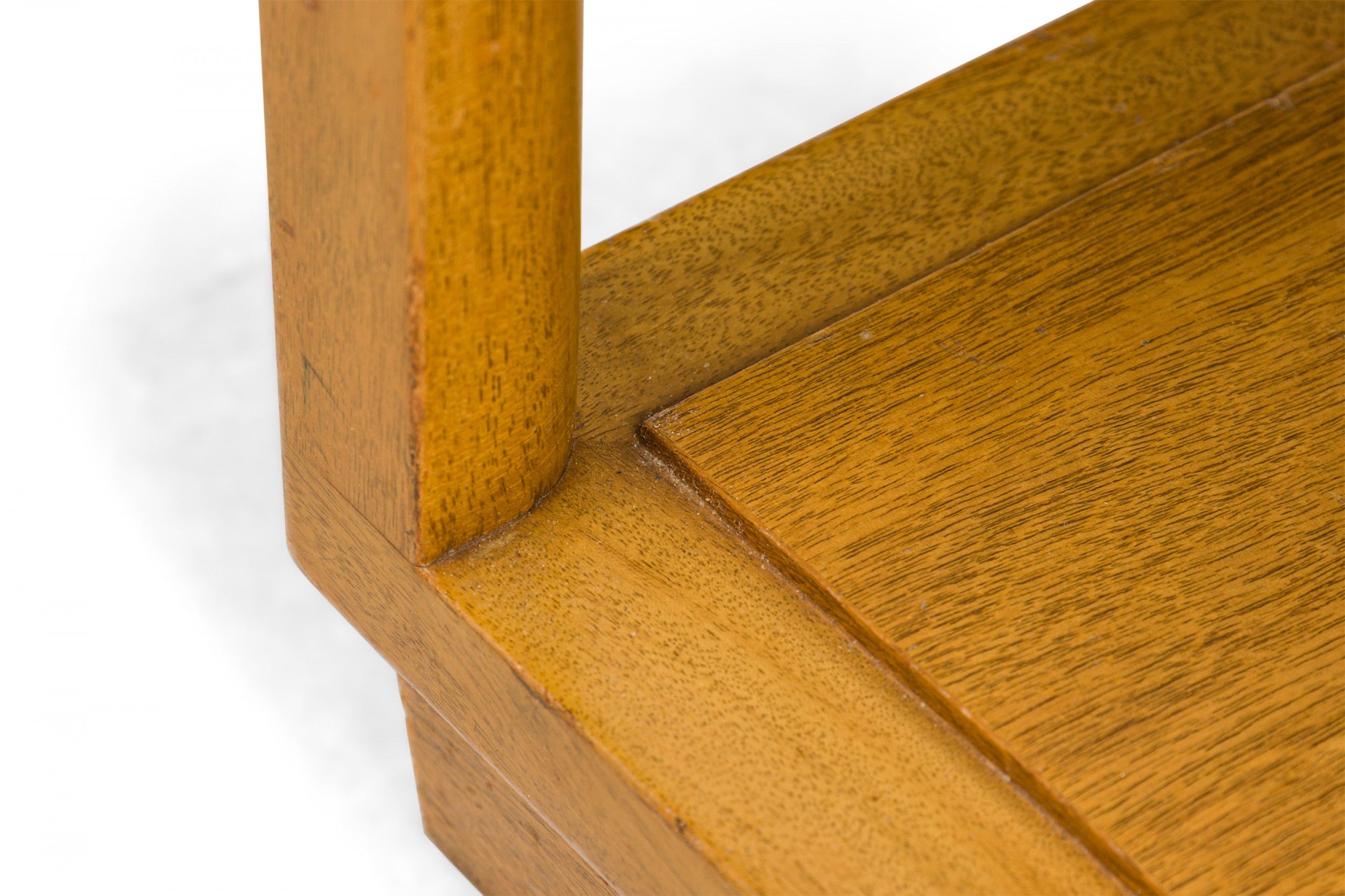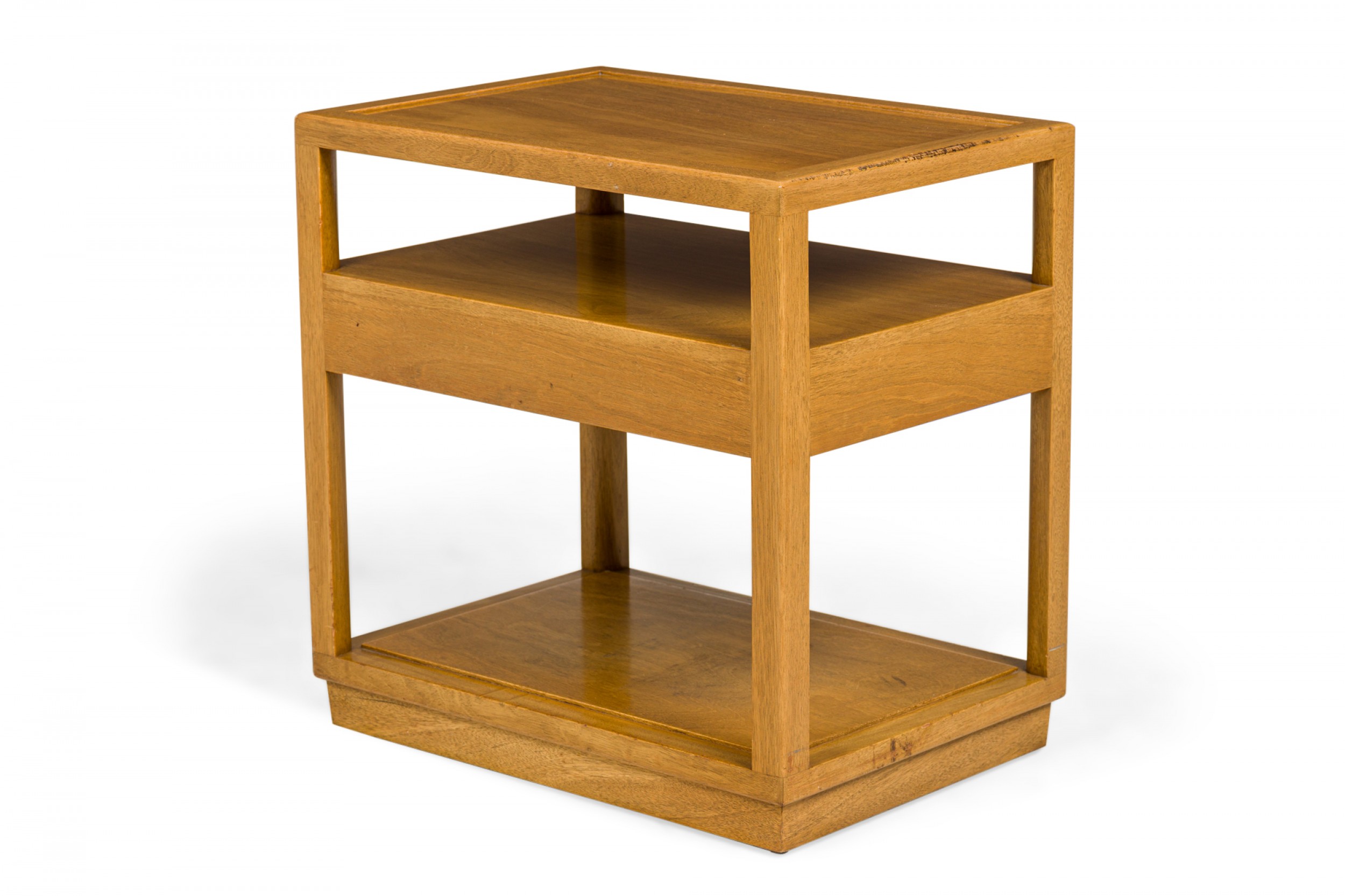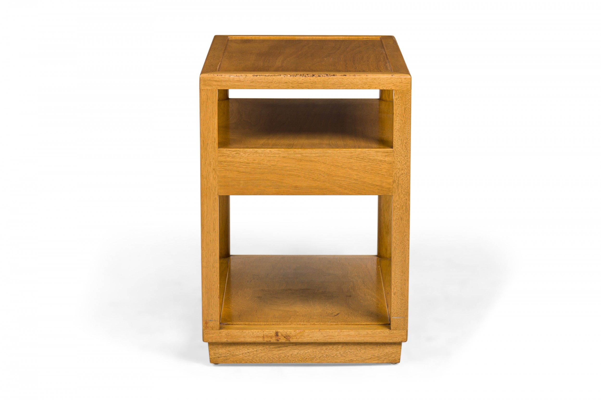 PAIR of American Mid-Century wooden end / side tables with a rectangular table top above an open shelf containing a single drawer below with a curved brass tab drawer pull, resting on a solid base creating another large open shelf. (EDWARD WORMLEY FOR DUNBAR FURNITURE COMPANY)(PRICED AS PAIR)
