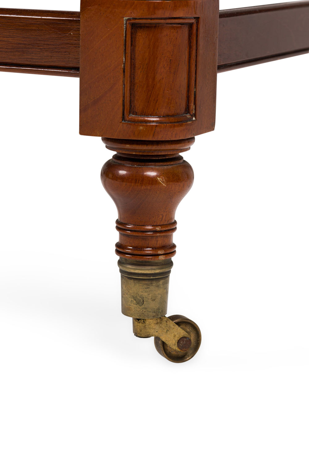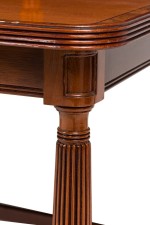 PAIR of English Sheraton style buffet / center tables with 3 tiers separated by turned and fluted column supports and ending with brass casters at the base (PRICED AS PAIR)