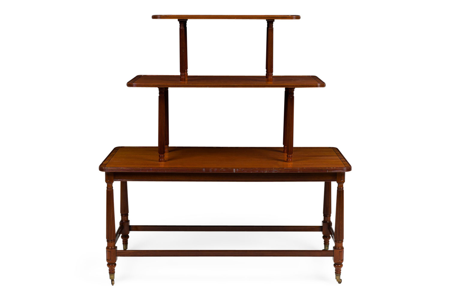 PAIR of English Sheraton style buffet / center tables with 3 tiers separated by turned and fluted column supports and ending with brass casters at the base (PRICED AS PAIR).