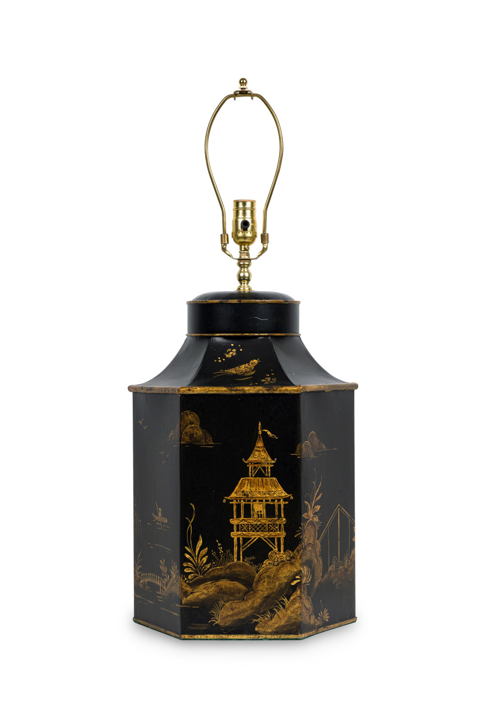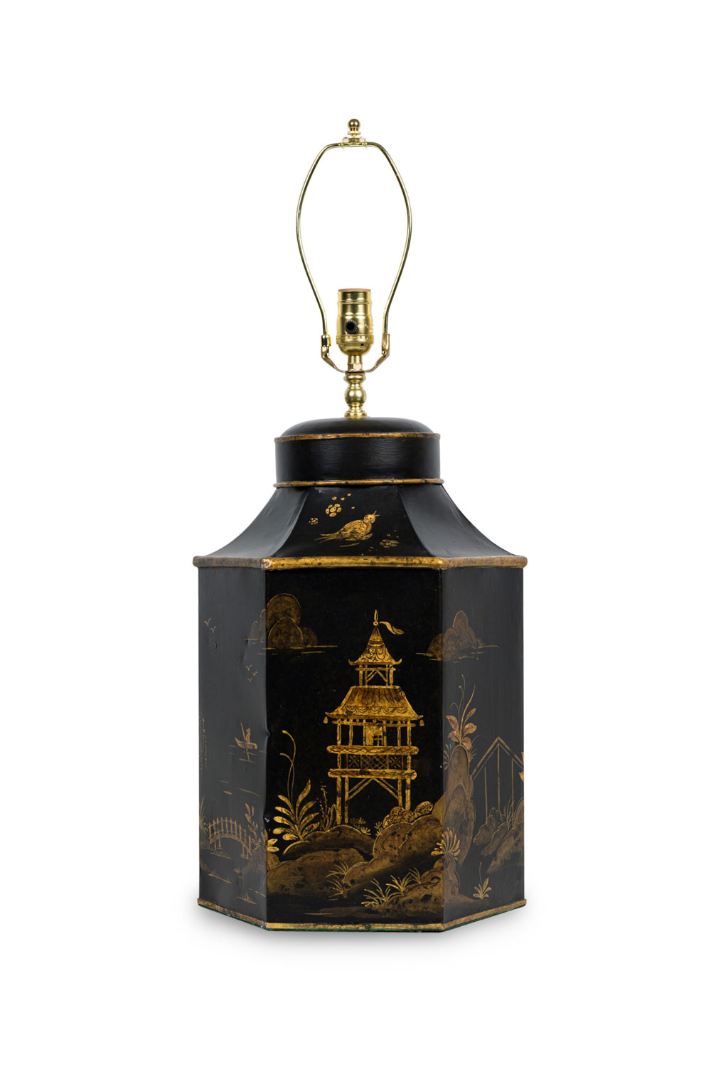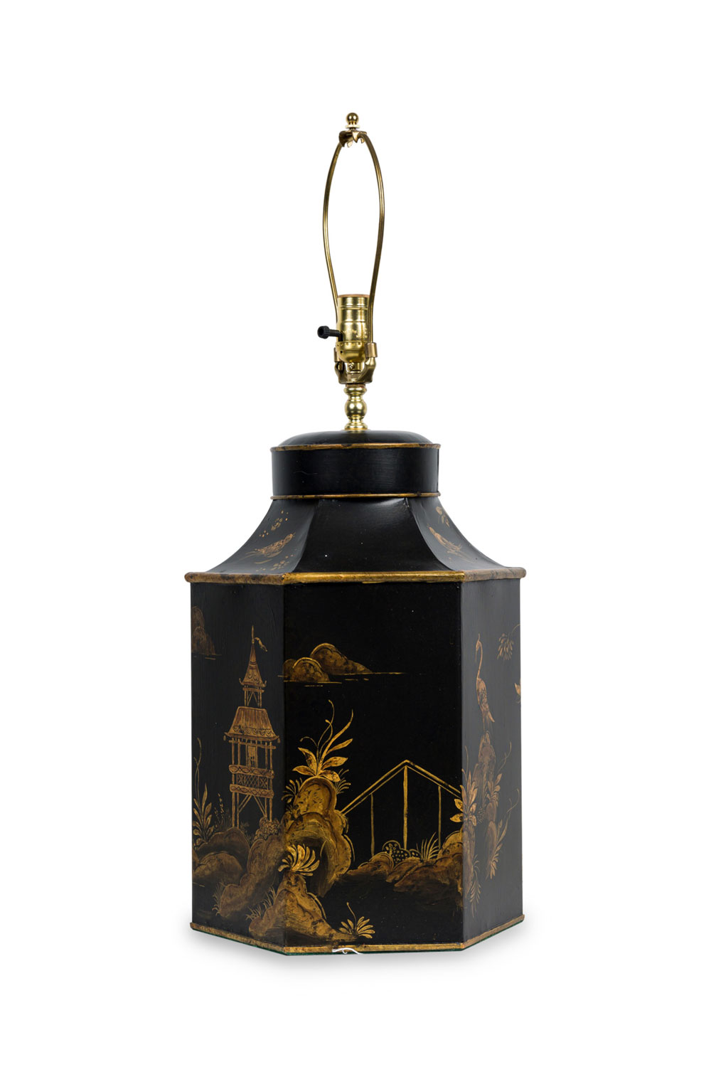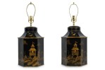 PAIR of English Regency style black and gold hexagonal shape table lamps with a chinoiseerie genre scene painted throughout (PRICED AS PAIR).