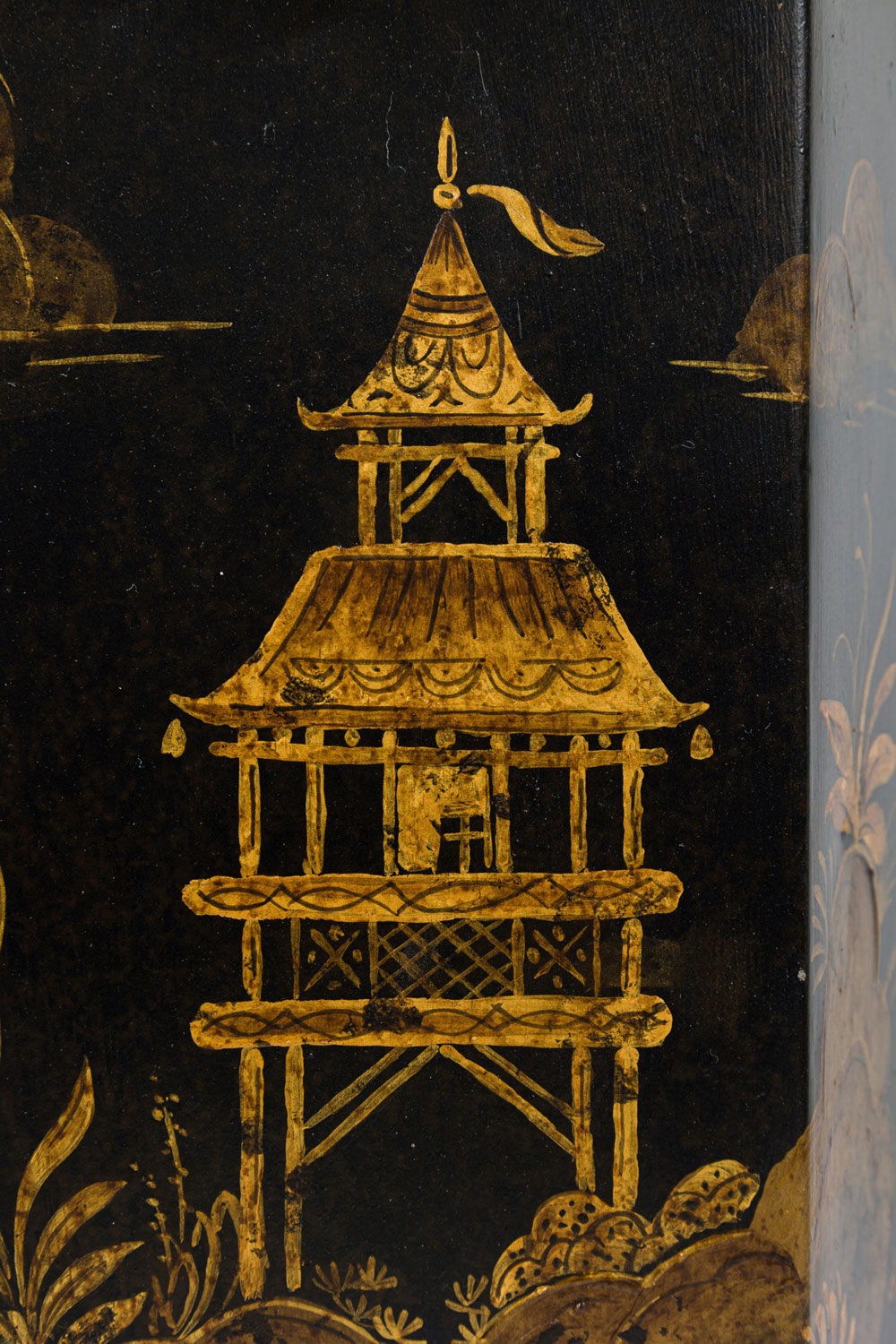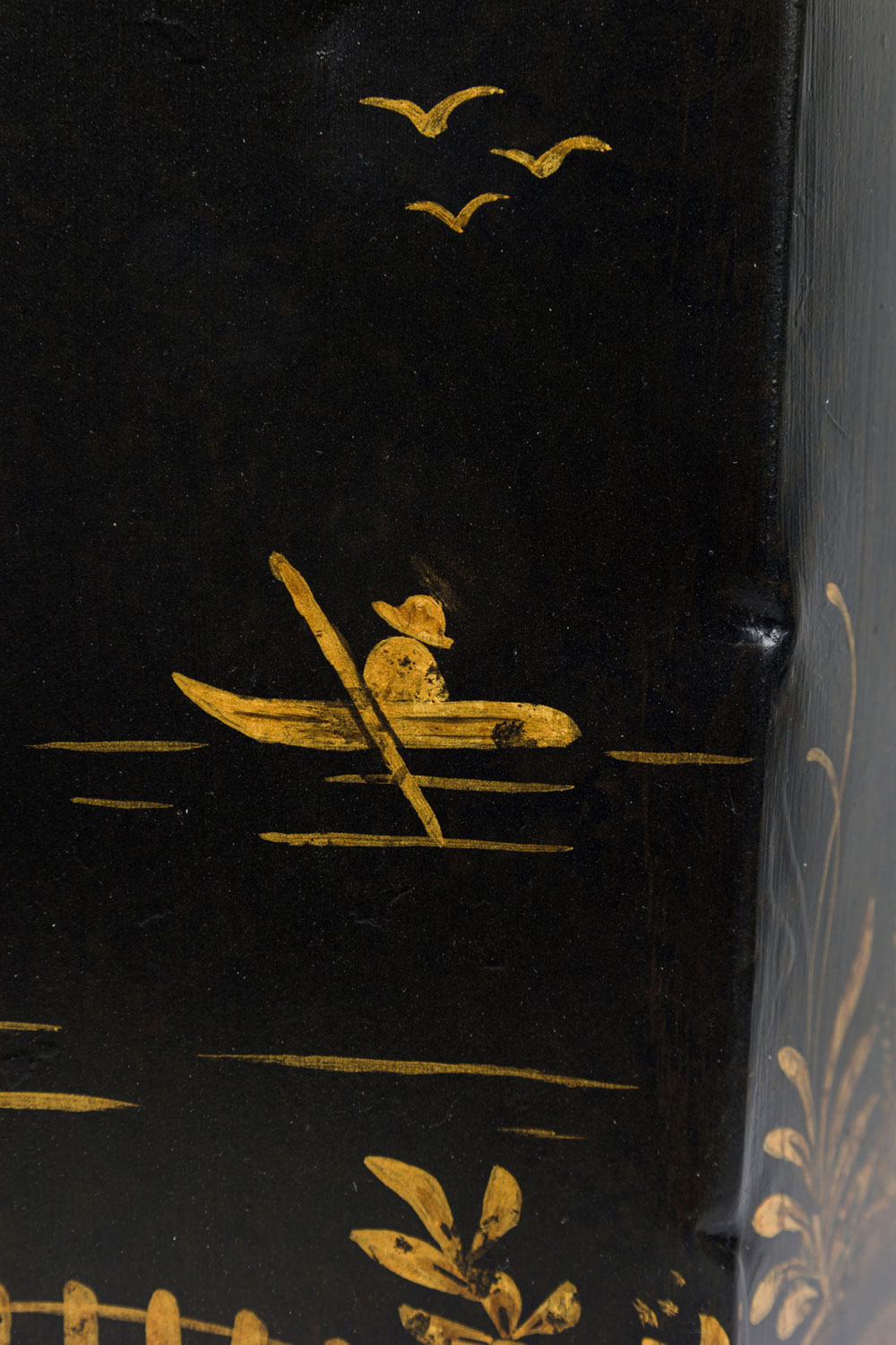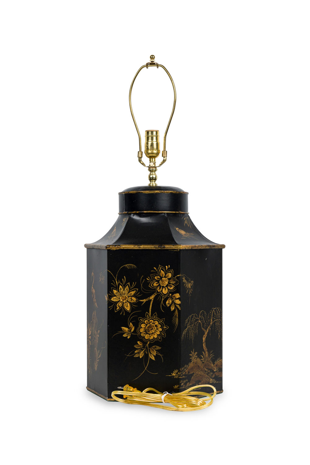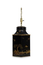 PAIR of English Regency style black and gold hexagonal shape table lamps with a chinoiseerie genre scene painted throughout (PRICED AS PAIR).