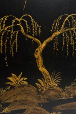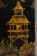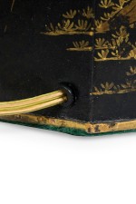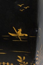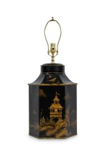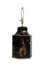 PAIR of English Regency style black and gold hexagonal shape table lamps with a chinoiseerie genre scene painted throughout (PRICED AS PAIR)