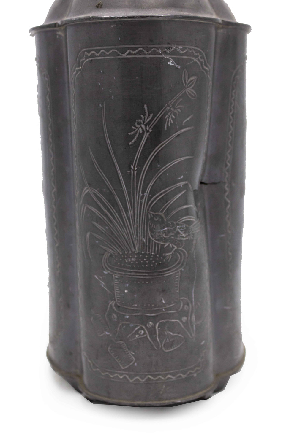PAIR of English Renaissance style pewter etched floral design tea caddy vases (20th Cent) (PRICED AS PAIR)