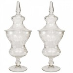 PAIR of English Victorian (19th Cent) crystal (possibly Waterford) urns with a shaped base under a cover with a finial top. (PRICED AS PAIR).