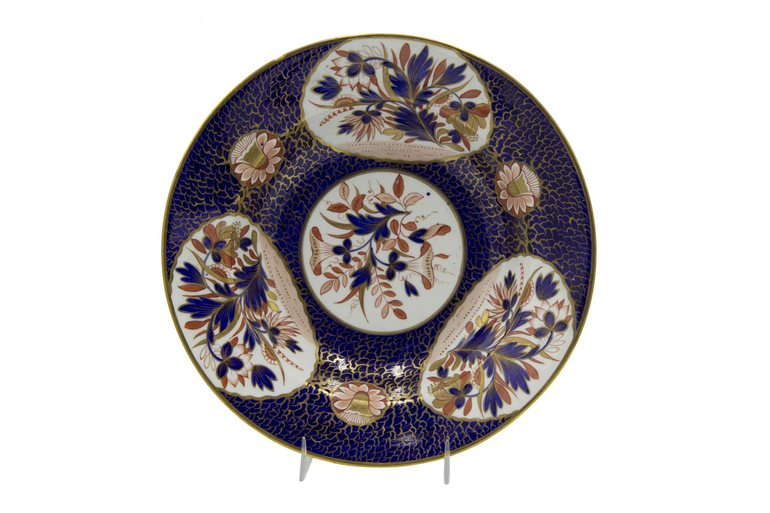 PAIR of English Victorian blue porcelain soup bowls with 4 floral red, white, and blue panels (Crown Derby) (PRICED AS PAIR)