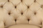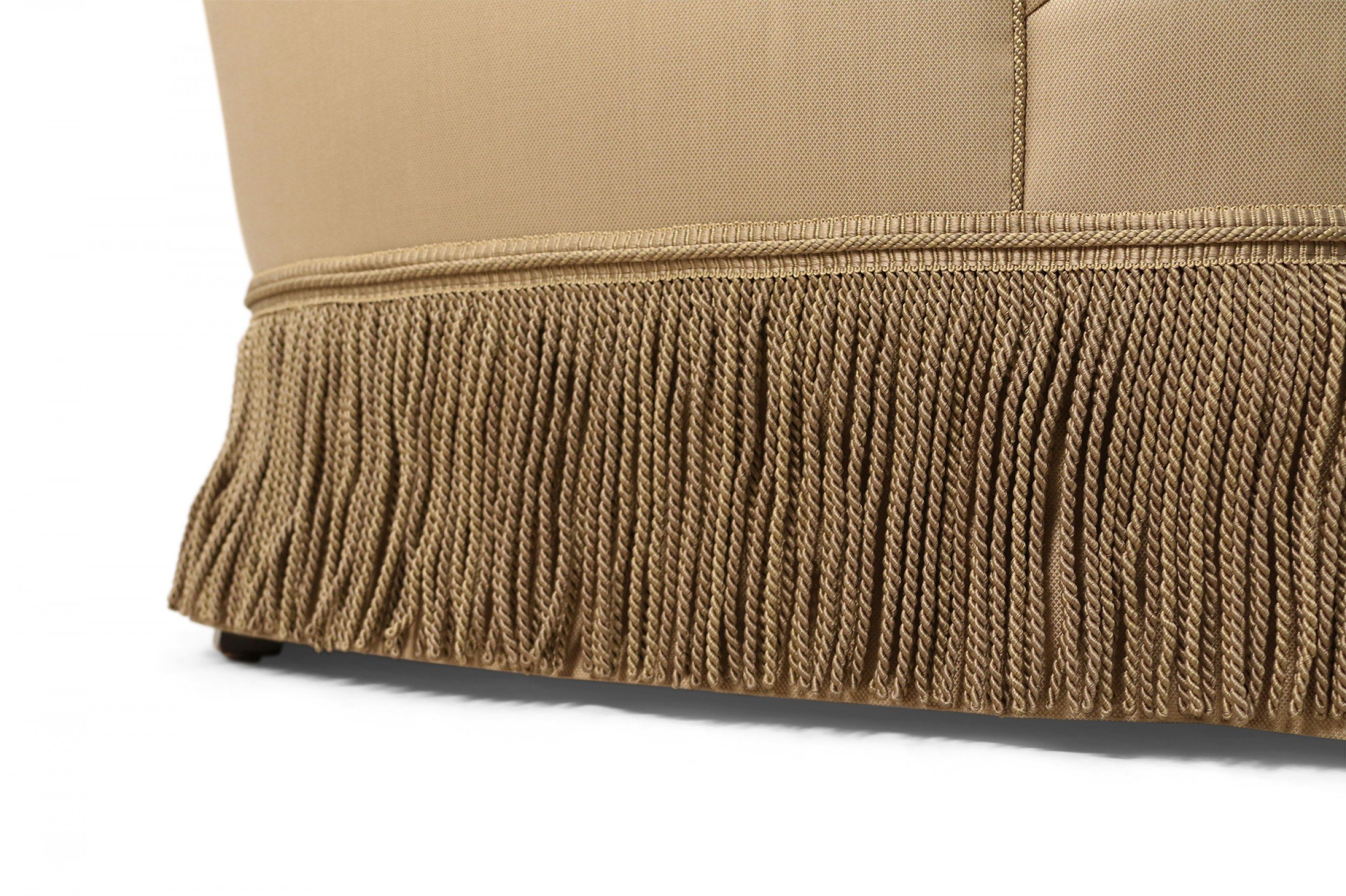 English Victorian-style beige tufted upholstered tub armchair with gold fringe around the base